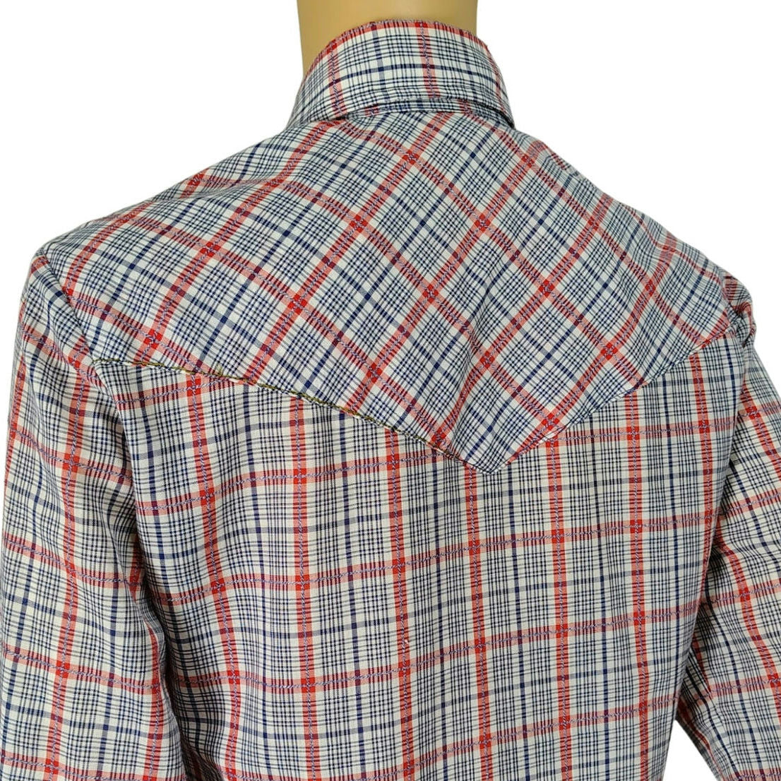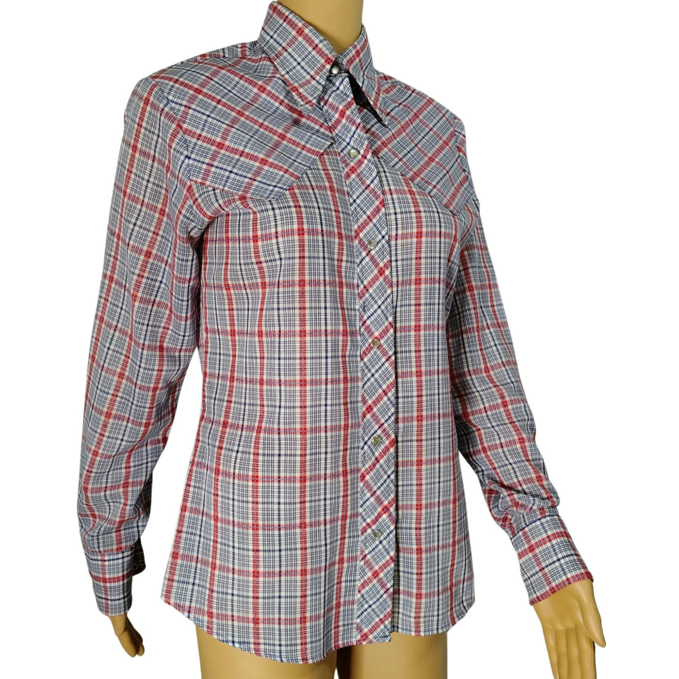 1960s Levis Plaid Embroidered Western Cowgirl Long Sleeve Button Up Shirt. Marbled blue and white stitching on red white and blue printed design. V on back of yoke. Pearl snap buttons, two on each wrist cuff plus six rib down the front. Fold down wing tip collar.