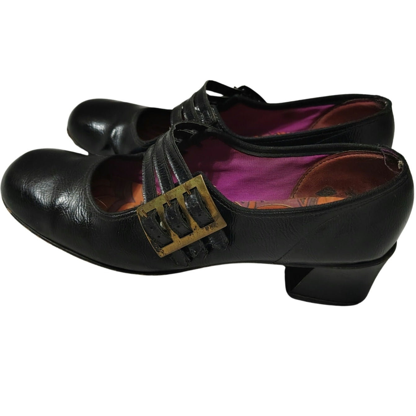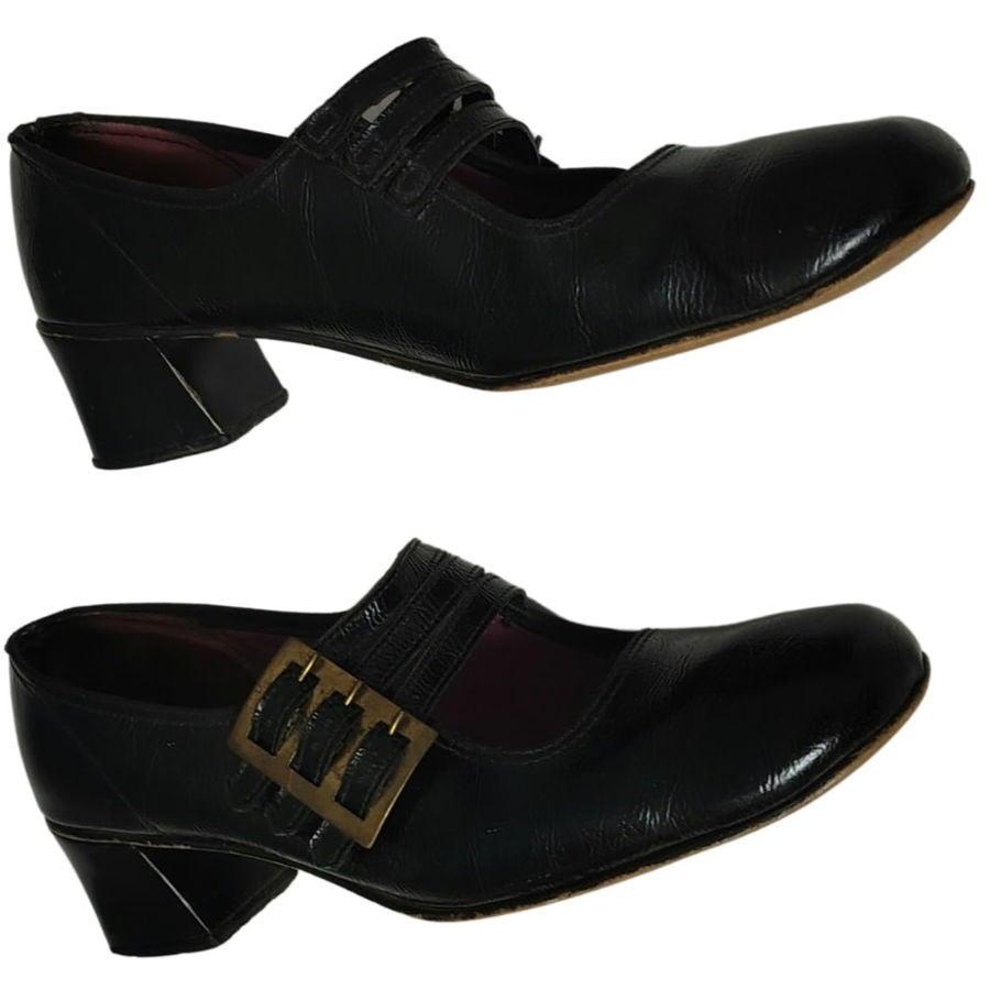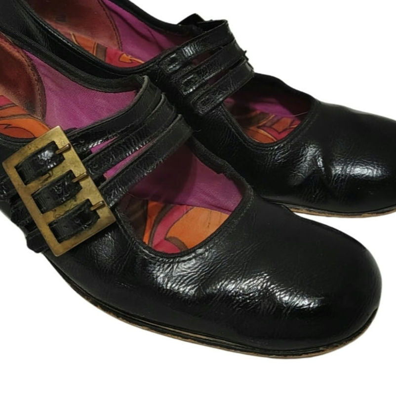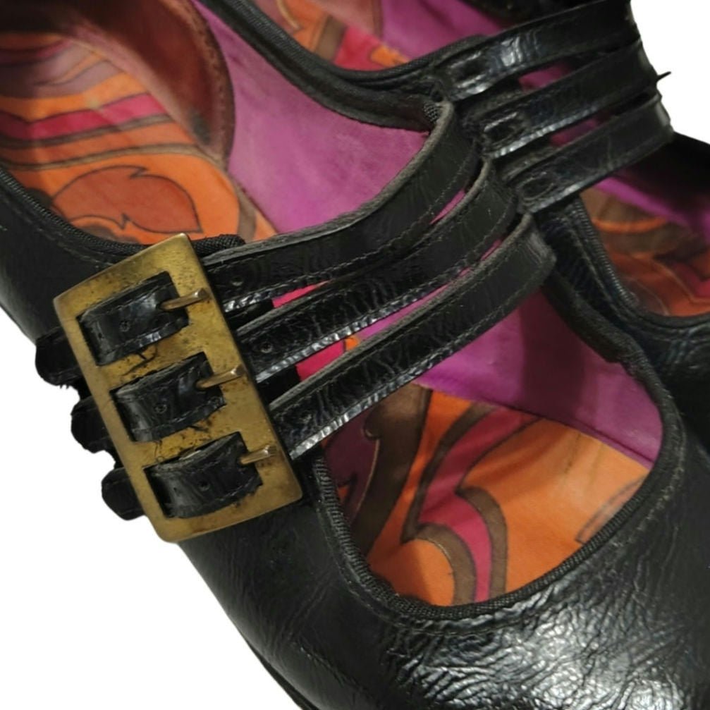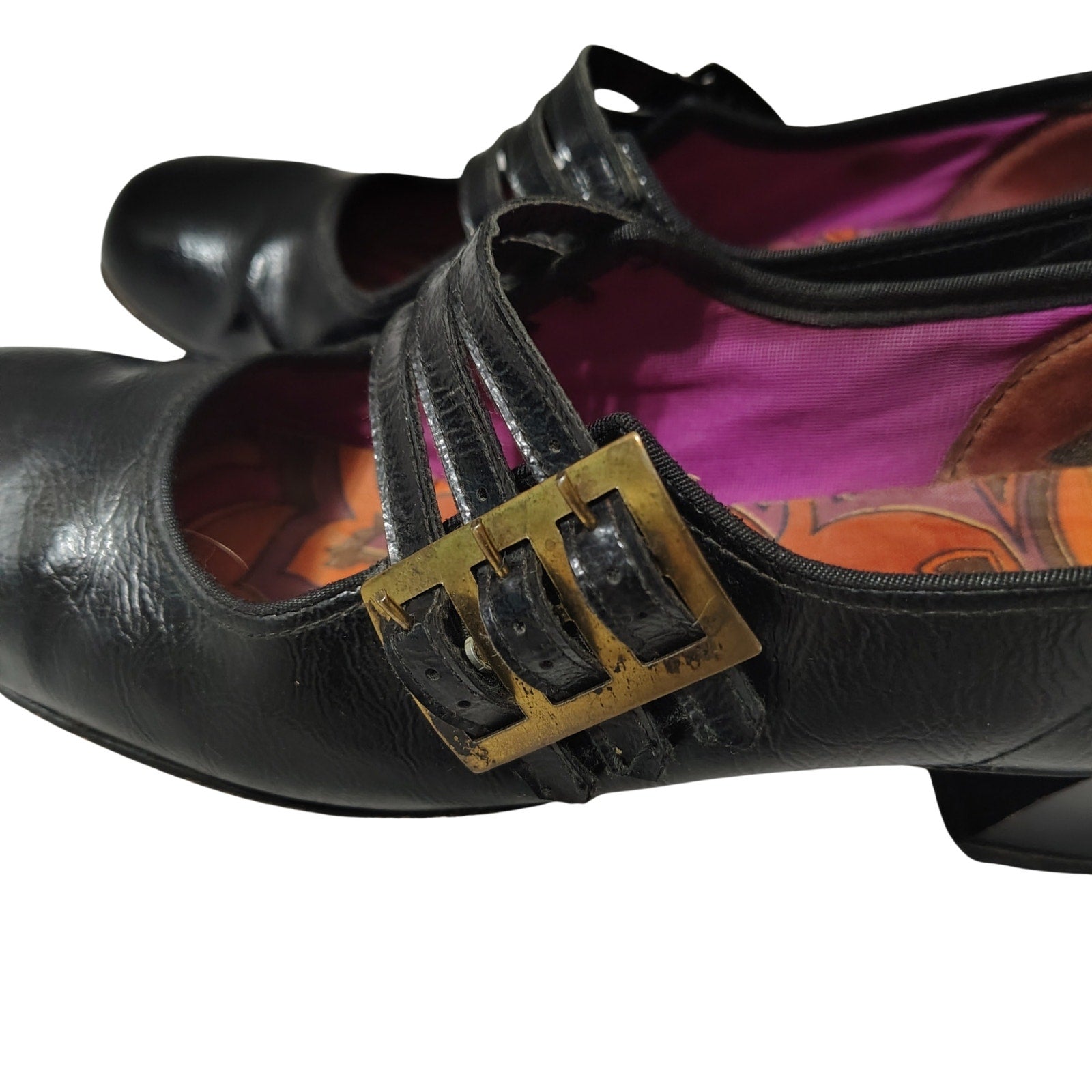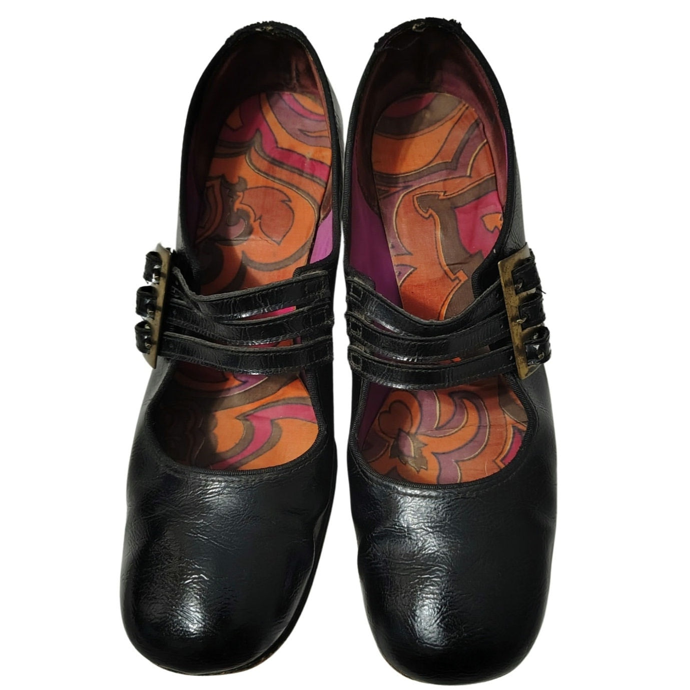 60s Mary Janes Black Leather Square Toe Block Heel Womens Shoes Vintage Footwear. Three leather straps fasten across top of the foot with metal buckle closure. G Fully lined with 60s abstract graphic inside lining design.