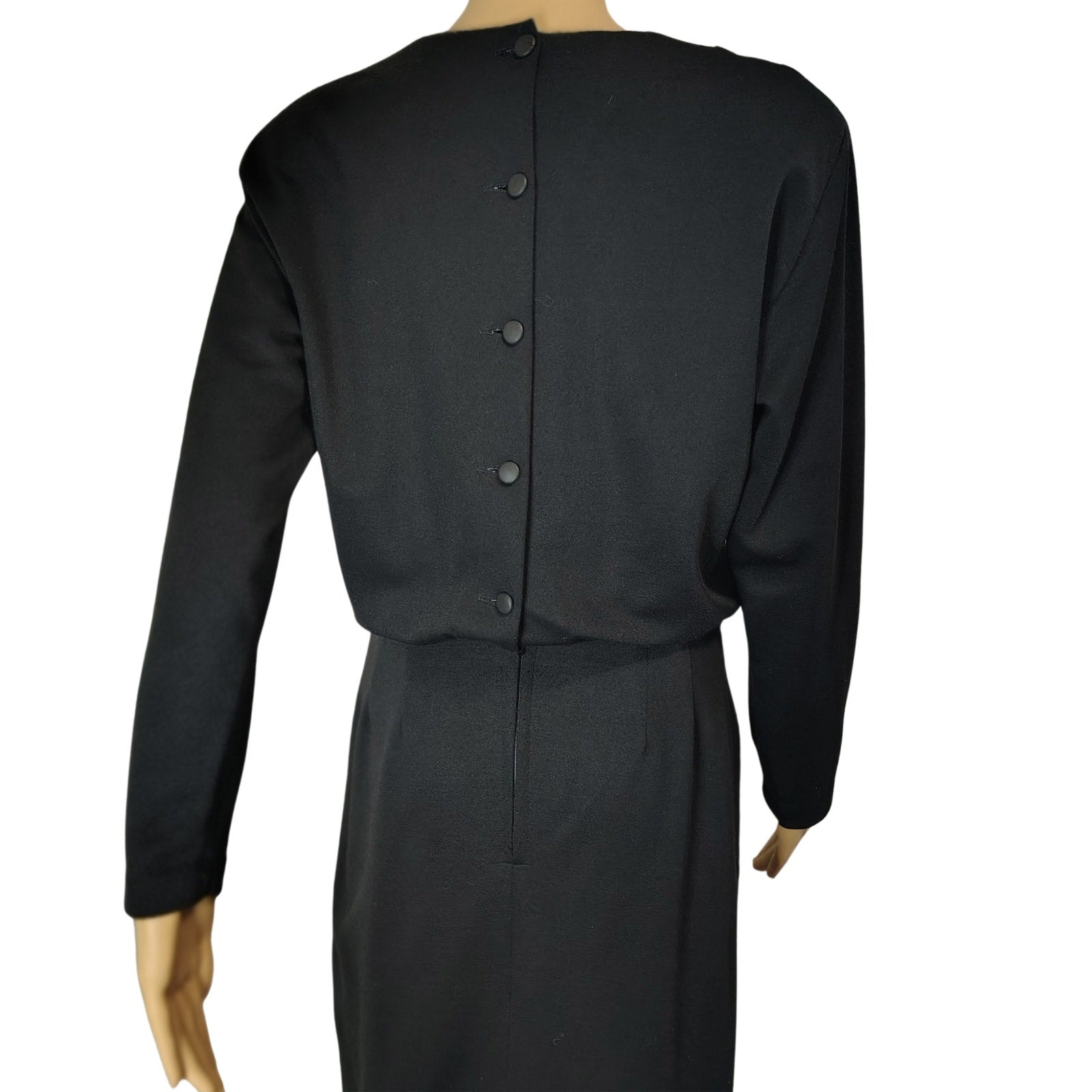 1960s Mod MCM Black Long Sleeve High Neck Pencil Skirt Dress Back Buttons Shoulder Pads Size Small