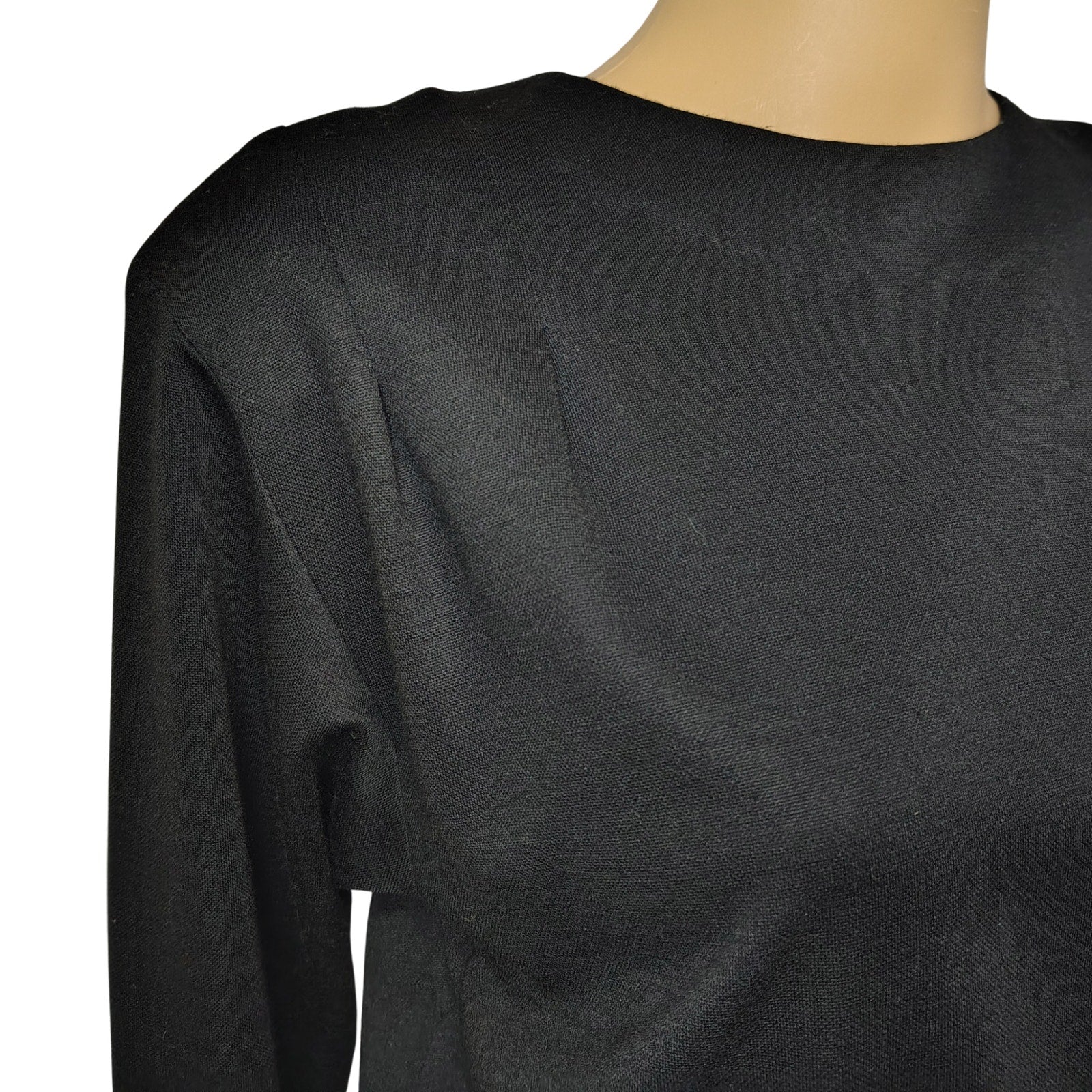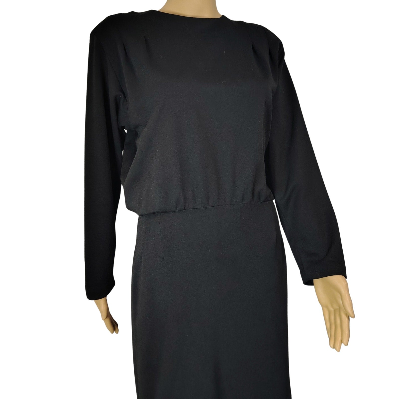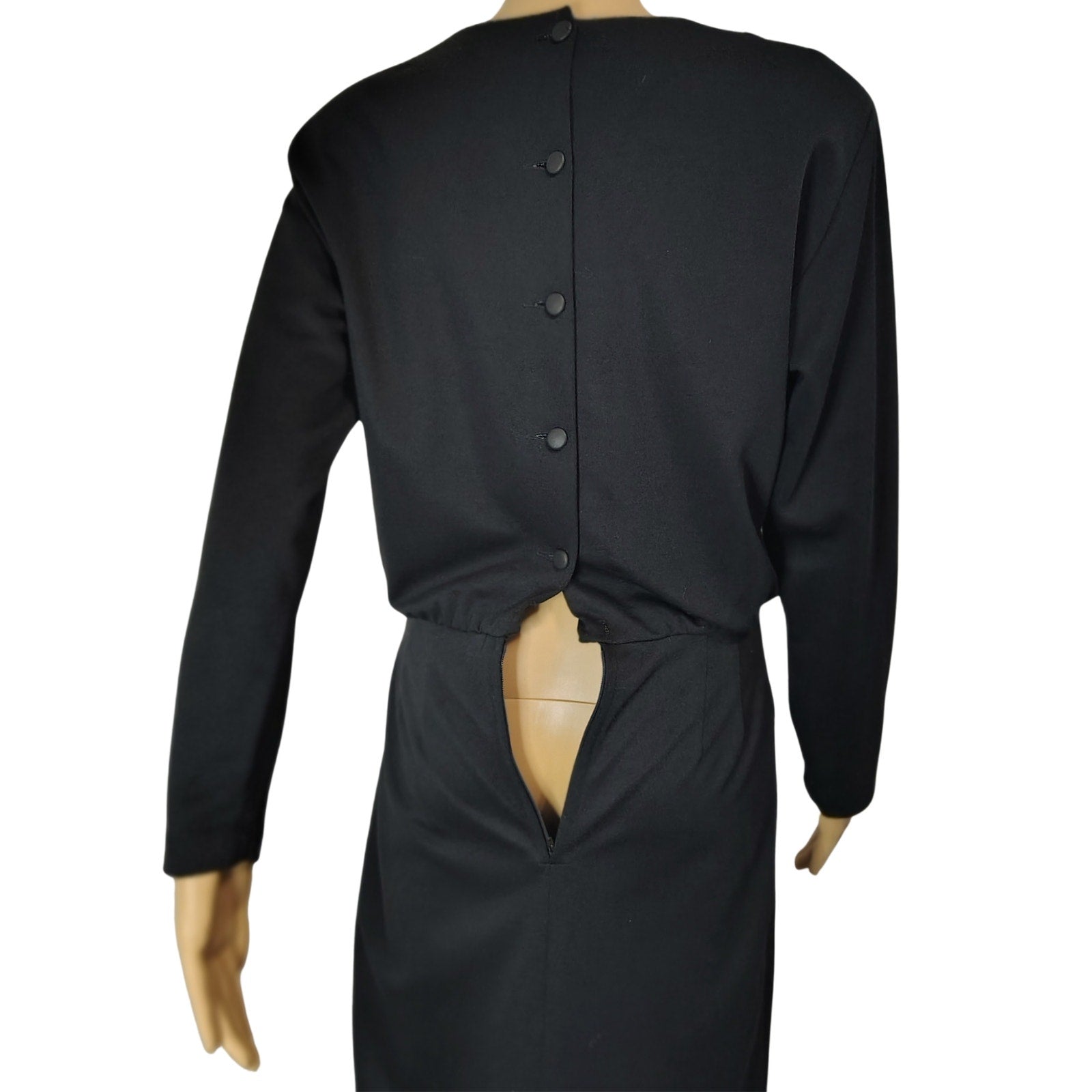1960s Mod MCM Black Long Sleeve High Neck Pencil Skirt Dress Back Buttons Shoulder Pads. Buttons n back and zips at the waist with eye & hook closure. Dolman long sleeves with pleats on the shoulders. Split in back.
