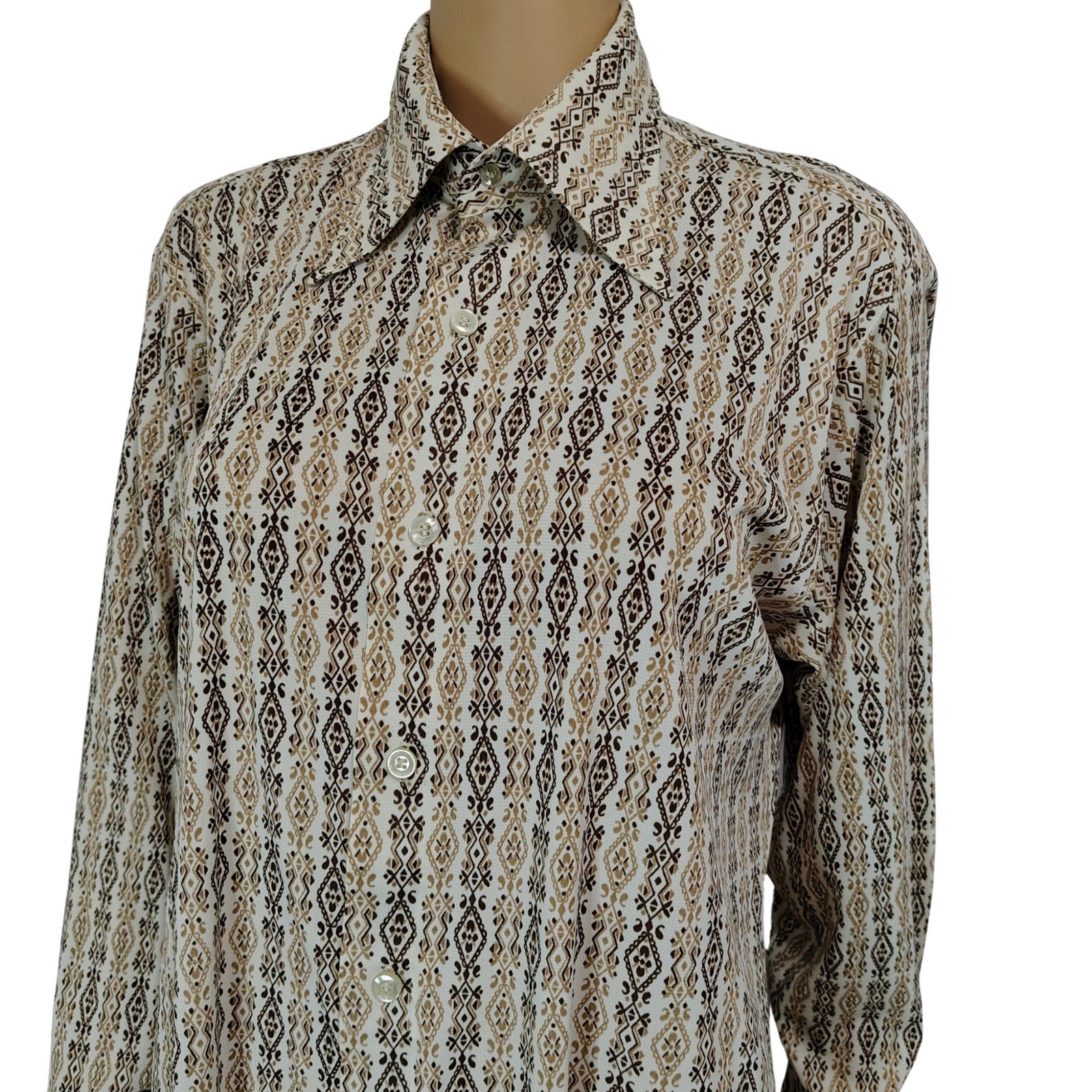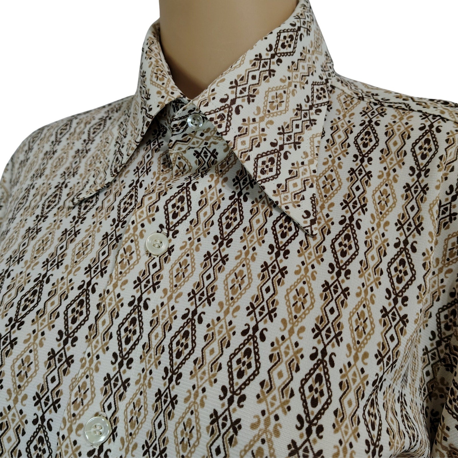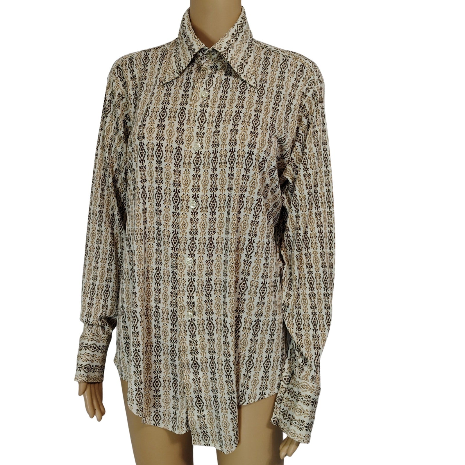 1970s Brown Beige Disco Collar Button Up. Butterfly collar shirt with geometric diamond designs. Six opalescent plastic buttons run up the front. Two similar buttons on each wrist cuff. Feels so soft. Rounded hemline. Two inch folded collar