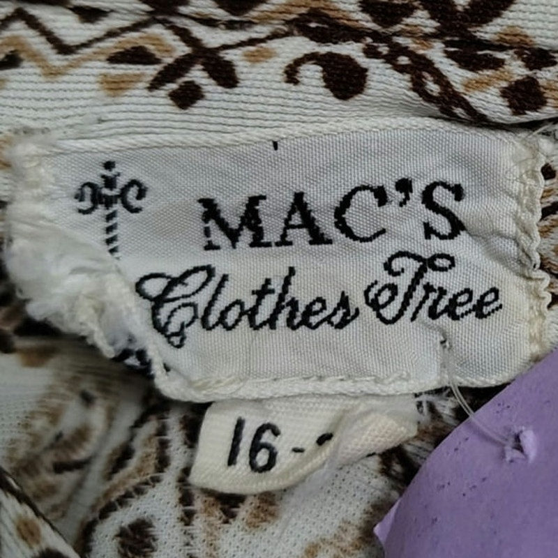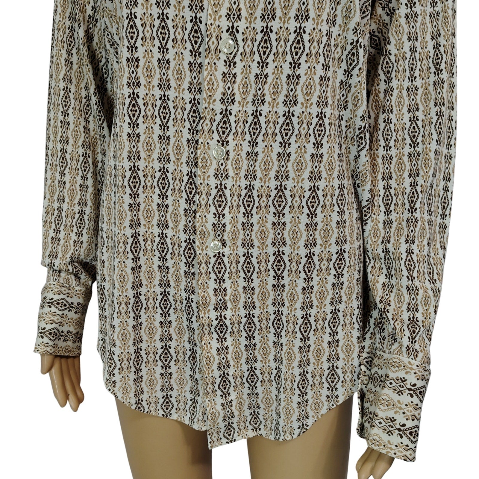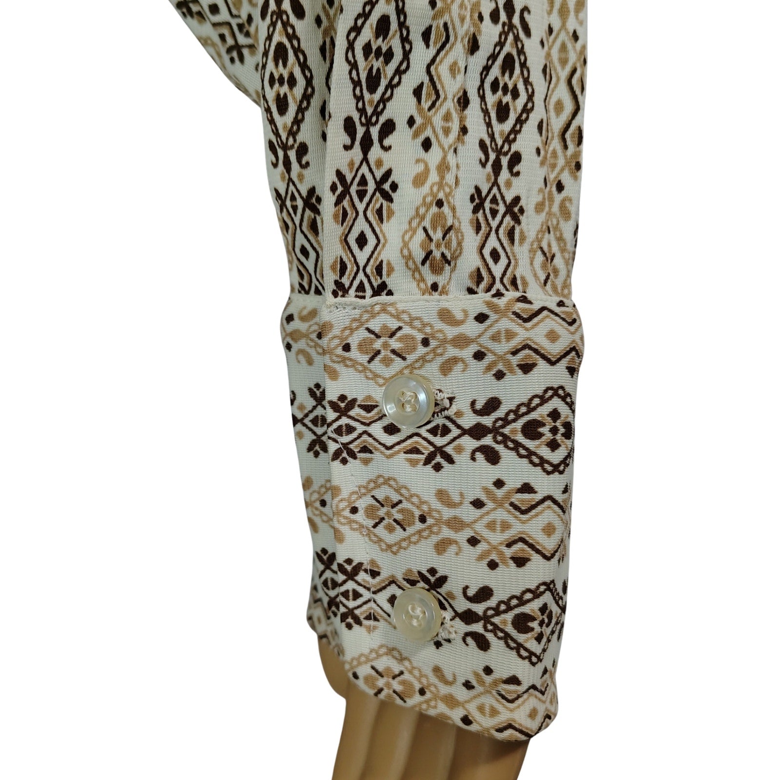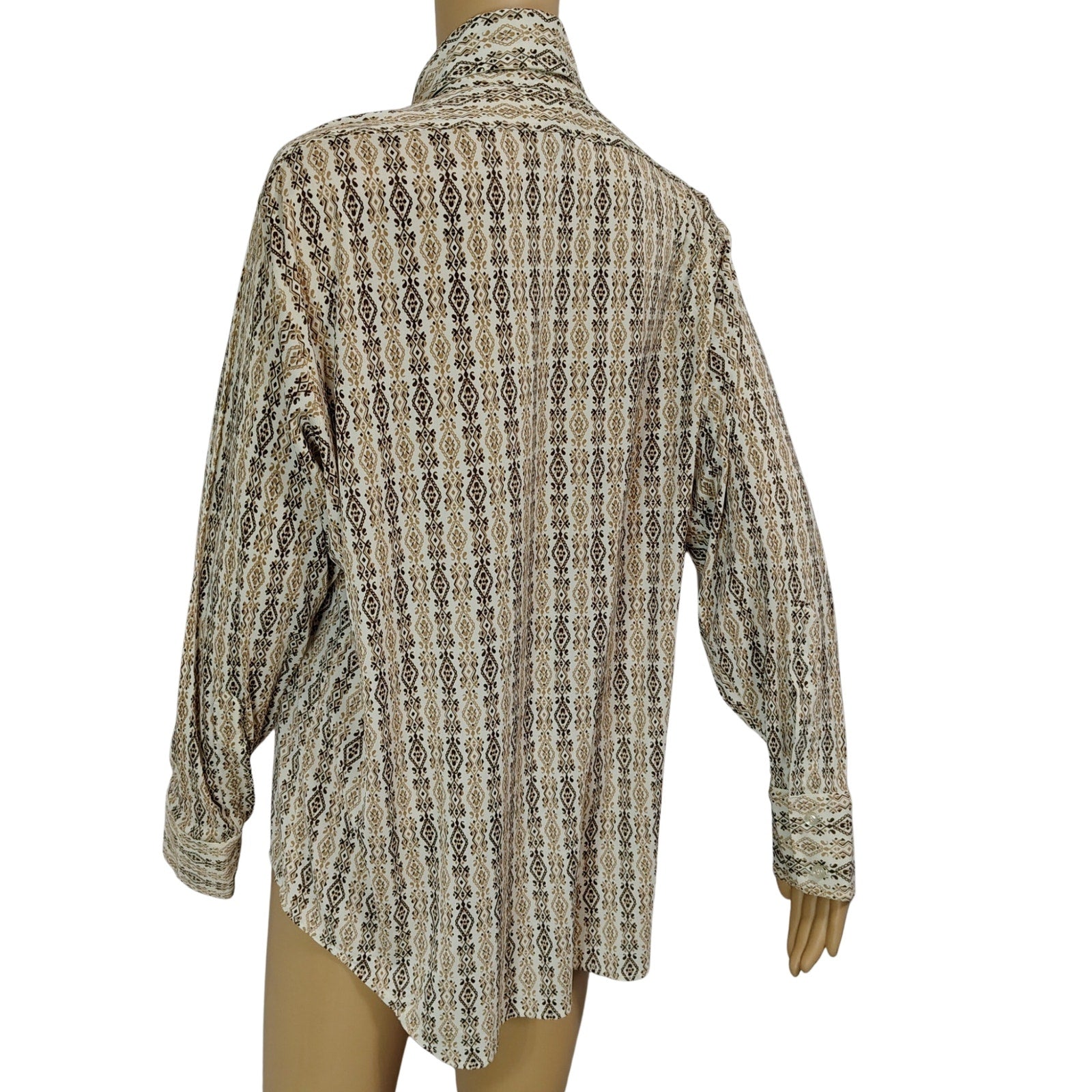 1970s Brown Beige Disco Collar Button Up. Butterfly collar shirt with geometric diamond designs. Six opalescent plastic buttons run up the front. Two similar buttons on each wrist cuff. Feels so soft. Rounded hemline. Two inch folded collar