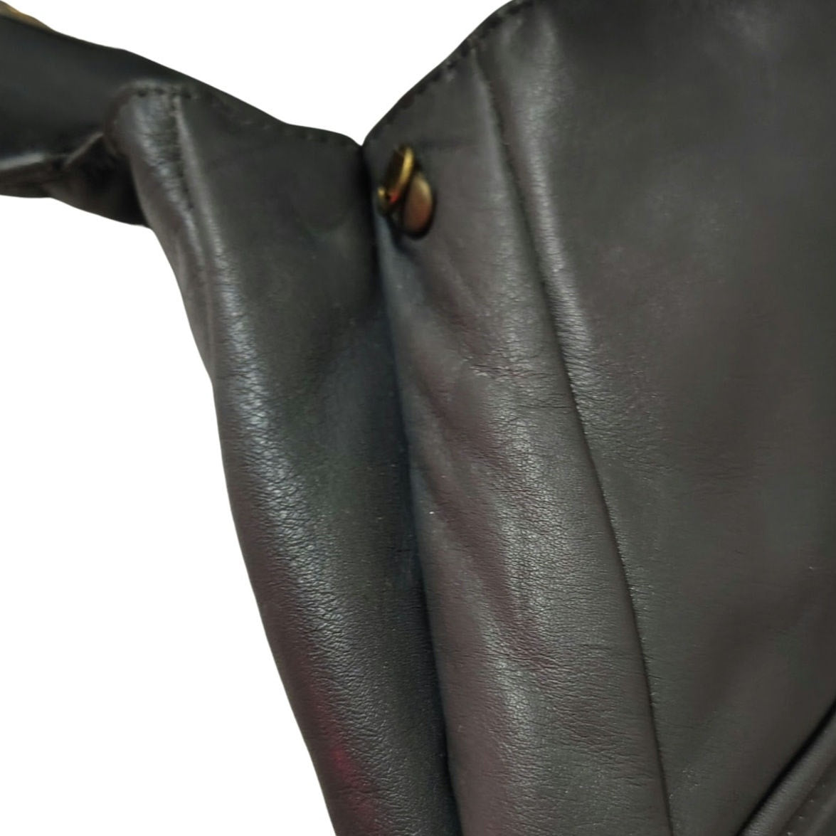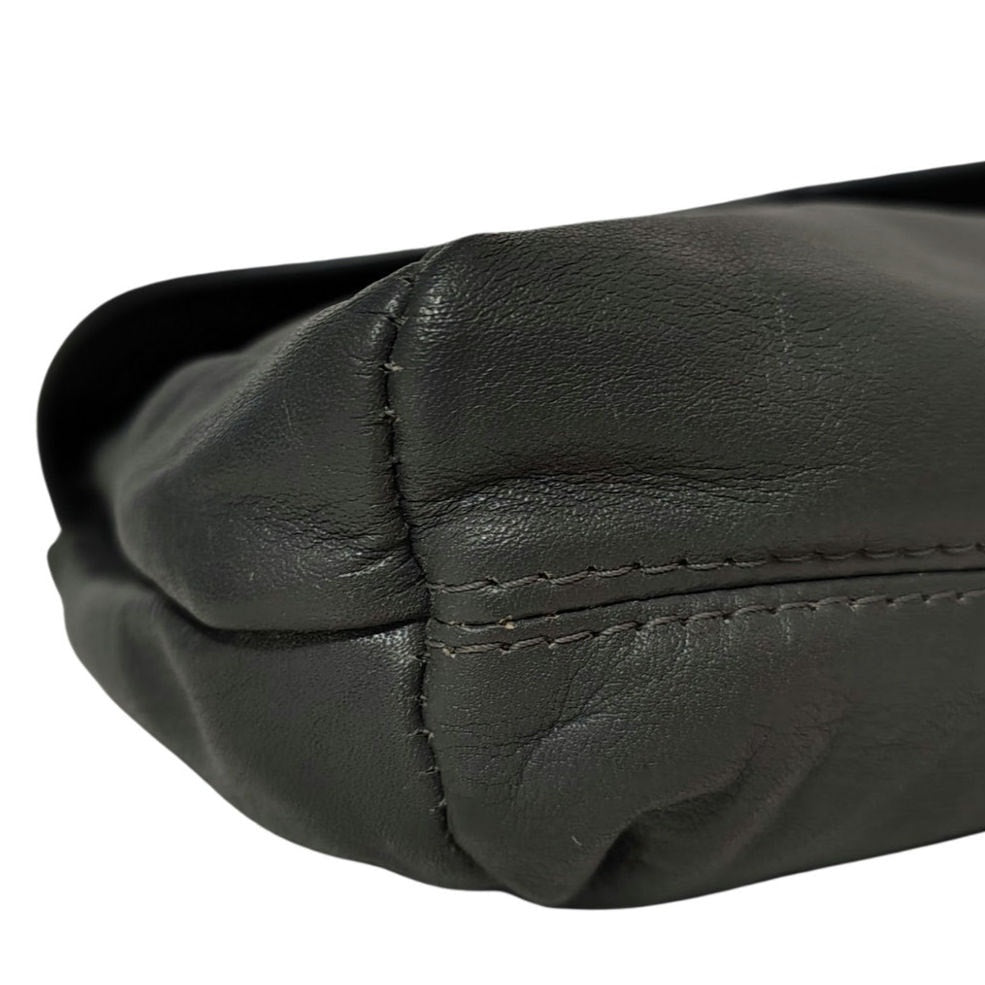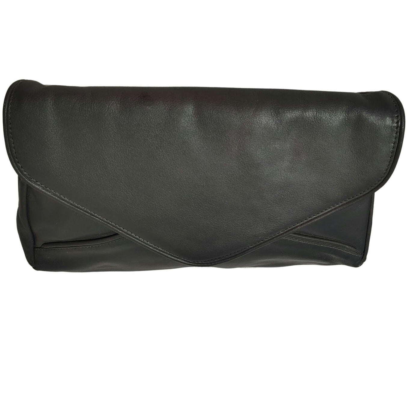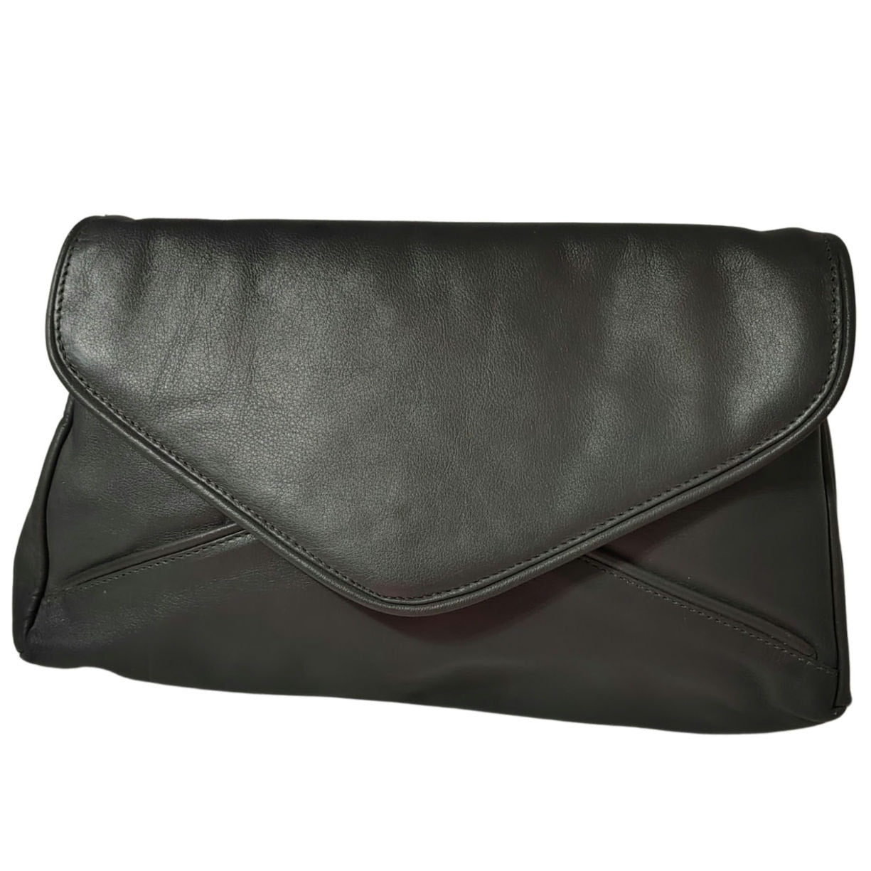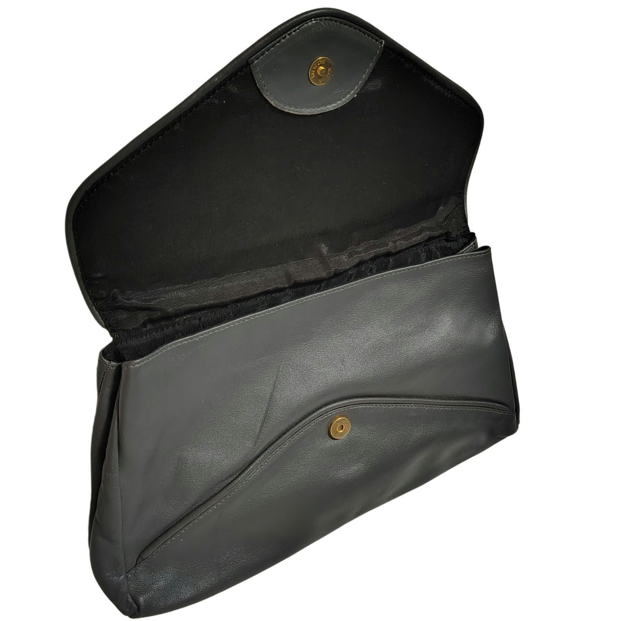 70s Gray Maxi Clutch Faux Leather Fold Over Closure Magnetic Clasp Two Compartments. Pointed flap. Seam detail with patchwork design throughout. Zippered pocket inside one compartment. Shoulder strap hooks on outside sides. Graduating width from top to bottom.