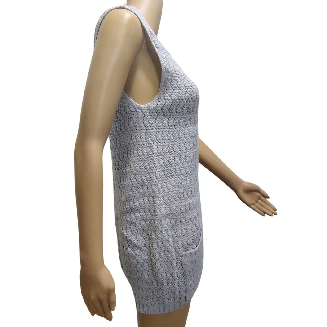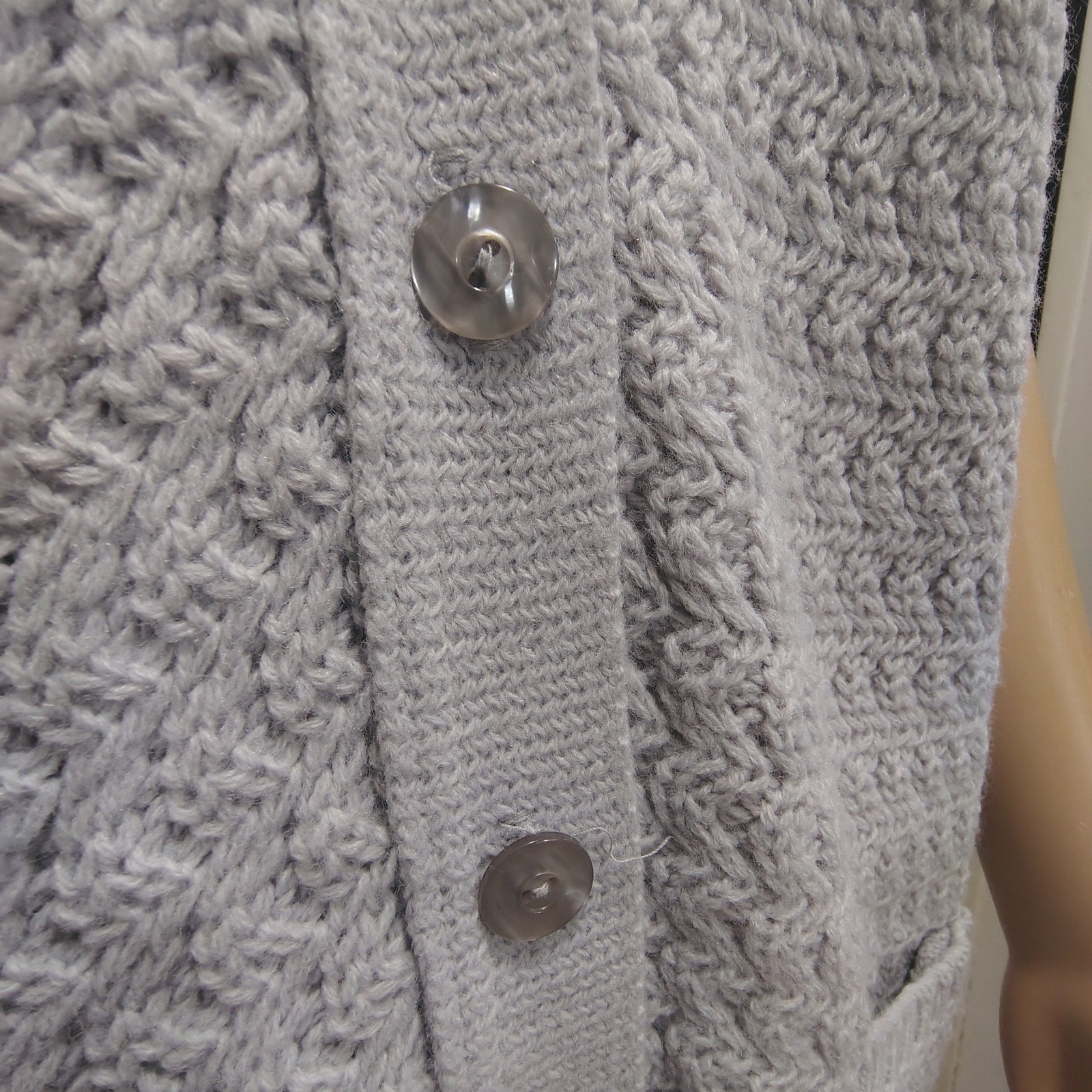 70s Gray Long Sweater Vest Knit Acrylic Cardigan Button Up Boho Style. Sleeveless with a V neckline. Trimmed edges. Two square unsecured top loading pockets over each hip. Five faux Pearl buttons down front.