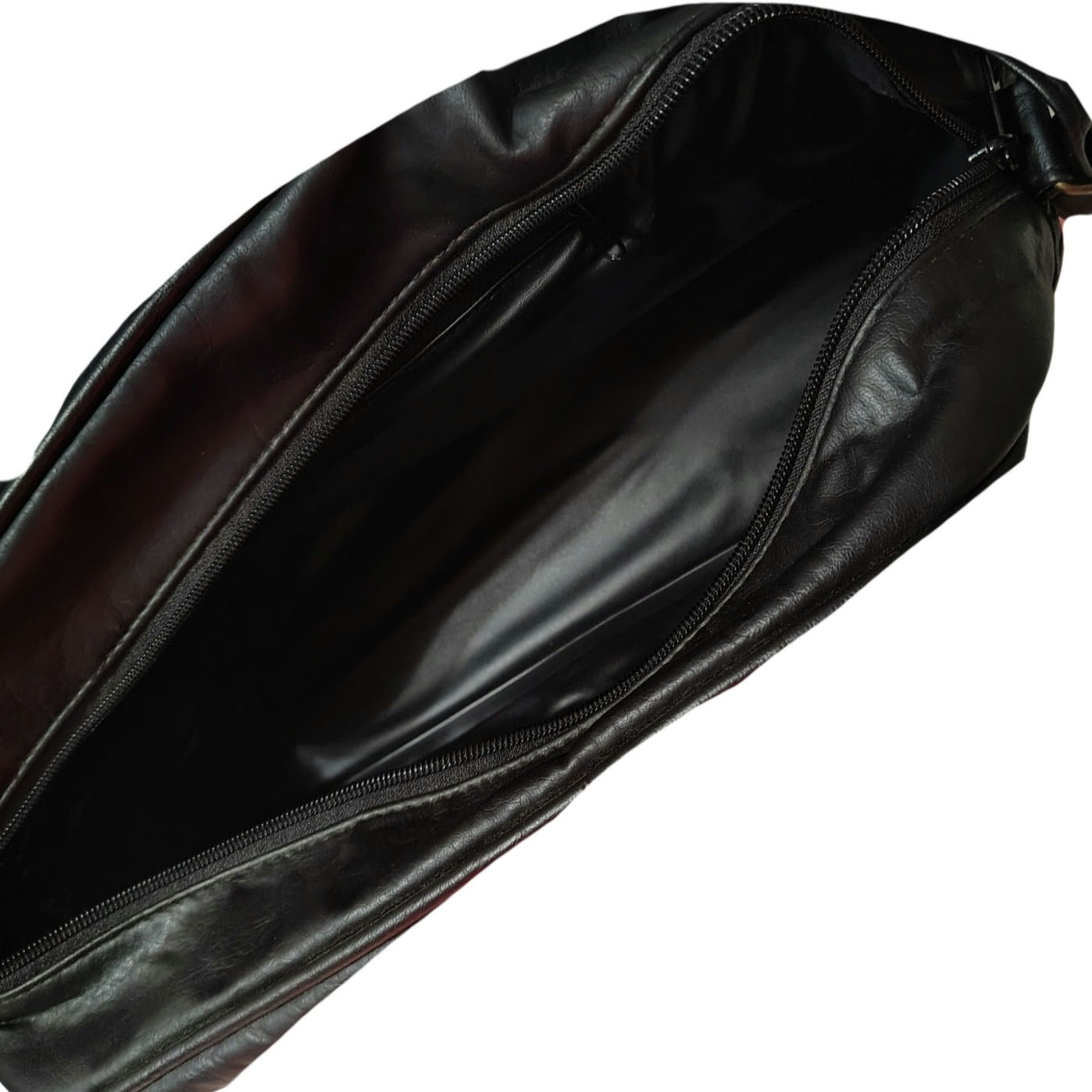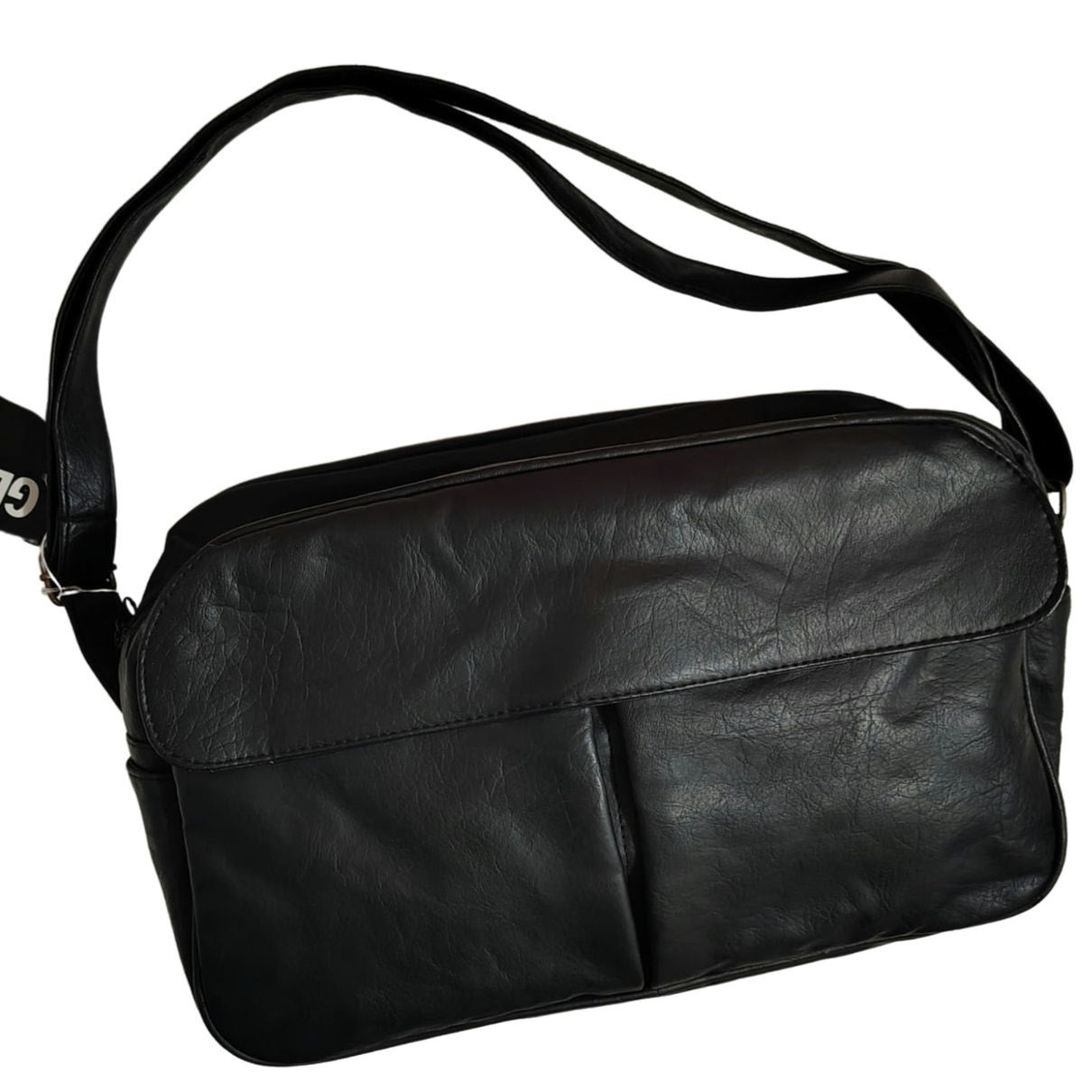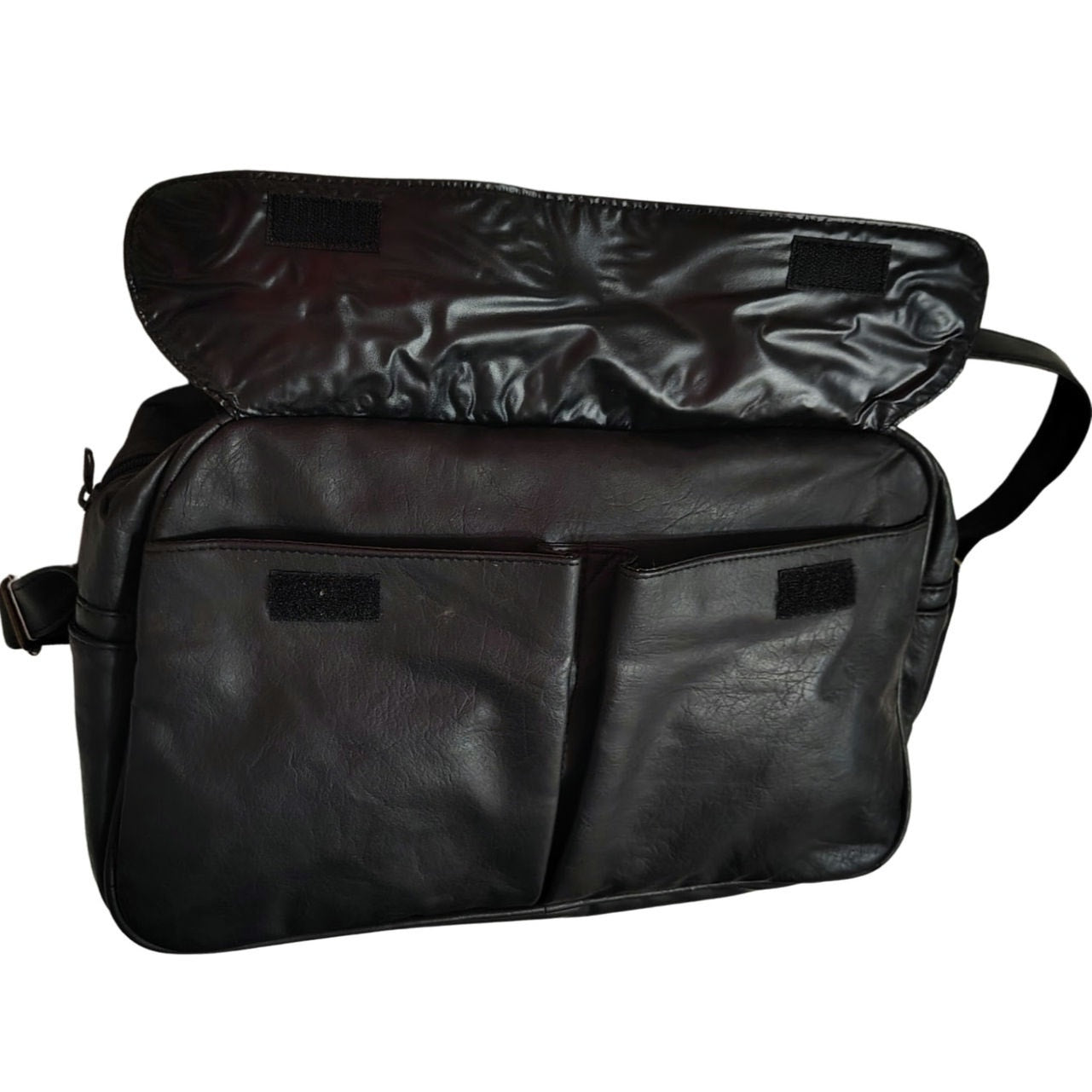 80s Black Faux Leather Crossbody Tote with Adjustable Hook Loop Closures. Two large outside pockets both secure with one large fold over flap and hook & loop closures on one side. On opposite side one large pocket secures with a hidden hook & loop closure. Adjustable shoulder strap. Zipper top closure. Large inside zipper secured pocket. Lined with plastic. Bottom insert included.