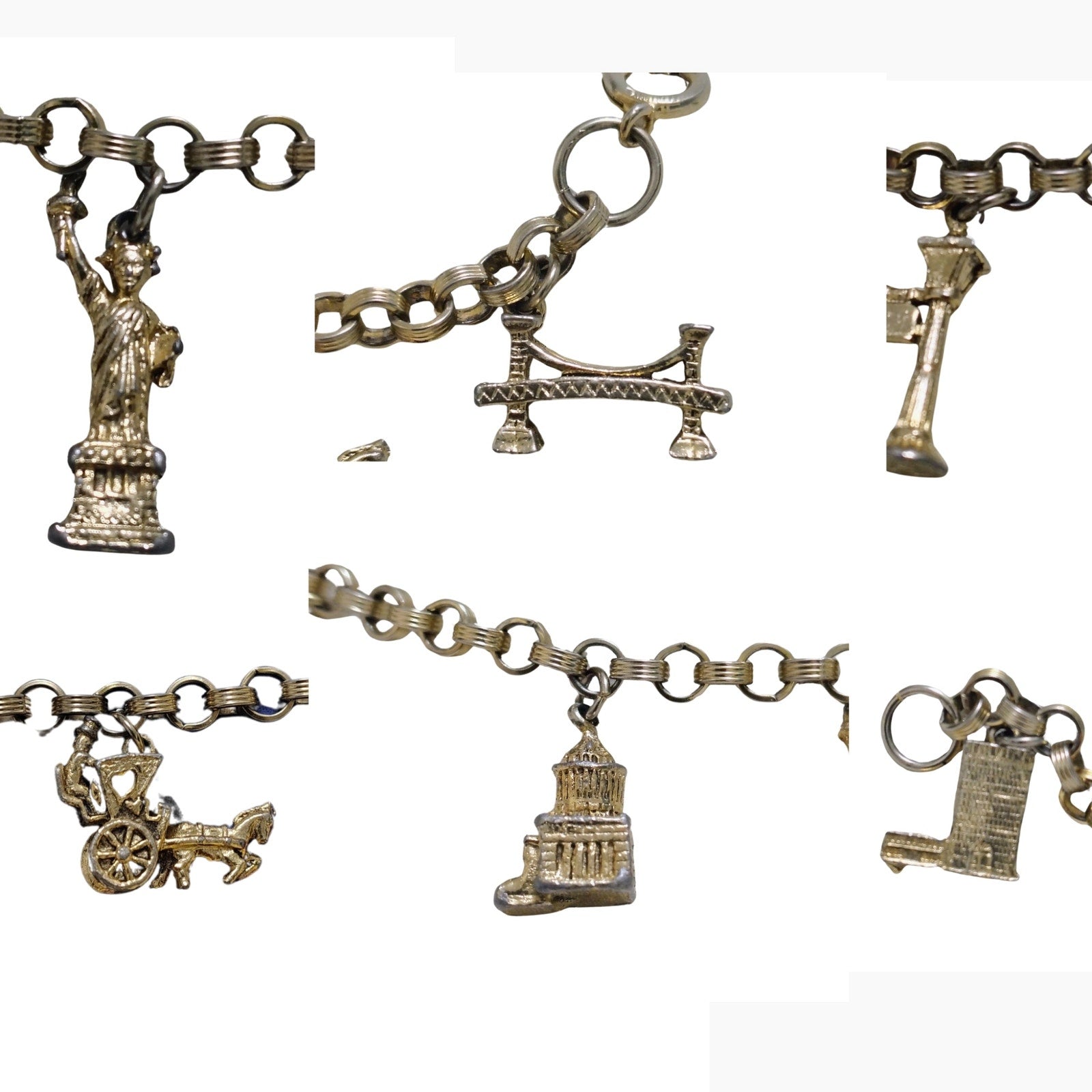 80s Charms Bracelet New York City Landmark Statue of Liberty Silver Tone Links