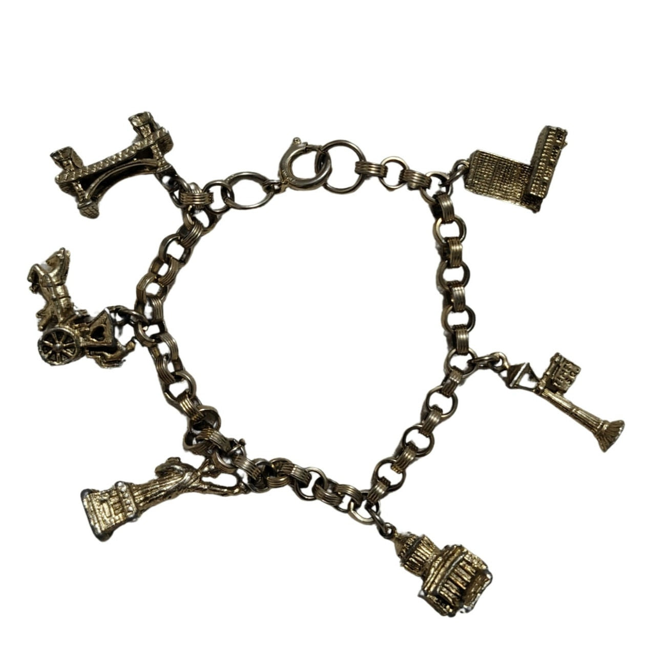 80s Vintage charm bracelet with New York landmark charms. This NYC theme of charms includes a Statue of Liberty, Brooklyn Bridge, Light Post, horse and buggy with driver and two historically prominent buildings (???).