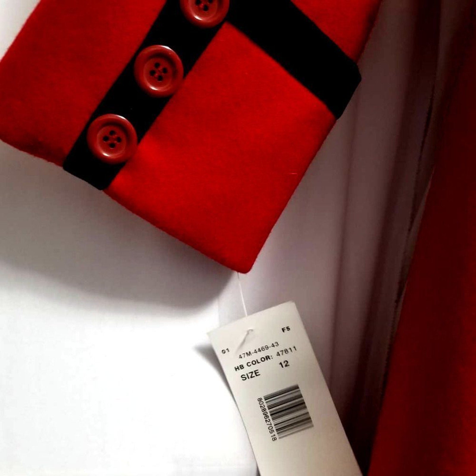 Harve Benard by Bernard Haltzmann vintage red with black trench coat. Double breasted. Ten buttons styled like a toy soldier at top front with un-buttoned bottom half from waist down. Three buttons on black trimmed cuffs. Short collar. with two long side slit pockets.