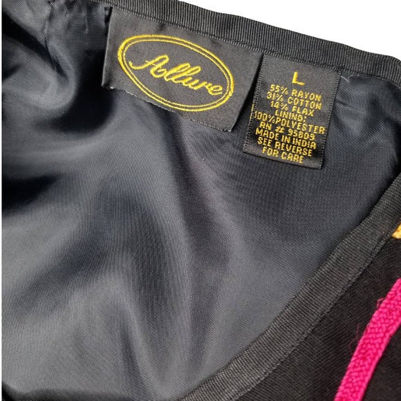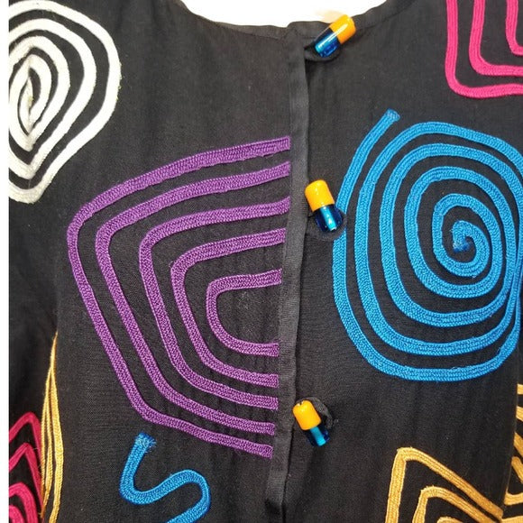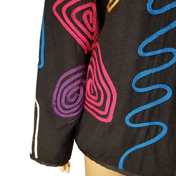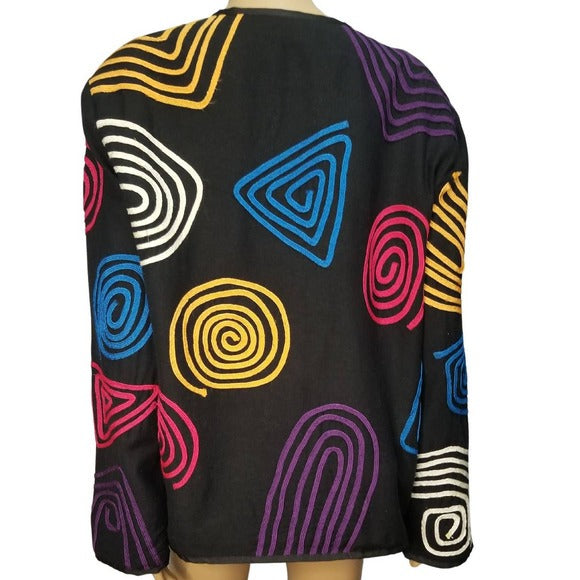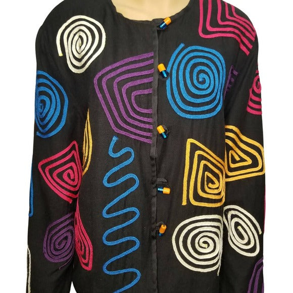 80s Vintage black blazer by ALLURE with bright and colorful geometric line shape designs sewn into the outer layer of this light weight jacket or blazer. Glass bead toggle frog closure. Lined wide sleeve, no collar box cut style.