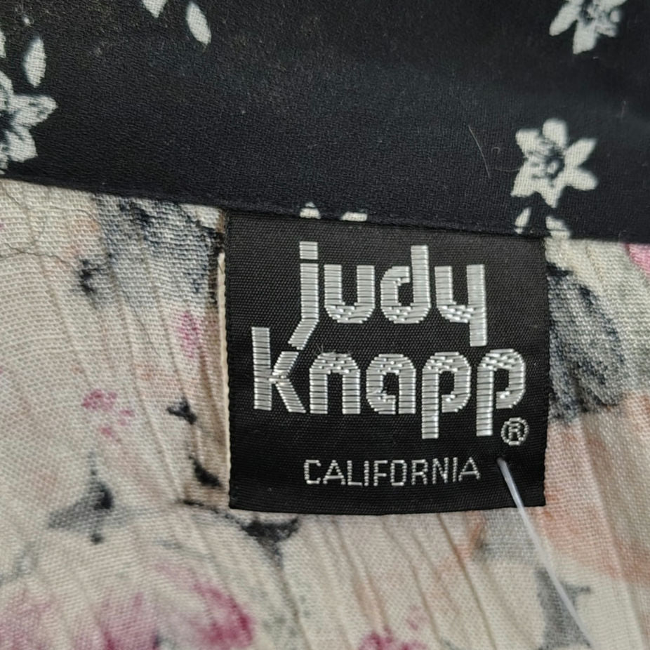 Judy Knapp vintage floral + stripes light weight blazer with collar. Patchwork design. Box cut double breasted with one black button closure.