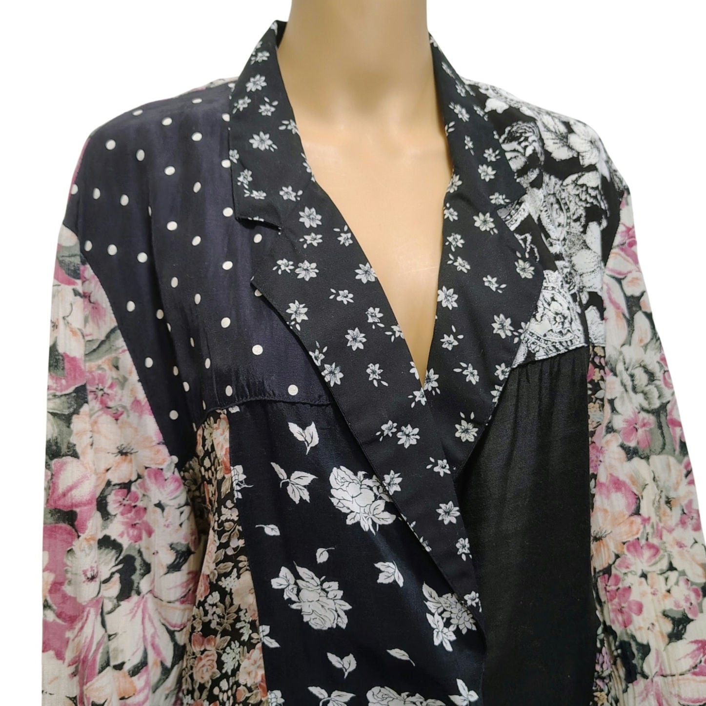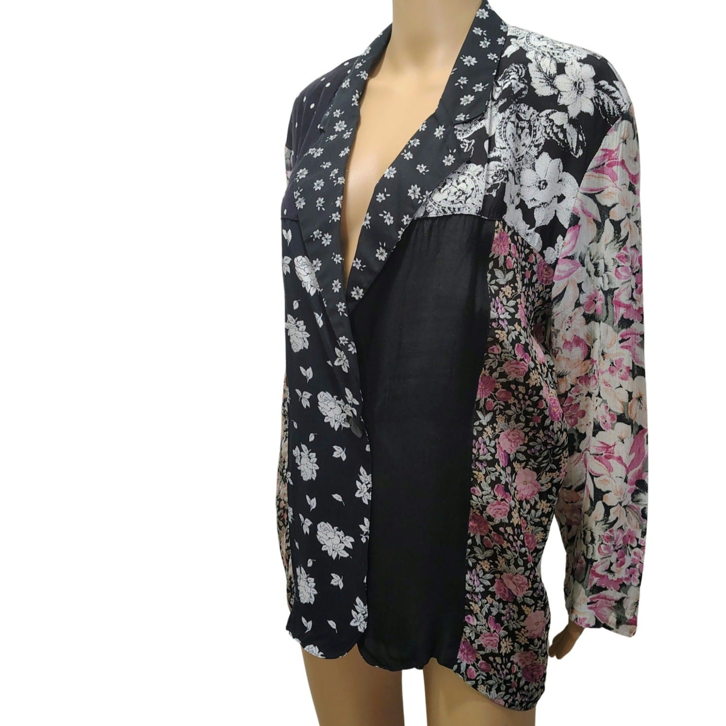 90s Patchwork Floral Striped Light Weight Box Cut Blazer Fold Down Collar Sz Sm