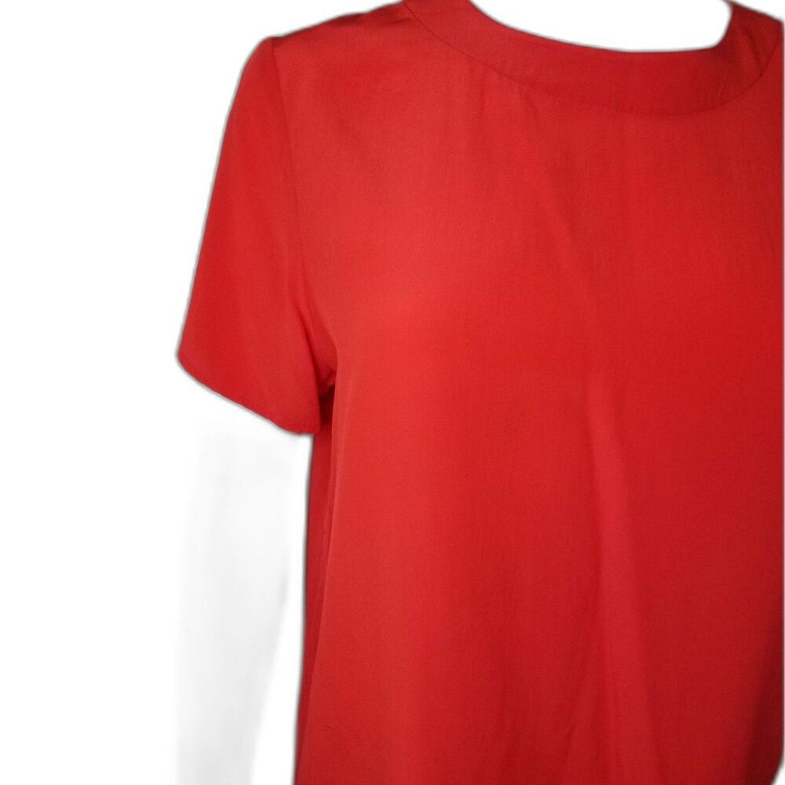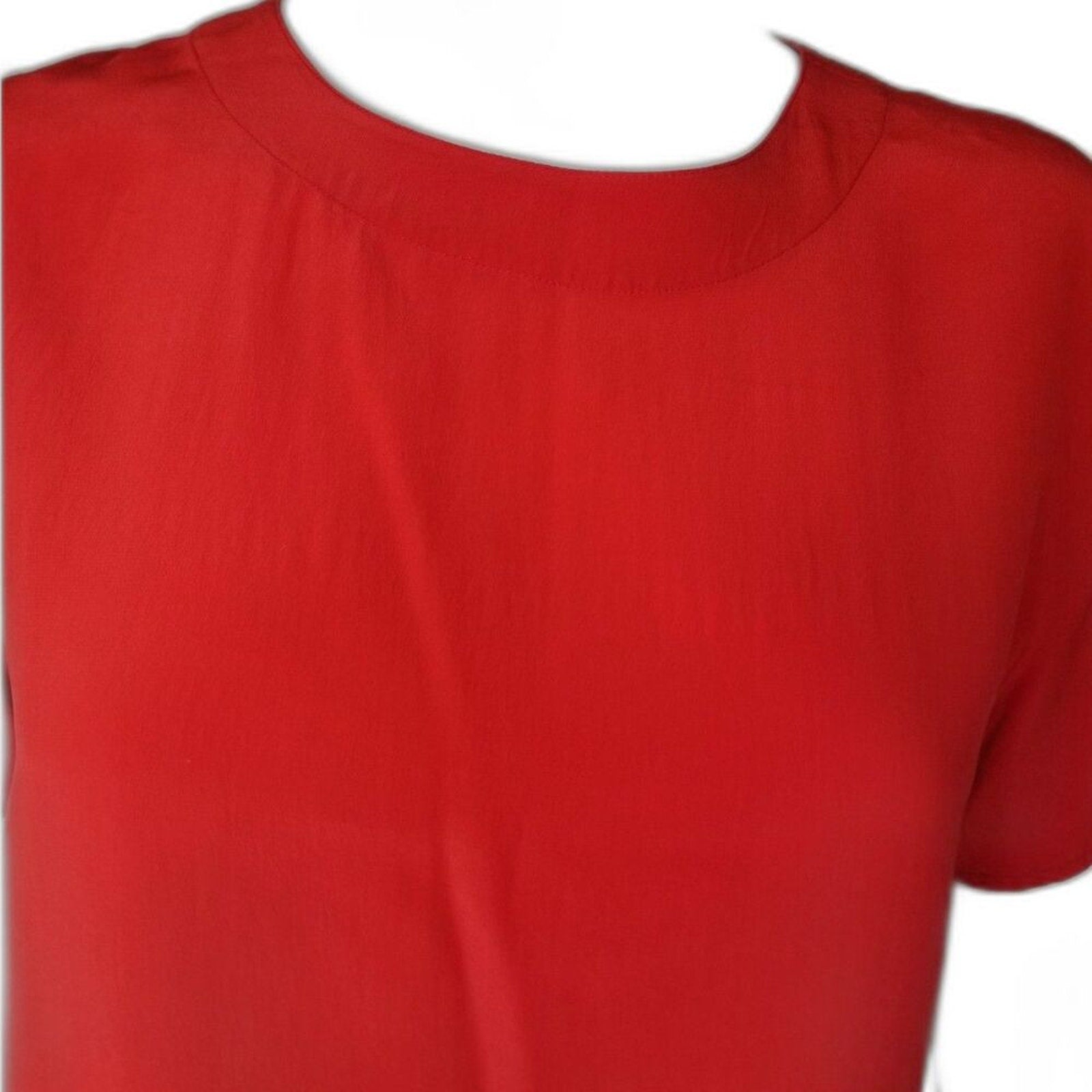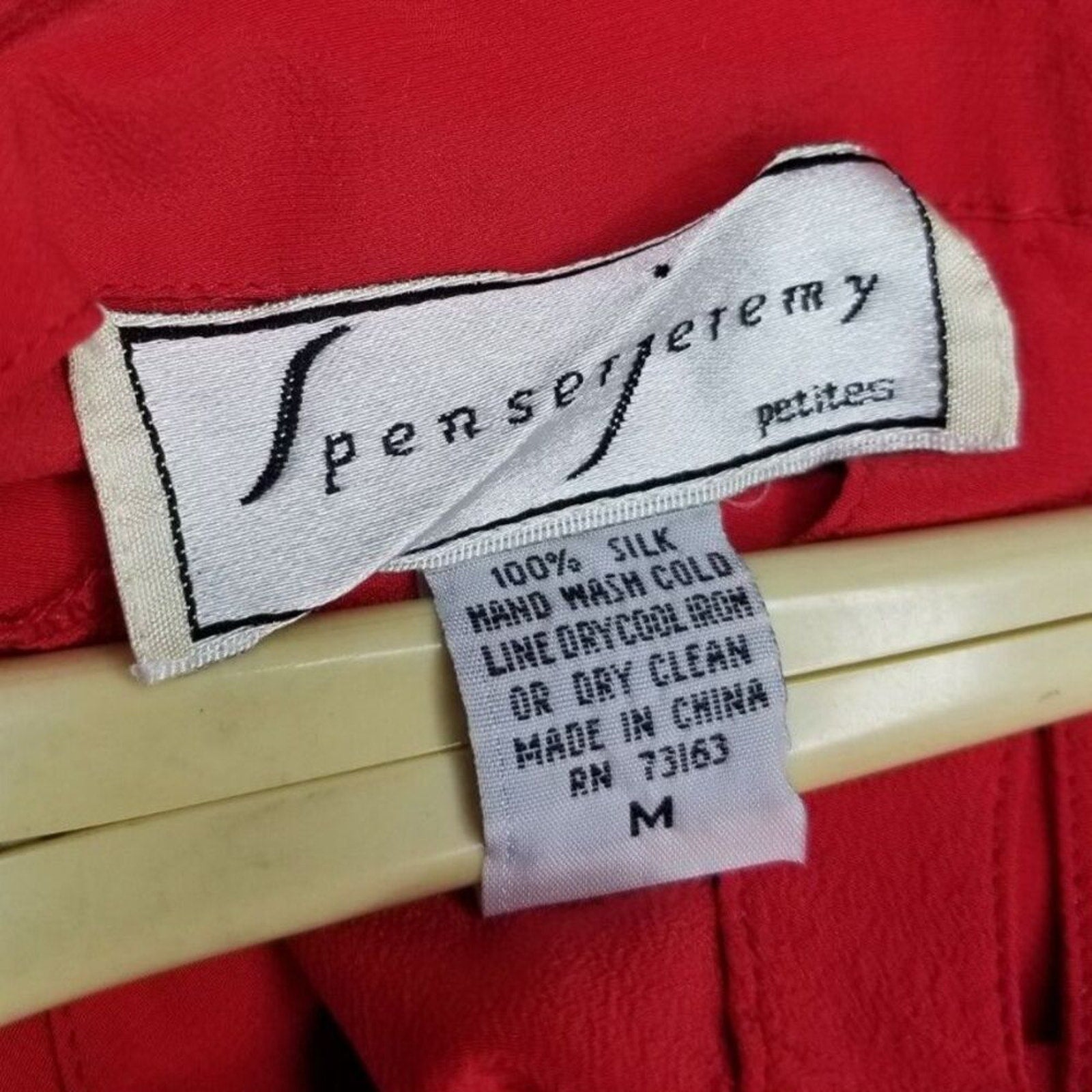 90s Vintage Spenser Jeremy Petites red 100% silk blouse. Short sleeves with a button on back and a key hole at top of back of neck. Box cut style with splits on both sides.