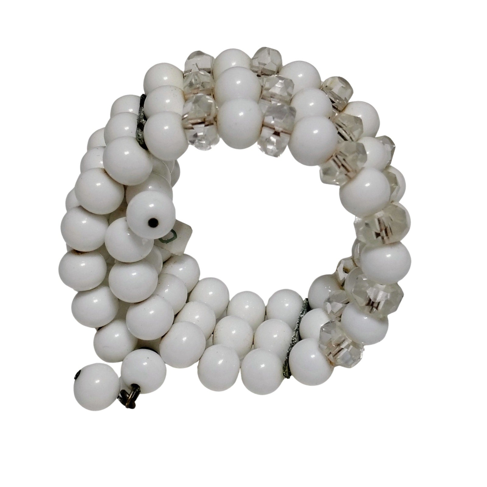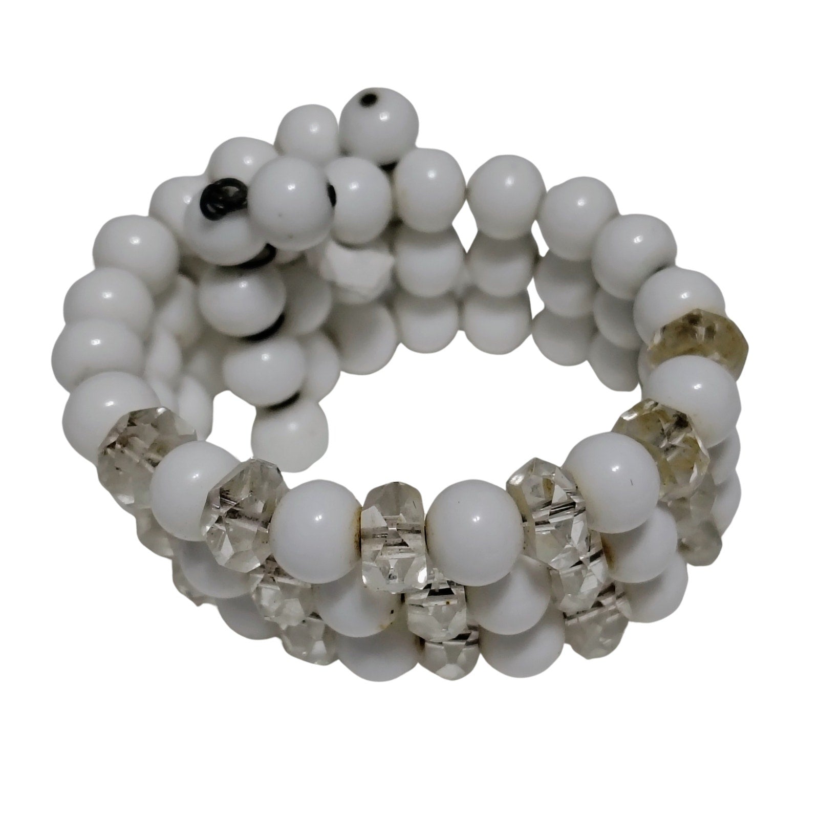 Antique White Glass & Crystal Bead Wire Strand Beaded Stiff Wire Cuff Bracelet