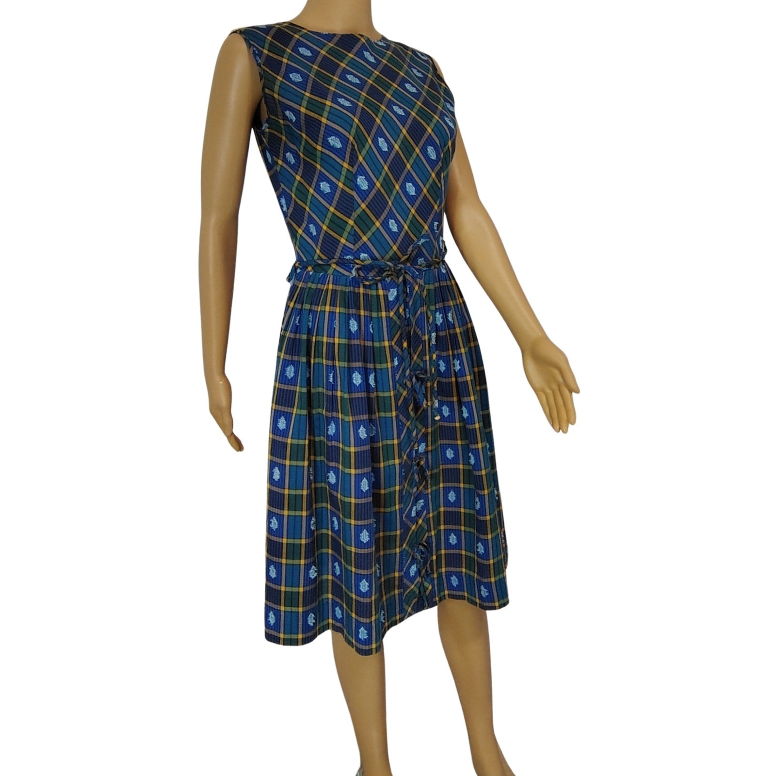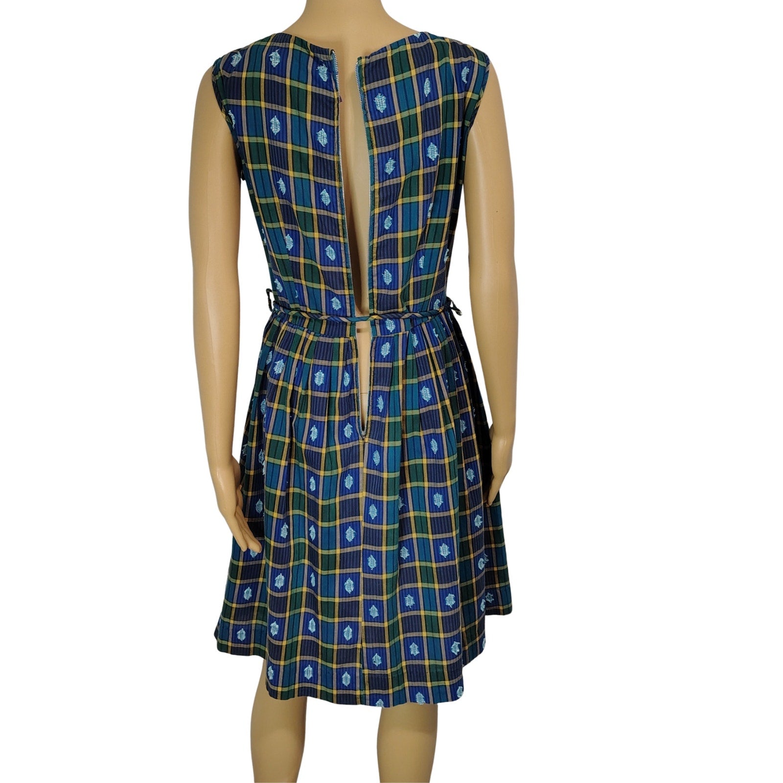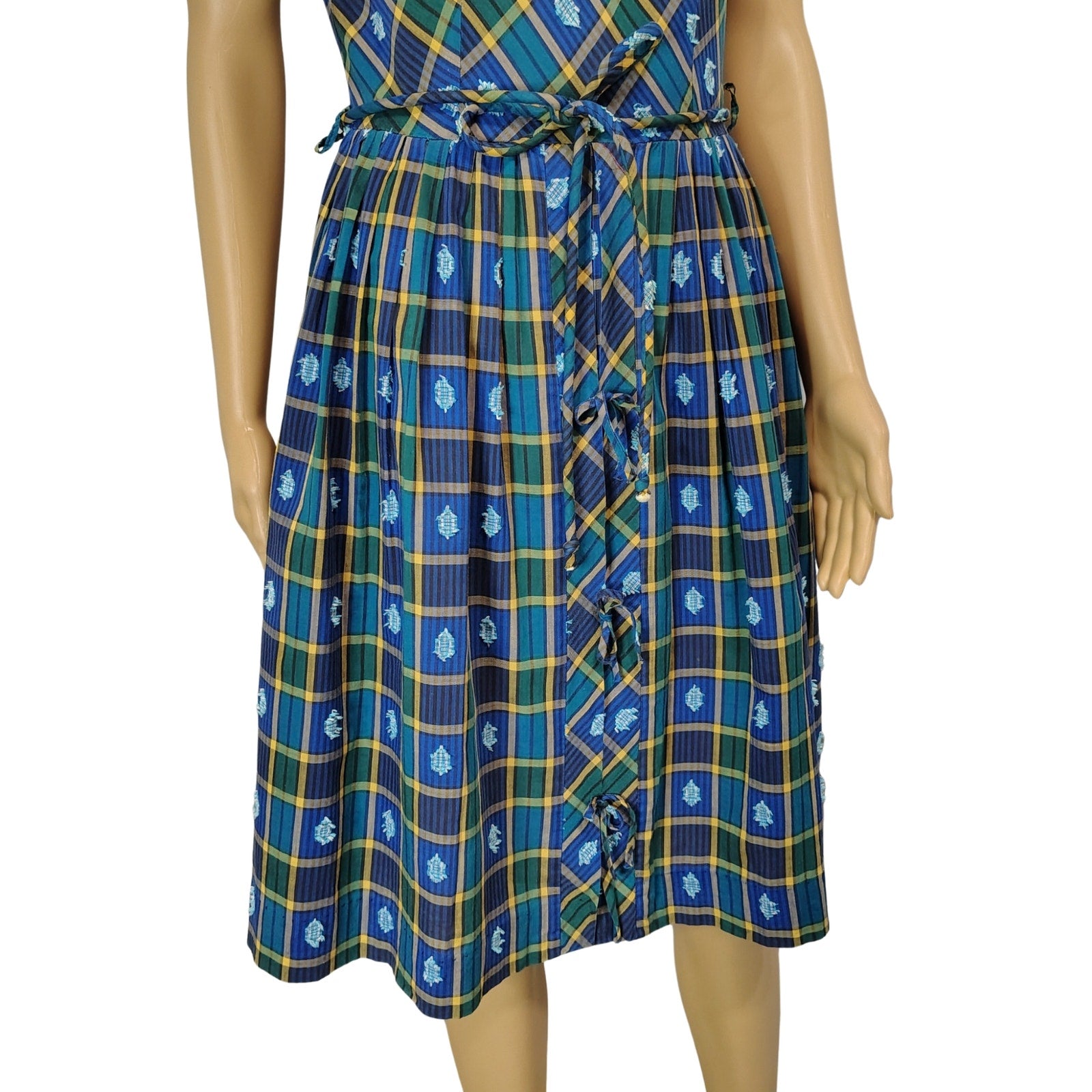Belted Blue Green Plaid Vintage Handmade Pleated Ribbon Tie Midi Dress Size Small [Vintage]