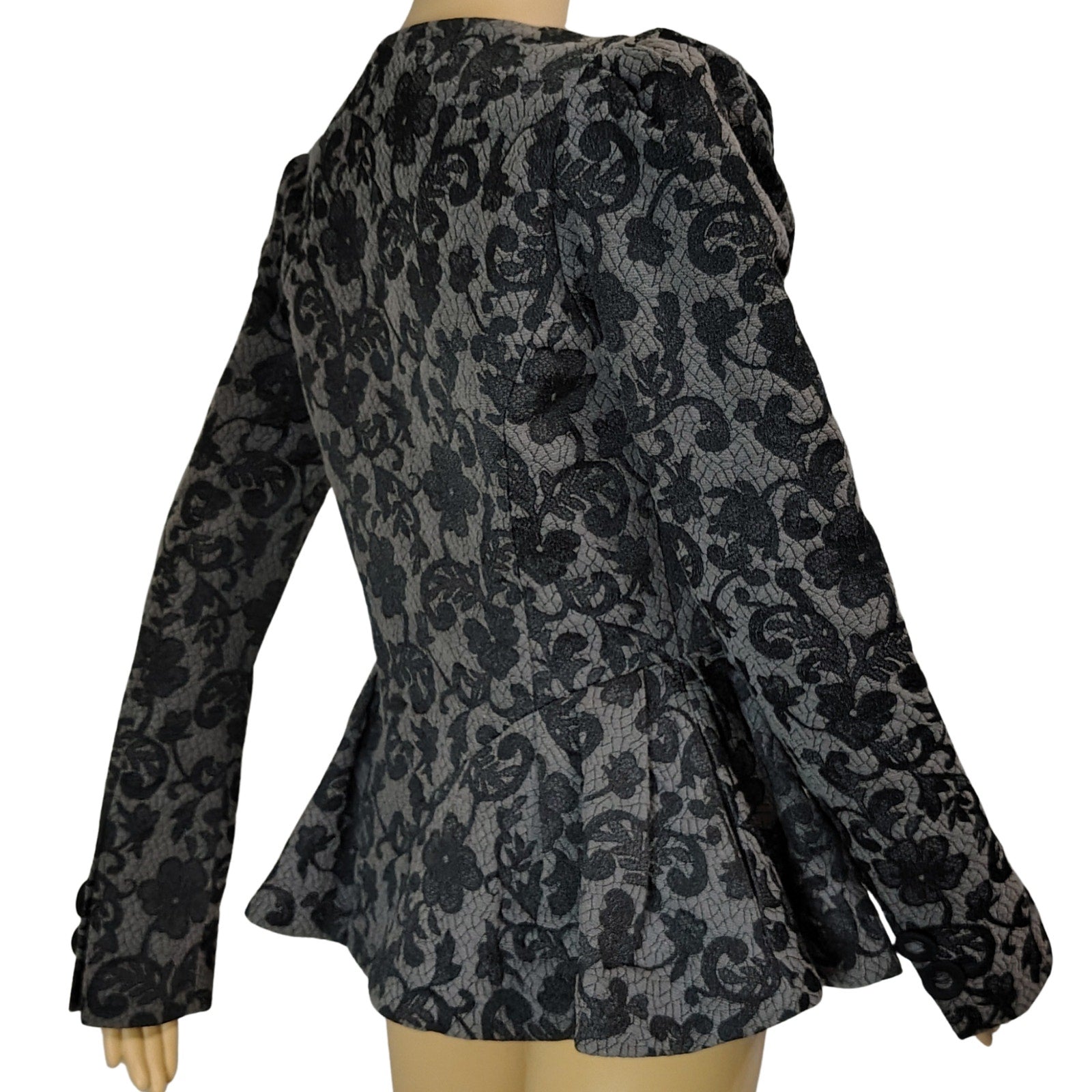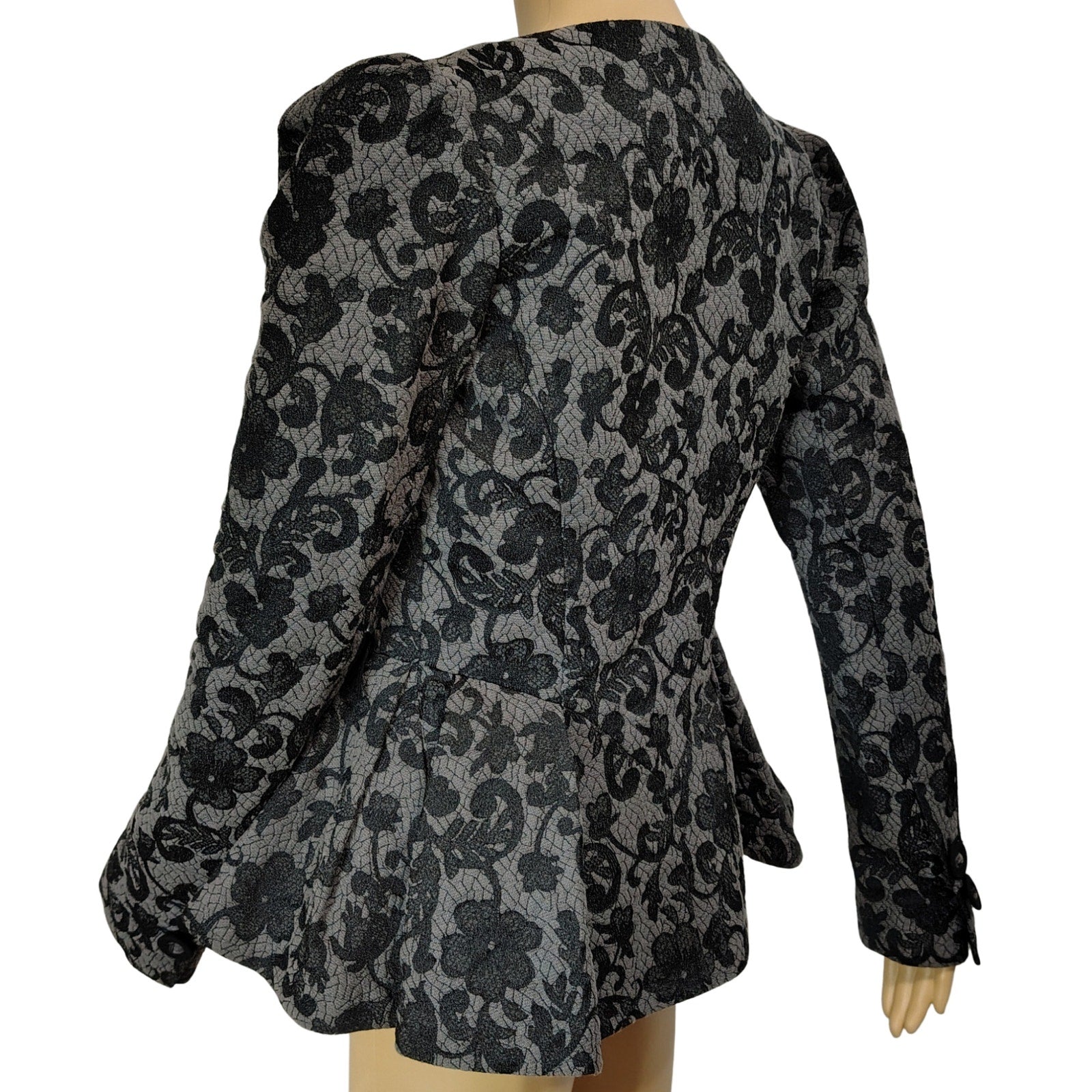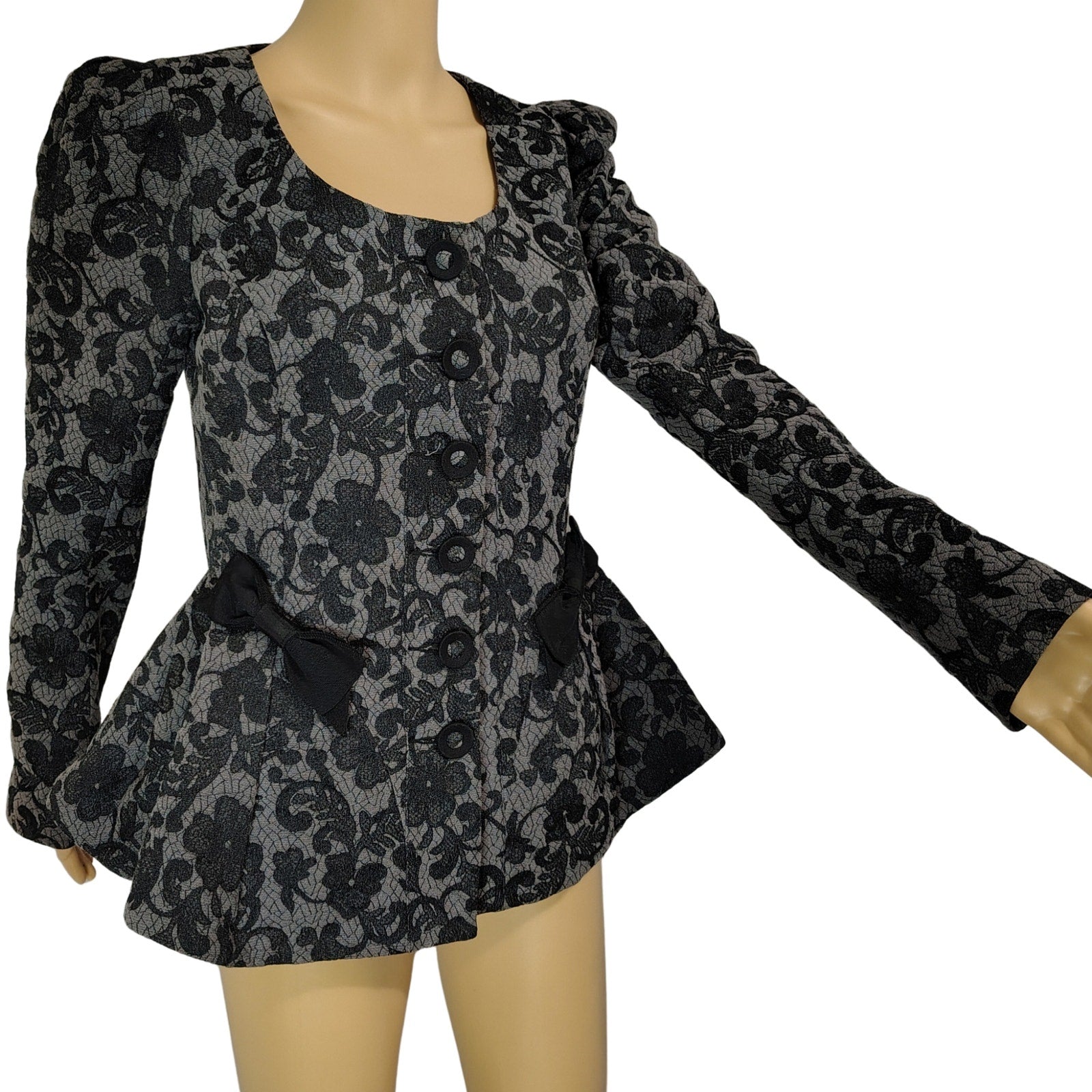 Betsey Johnson Floral Jacket Womens Brocade Peplum Blazer with Ribbons. Fit flare style. Six buttons runs down front. Puffy sleeve cap thin sleeves.