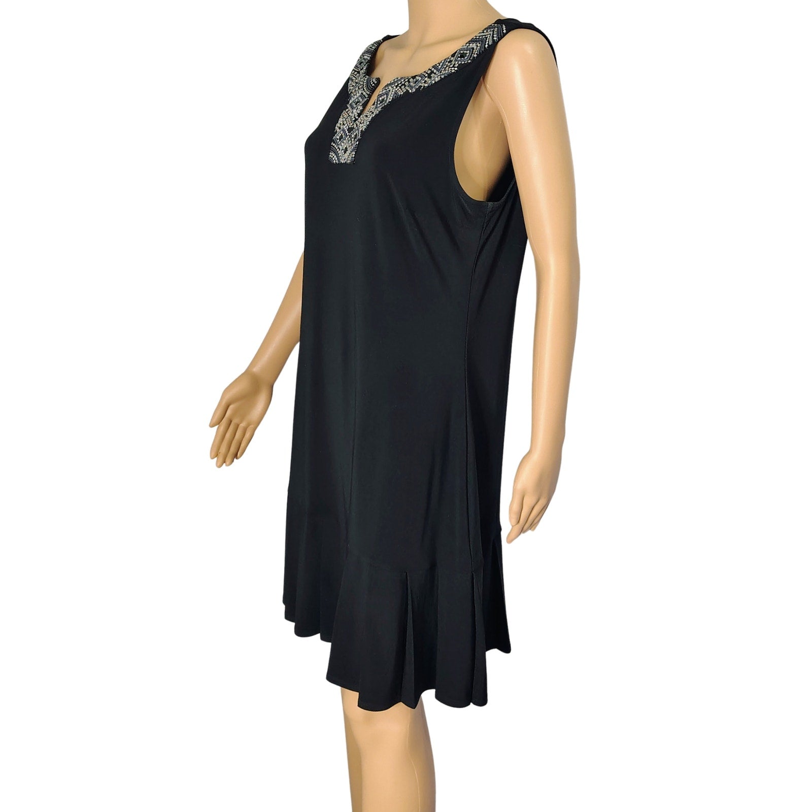 Black Metallic Embellished V Neckline 1920s Flapper Inspired Pleat Hem Drop Waist Dress. Sleeveless jersey knit.
