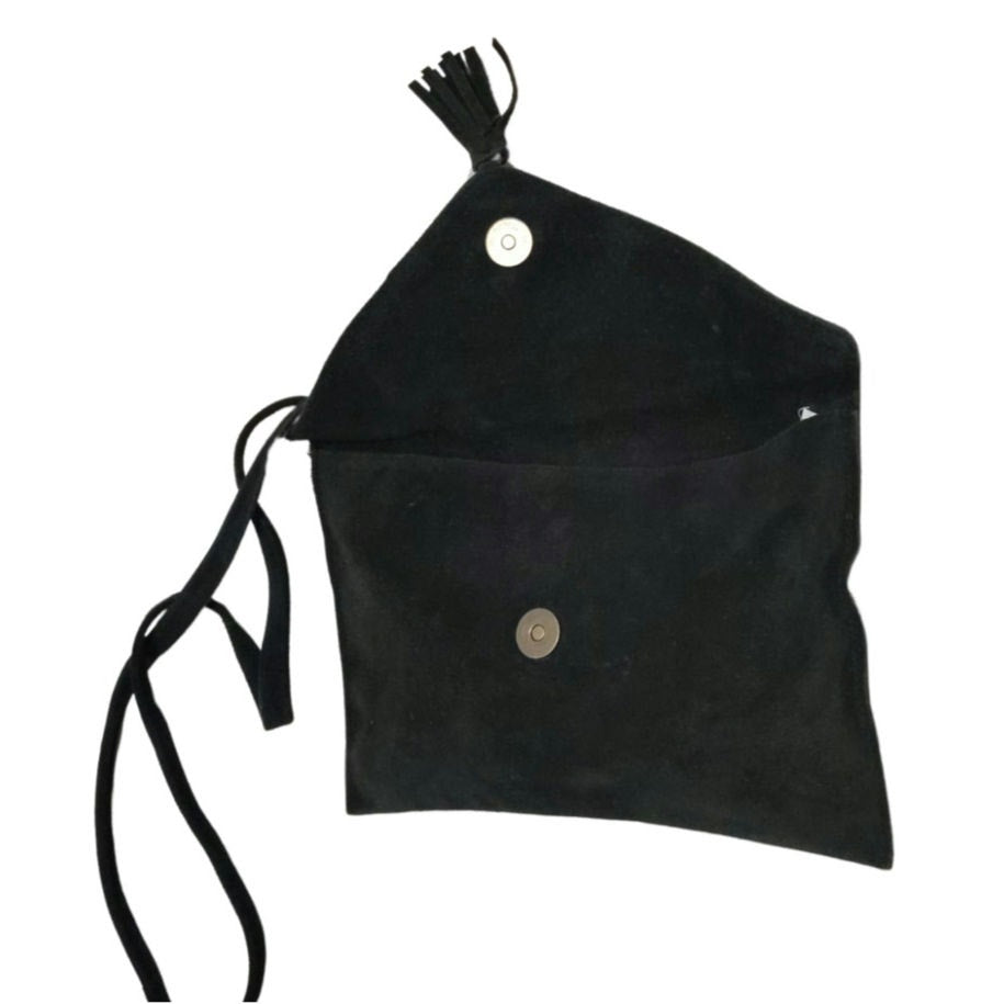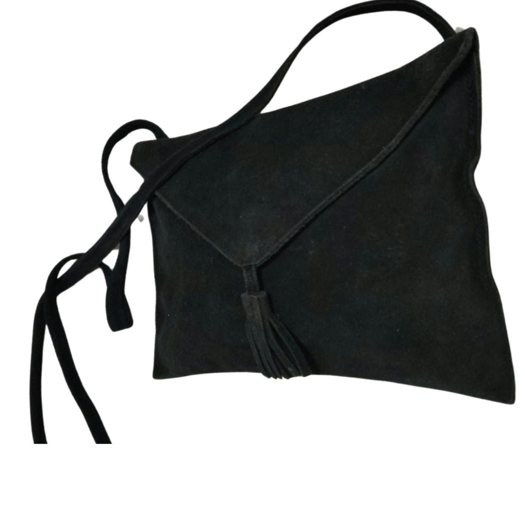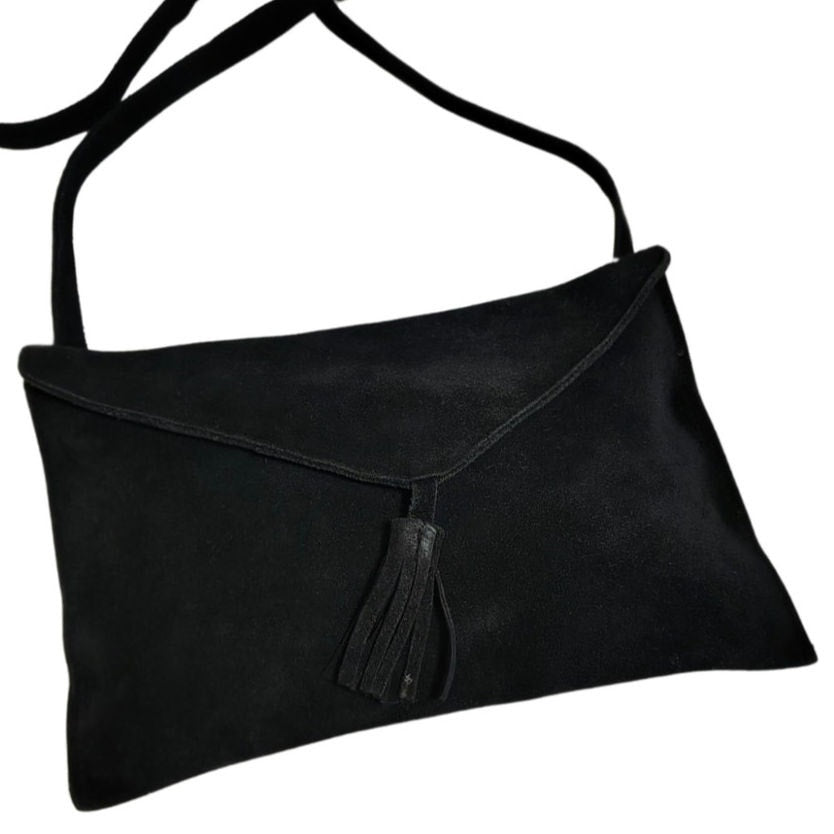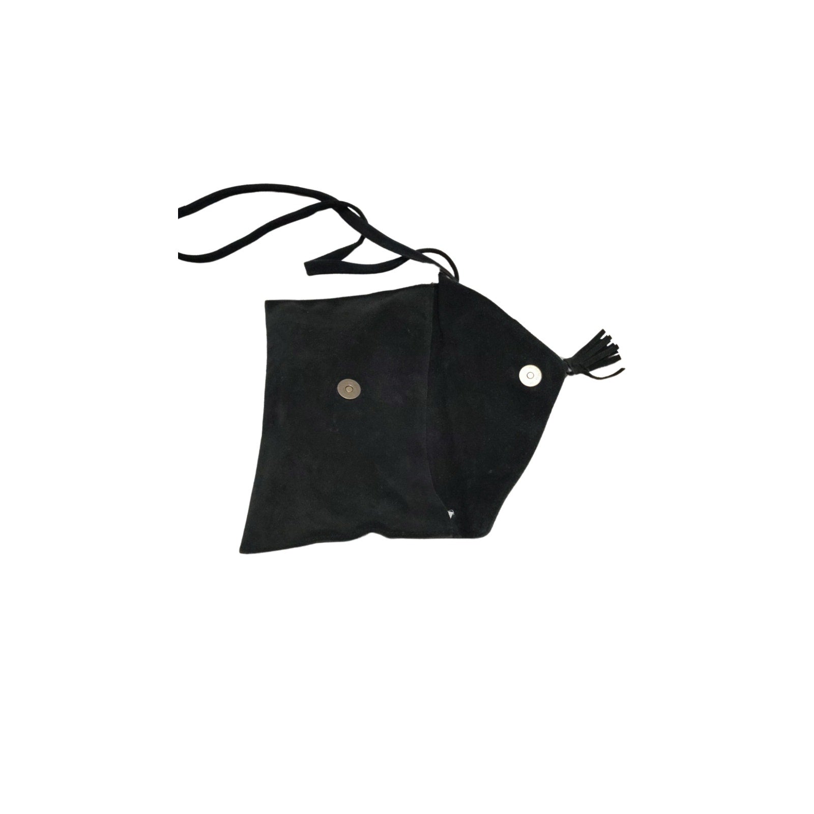 Black Suede Crossbody Envelope Handbag Tassel Magnetic Closure Fold OverTop. Lined. Non-adjustable strap.