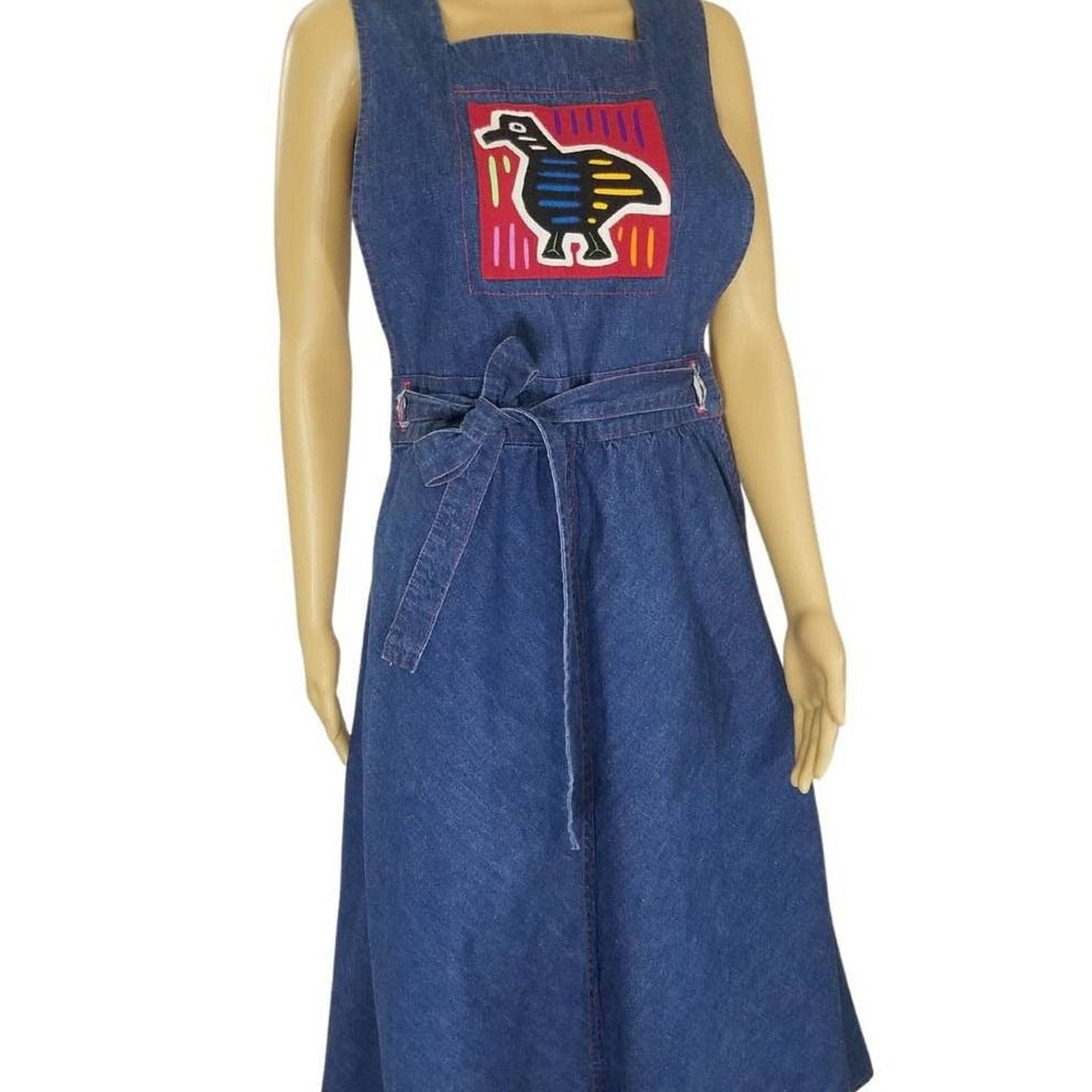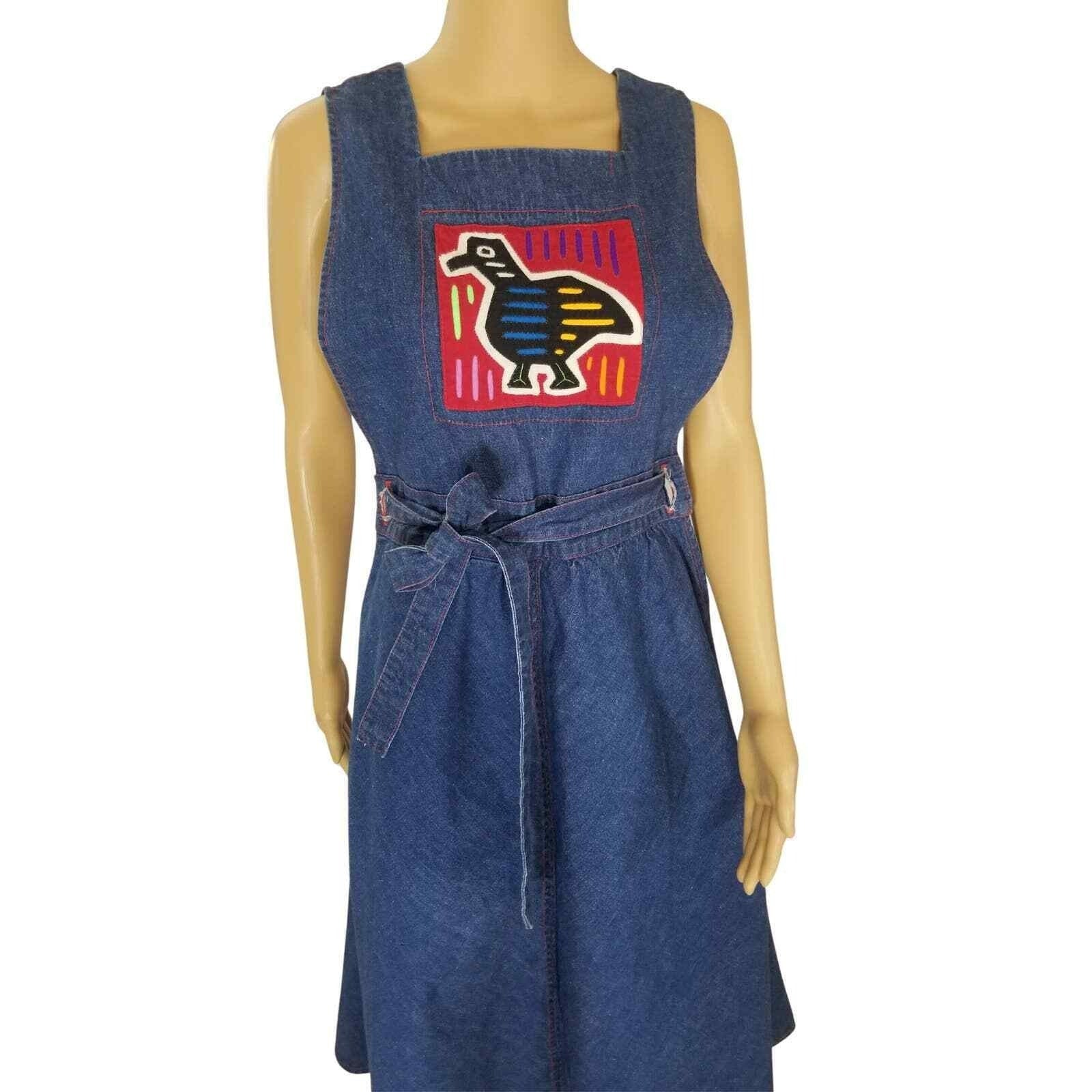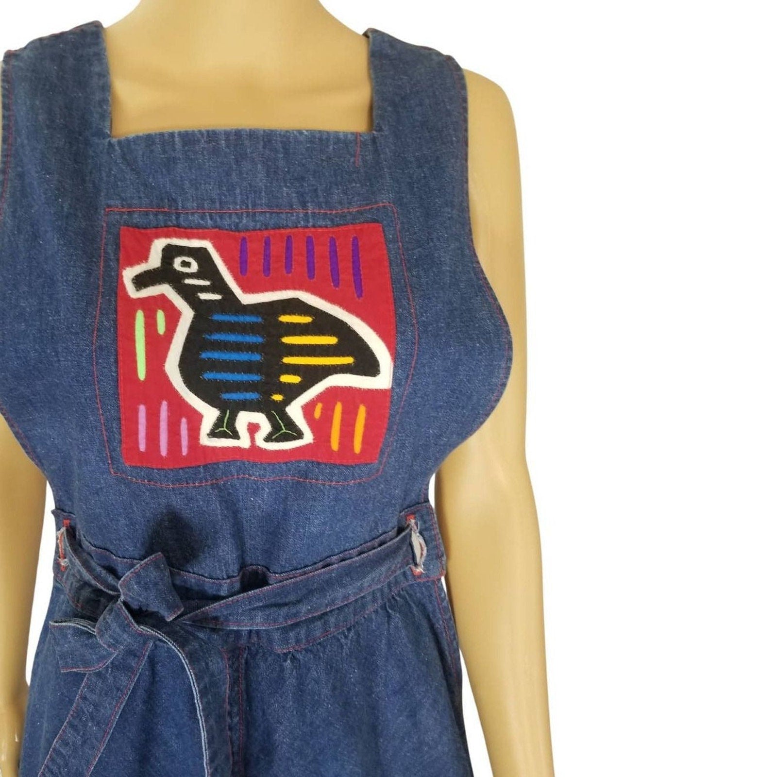Vintage Crossroads (Lakehill Texas) midi tank jean dress with black bird Mola Art Applique patch at center front of the chest, which is the artwork from the Kuna people of Panana, Central America, on a red square with colorful lines. Belted fit and flare style. Top sides are open to the waist. Belted waist with loops. Belt wraps around completely to tighten arm openings as well as the waist. Square neckline. Red seam detail.