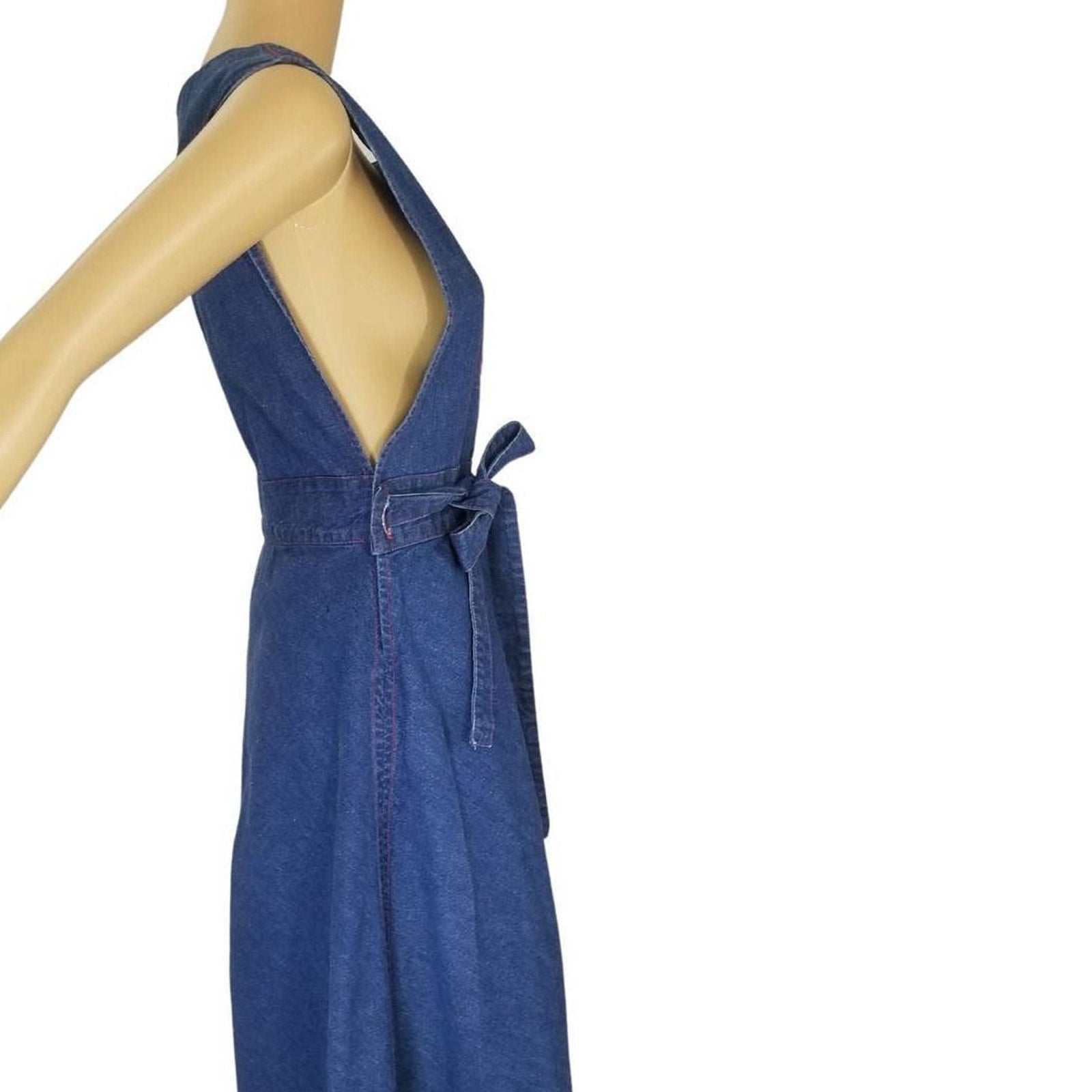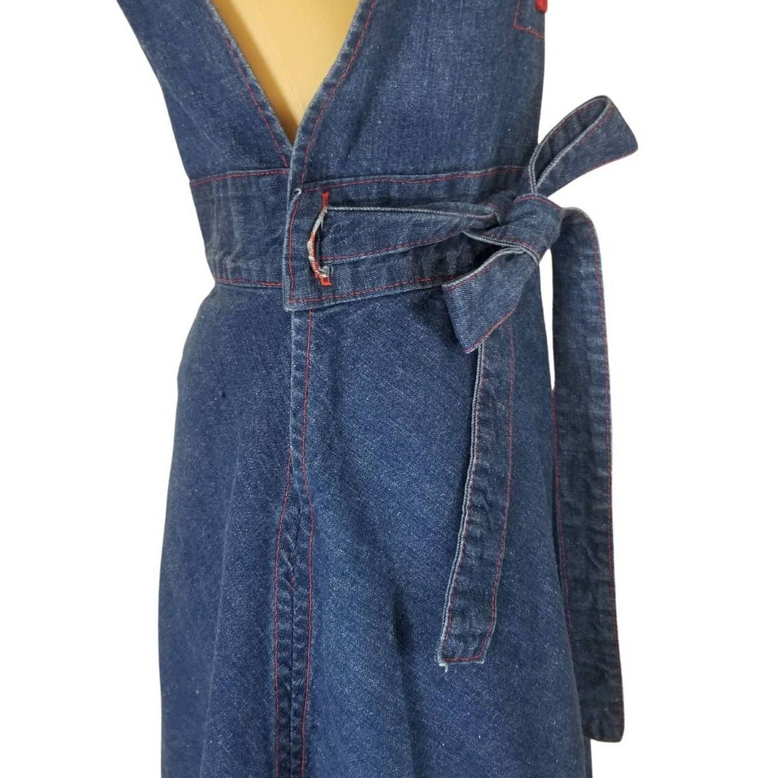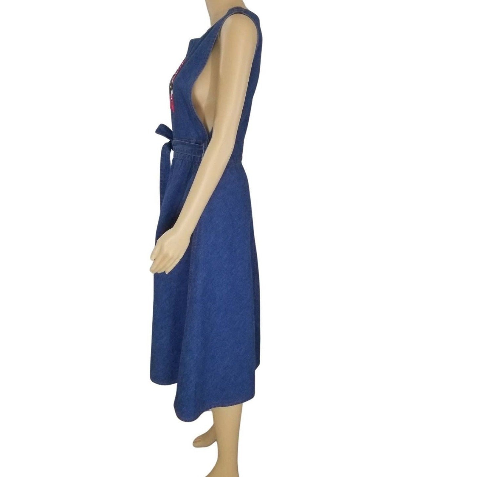 Vintage Crossroads (Lakehill Texas) midi tank jean dress with black bird Mola Art Applique patch at center front of the chest, which is the artwork from the Kuna people of Panana, Central America, on a red square with colorful lines. Belted fit and flare style. Top sides are open to the waist. Belted waist with loops. Belt wraps around completely to tighten arm openings as well as the waist. Square neckline. Red seam detail.