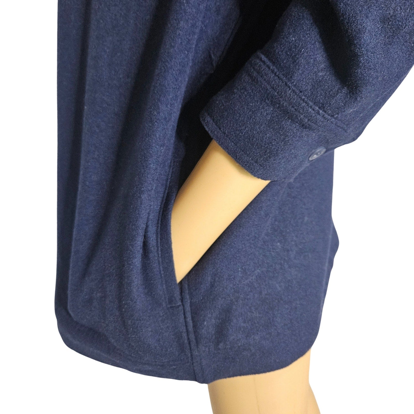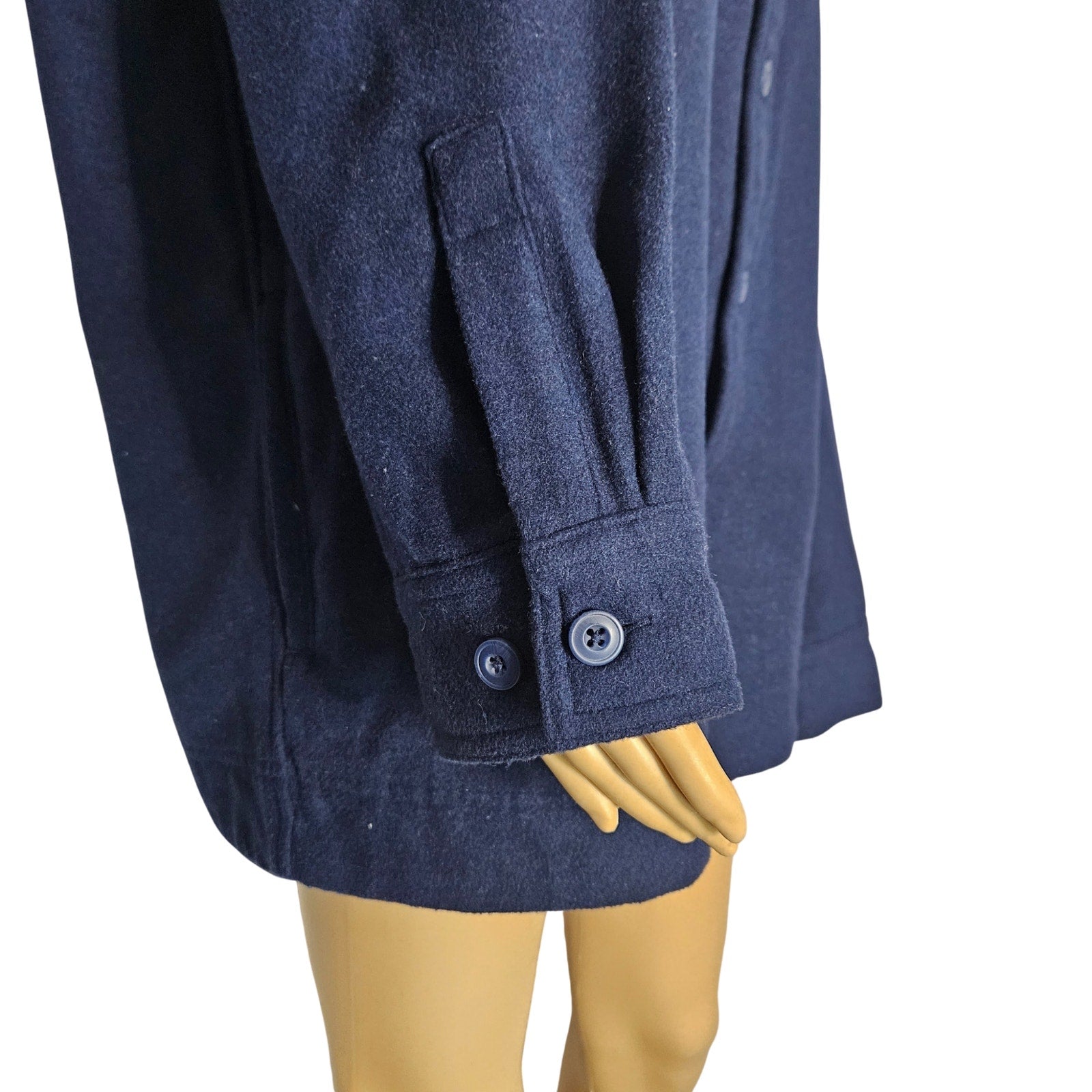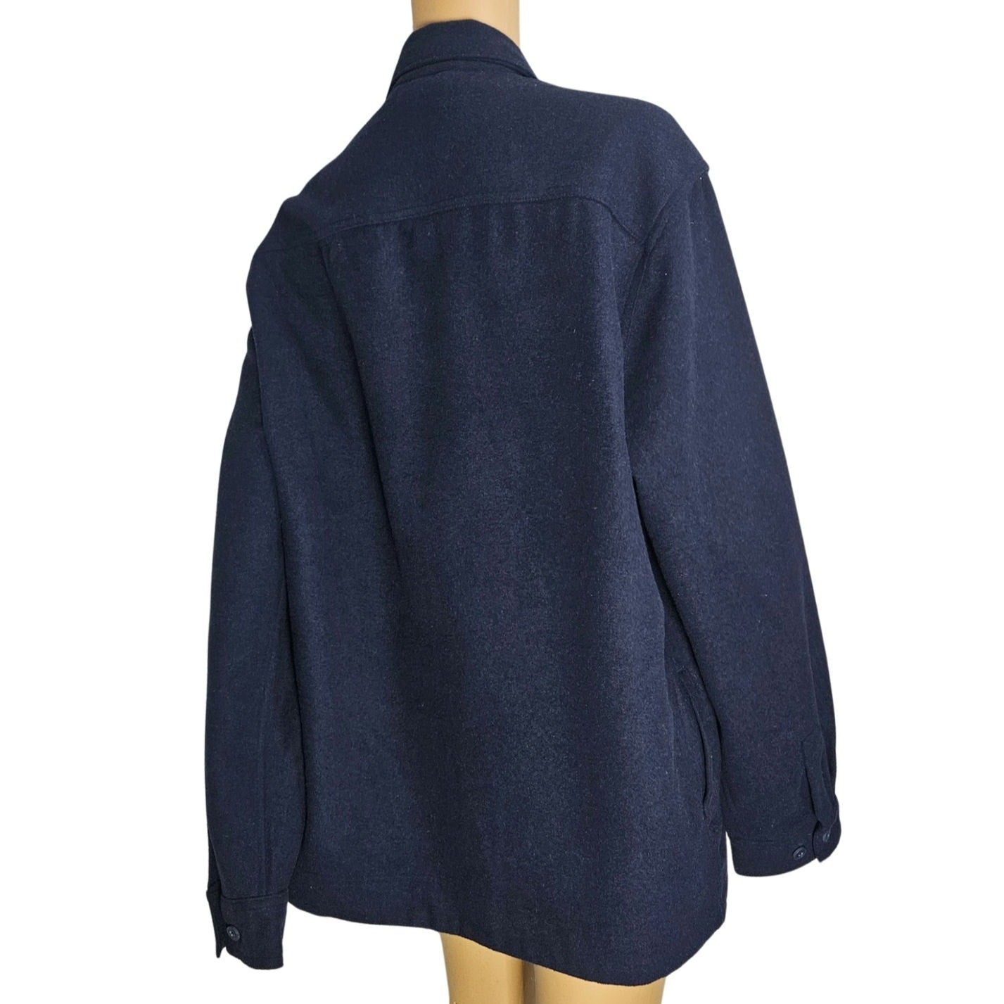 Blue Wool Christian Lacroix Long Sleeve Button Up Folded Collar Shirt. Two side pockets at sides of hips plus two button secured squares pockets over chest. Two buttons on each wrist cuff.