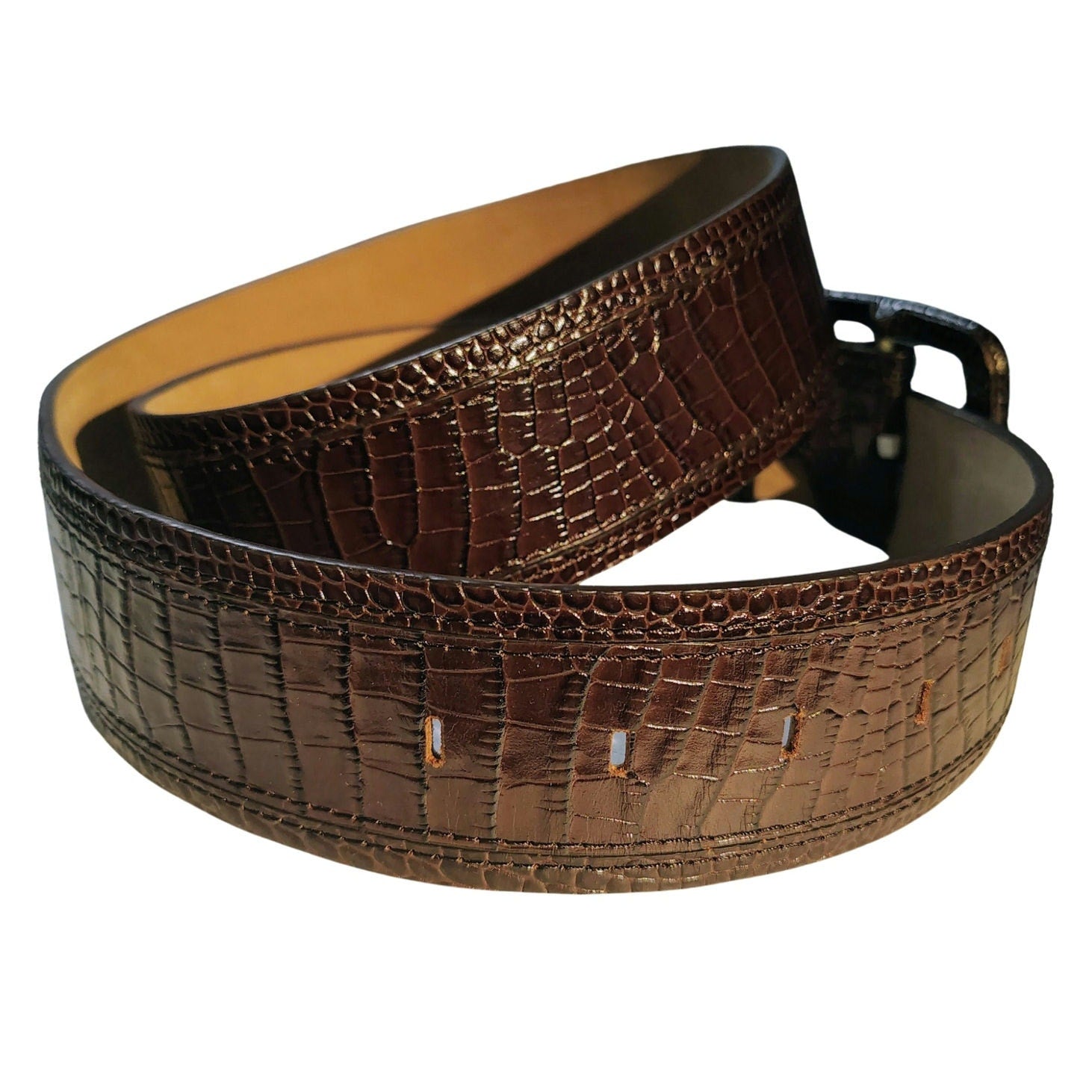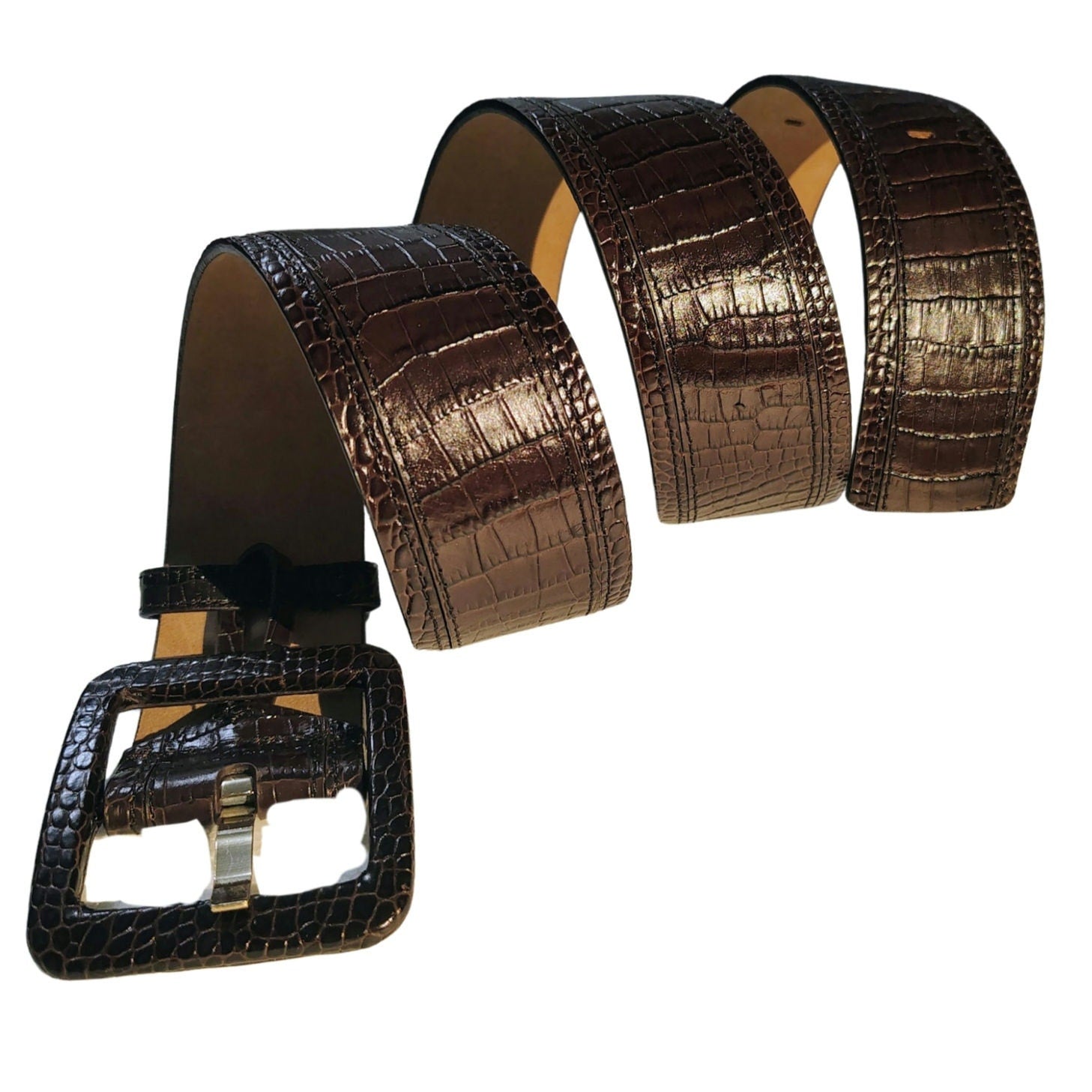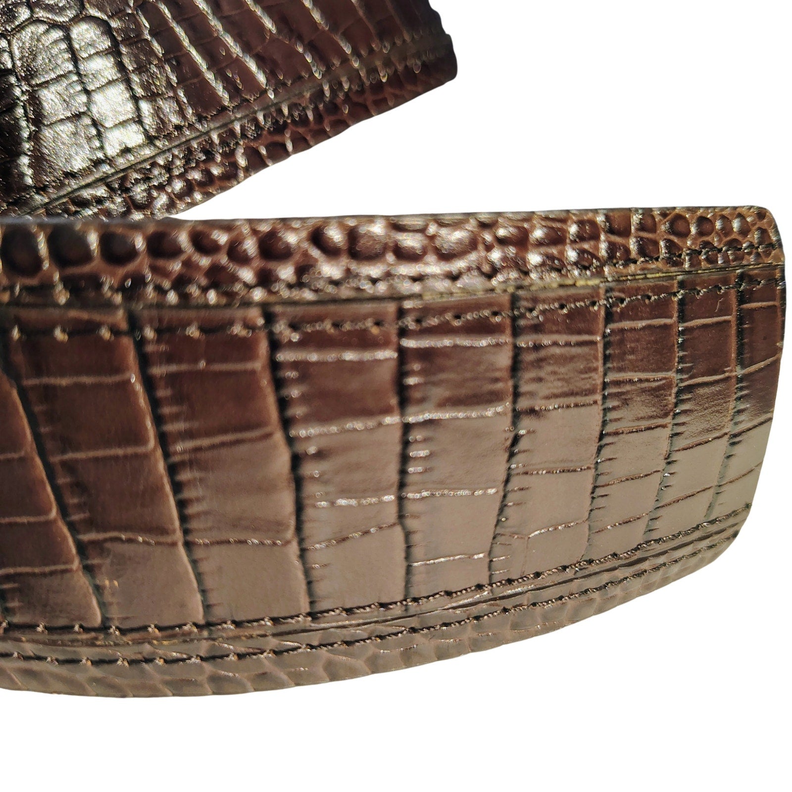 Brown Faux Crocodile Design Genuine Leather Wide Belt Ann Taylor. Big square pull through belt buckle. Square belt tip.
