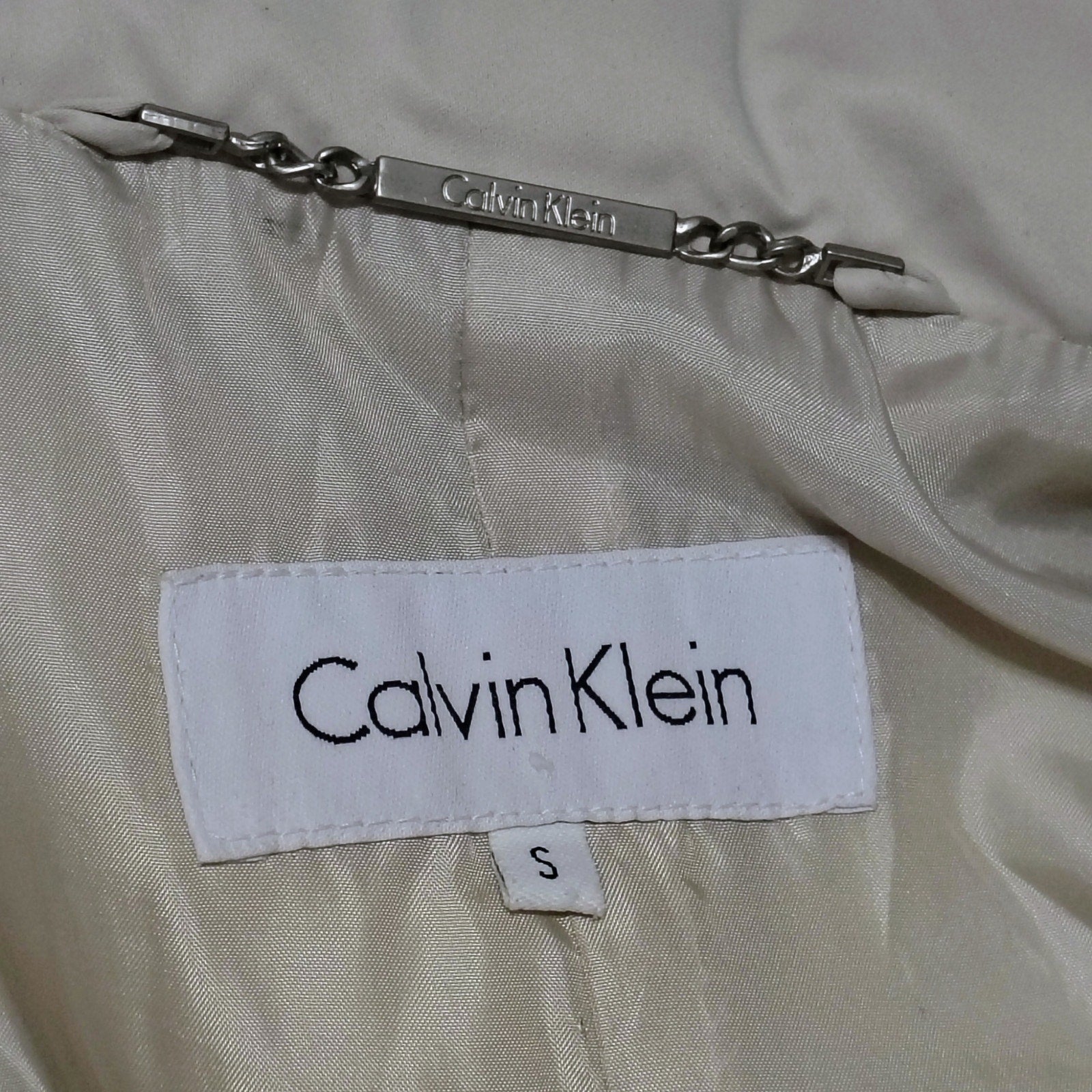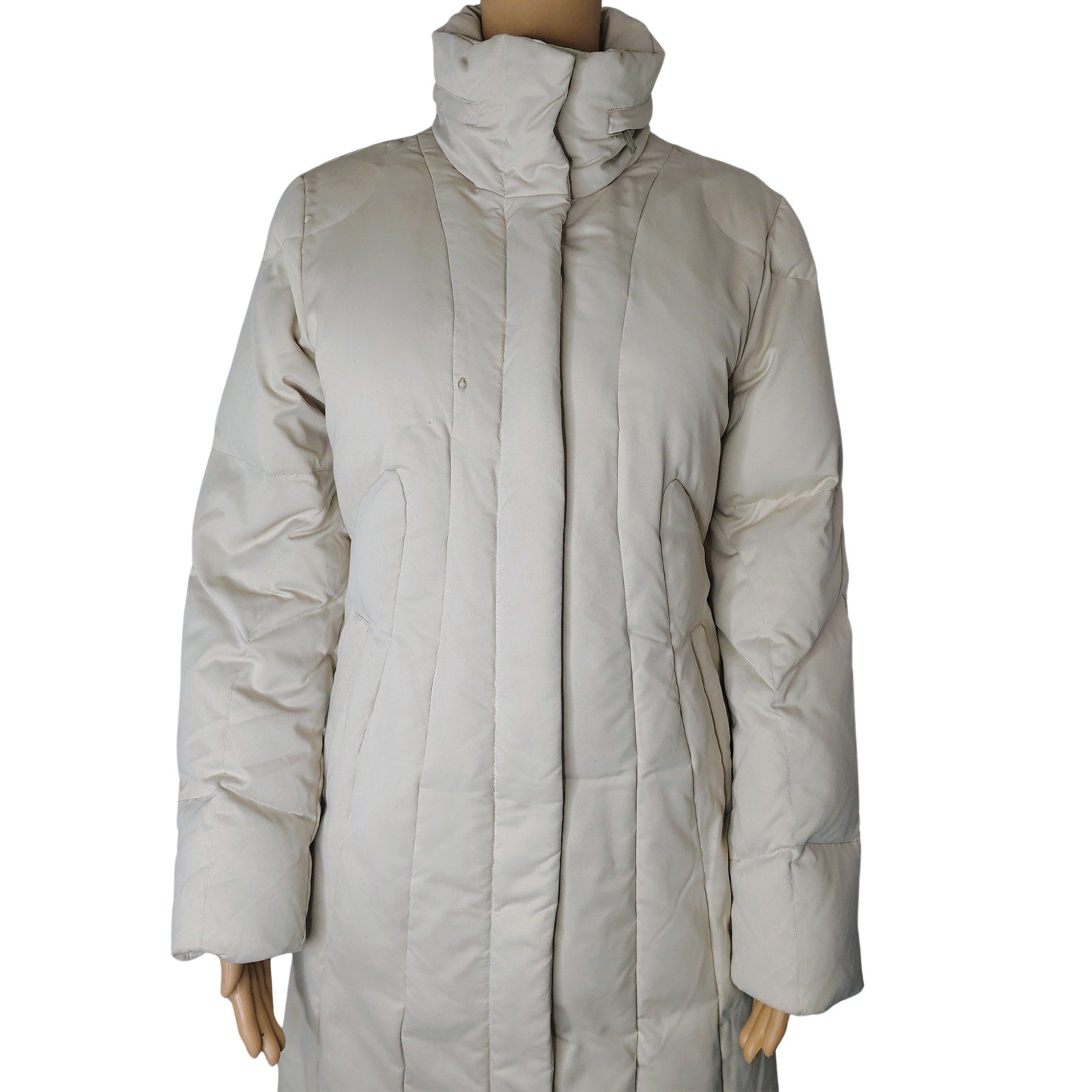 Calvin Klein Beige Performance Women's Puffer Coat Outerwear Long Jacket. Rollaway hood design hidden in the collar. Two hidden zip closure pockets on the inside left side. One unprotected pocket on the inside top right. One hidden zip closure pocket on either side of the hips. 100% polyester softshell fabric. Mid-length coat with long sleeves and a hoodie. Knee length with zippers and snap closures.