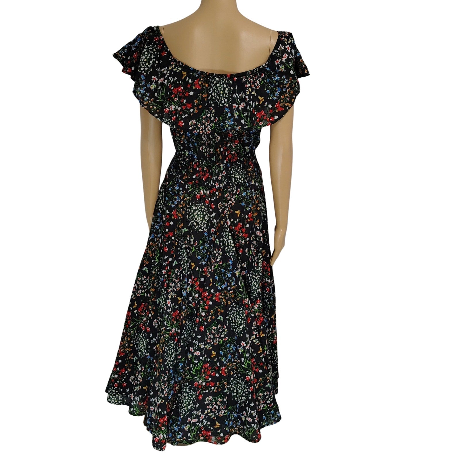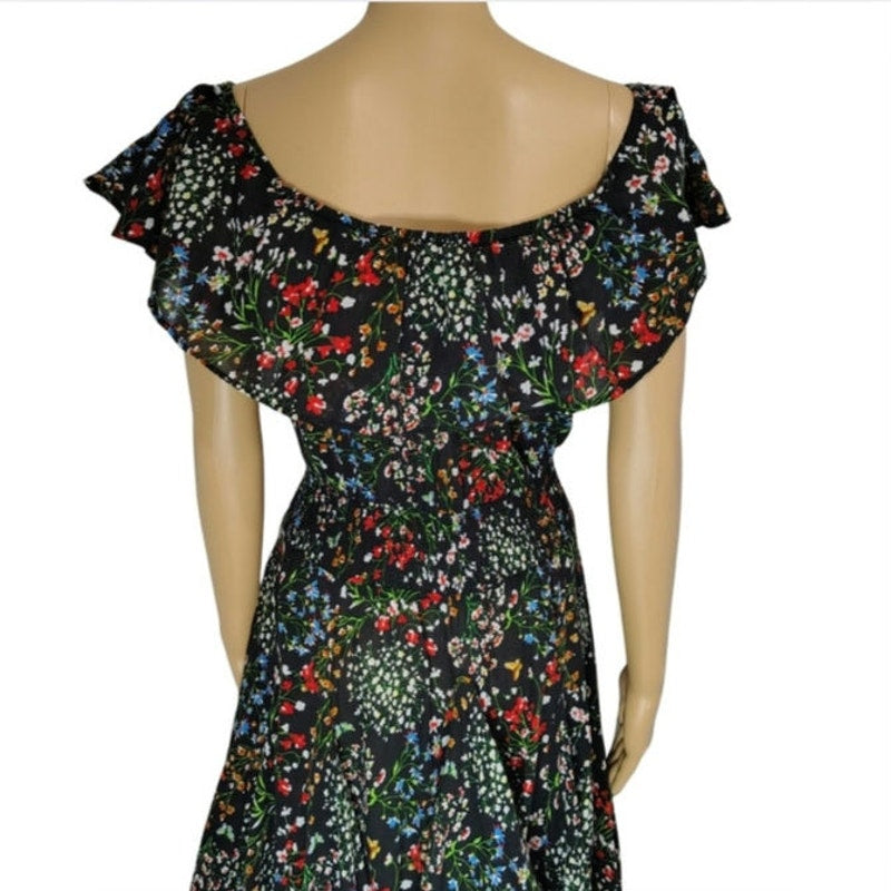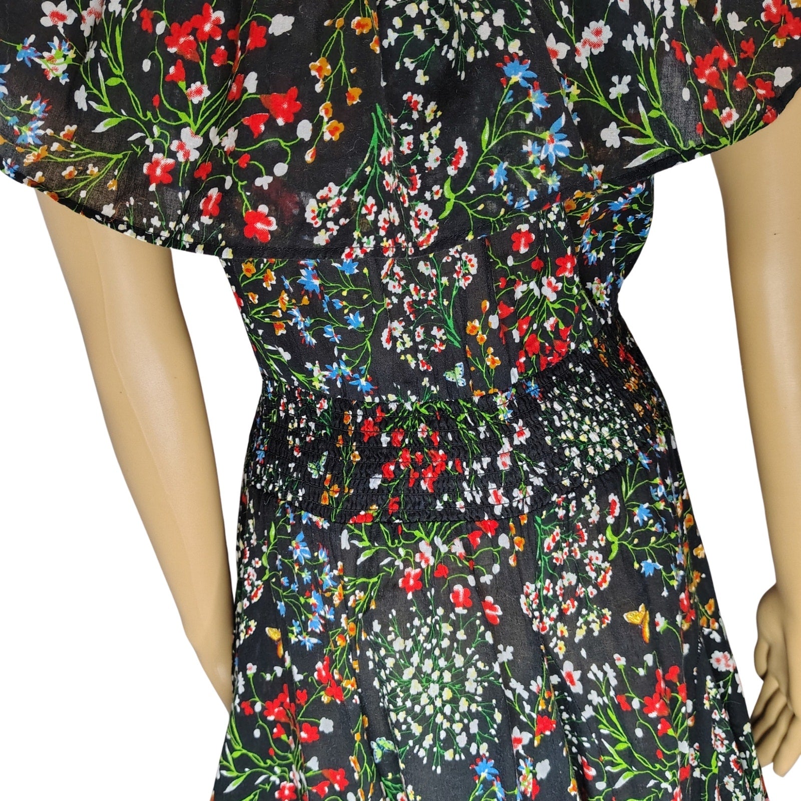 Chelsea & Theodore Floral Peasant Fit Flare Maxi Sundress Smocked Waist. Bardot ruffled elastic neckline can be worn on or off the shoulders. Shirred waist lends to an hour glass shape. The skirt is full with extra fabric sewn into the hemline. The movement of the skirt of this dress is so gorgeous. Lightweight, unlined and slightly sheer.