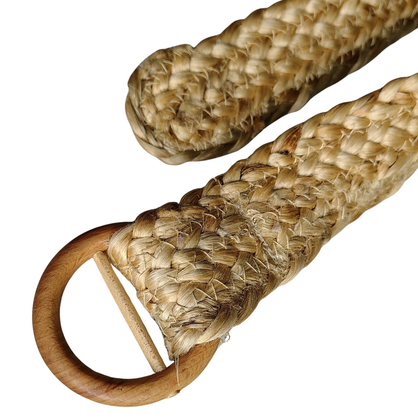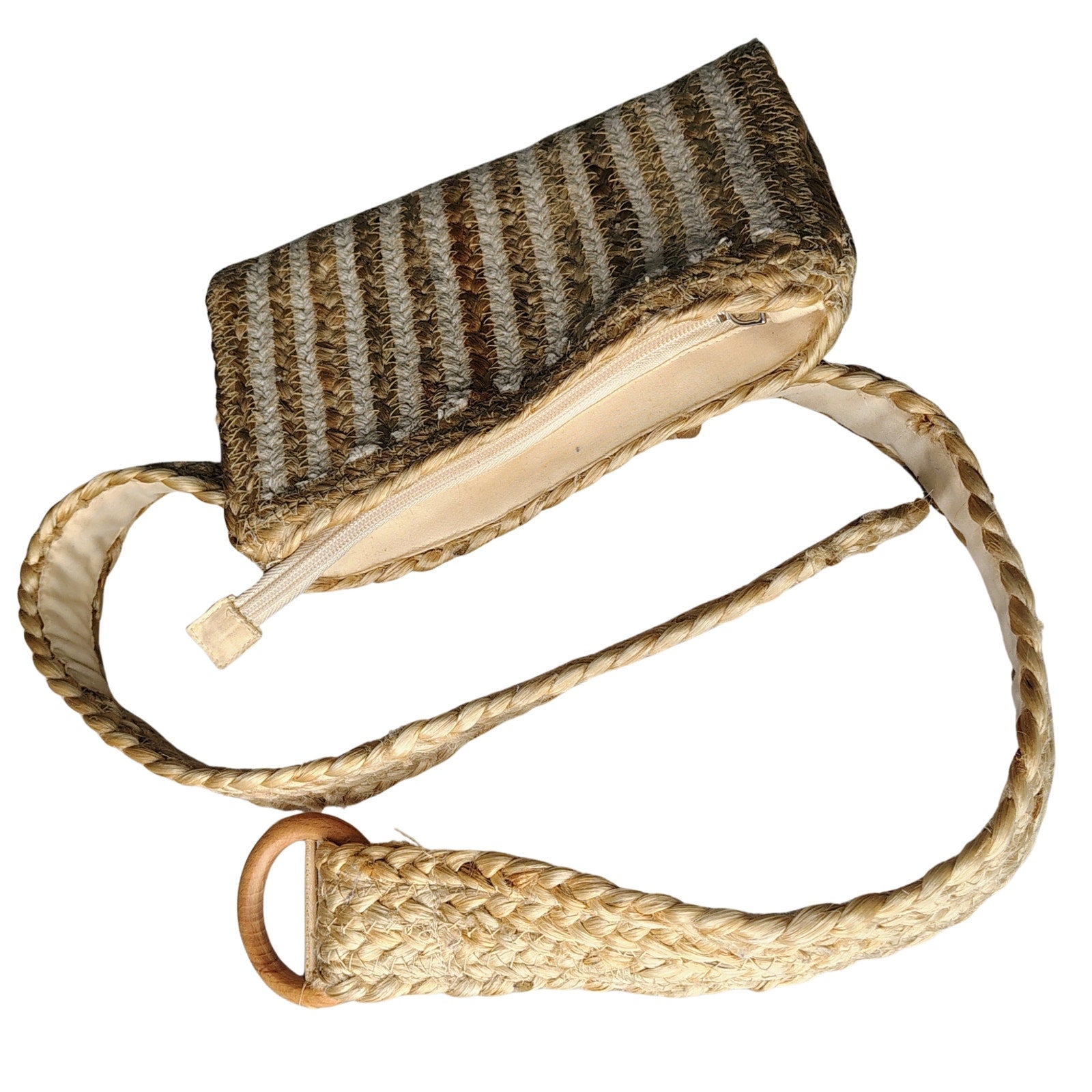 Convertible Belt Bag Fanny Pack Light Brown Cotton Jute Blend Zipper Pouch. Braided Jute design. Removable belt strap. Two large braided loops on the back of the bag holds it in place on the belt.
