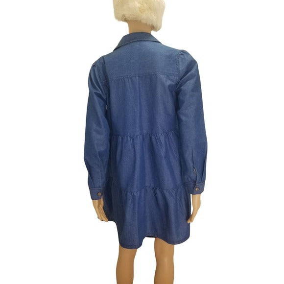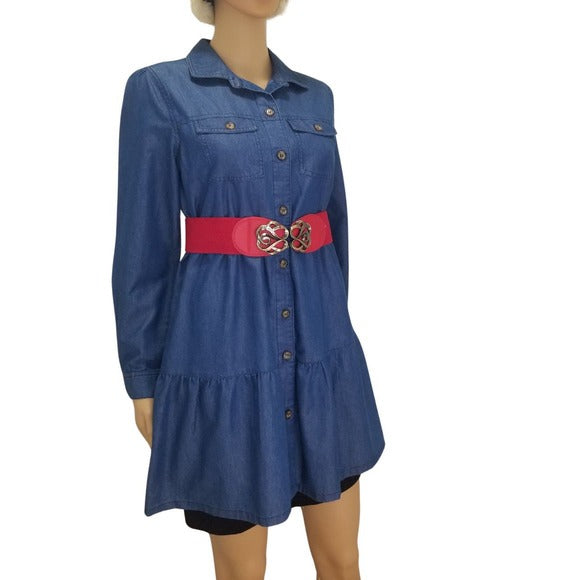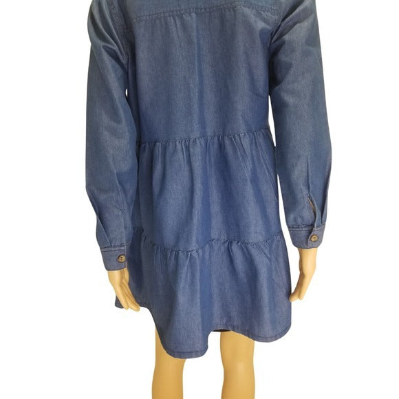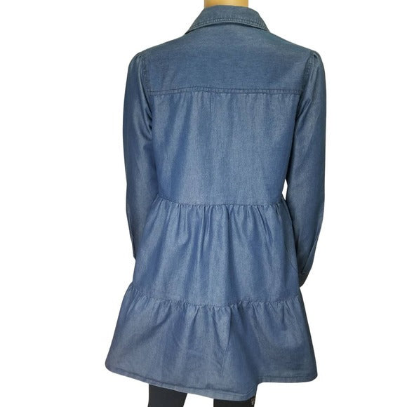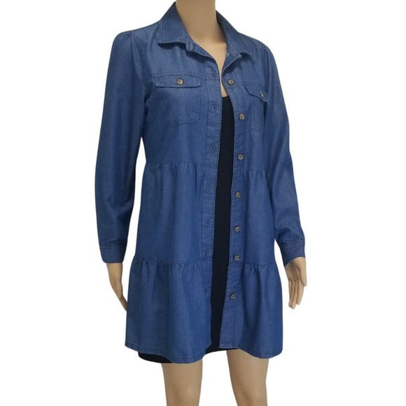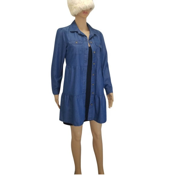Derek Heart blue jean long sleeve three tiered button down shirt dress shacket. Eight buttons down front. Two button secured pockets on chest. Button cuffed sleeves.