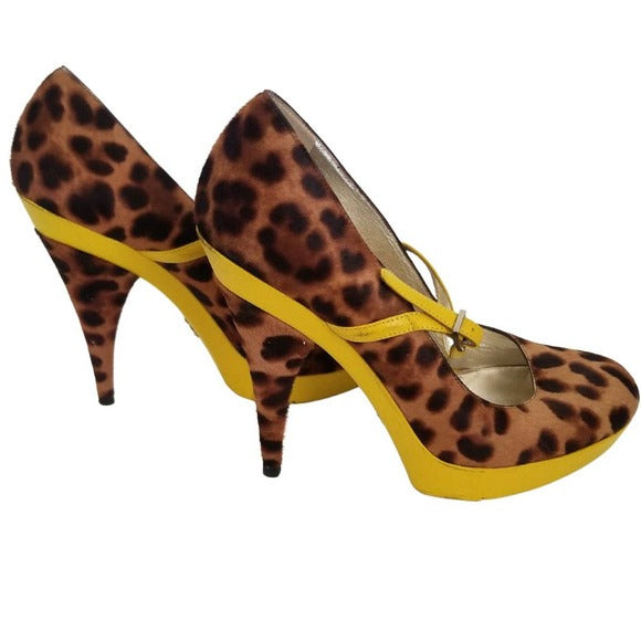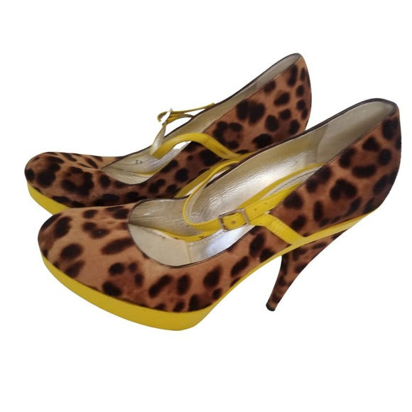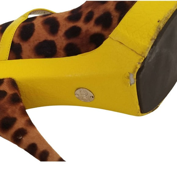 Dolce & Gabbana cheetah (feels like calf fur) with yellow leather trim platform stiletto high heels. Strap over foot. Graduated platform from .5" to 1". Round closed toe. Yellow foot bed with leopard shoe sitting on top. Cheetah print heel feels like calf fur.