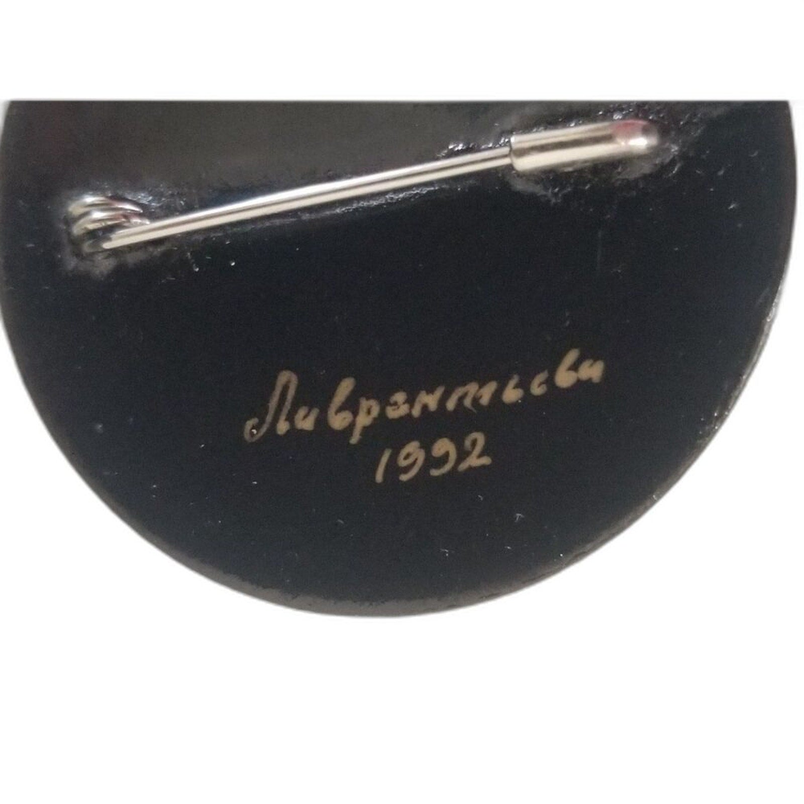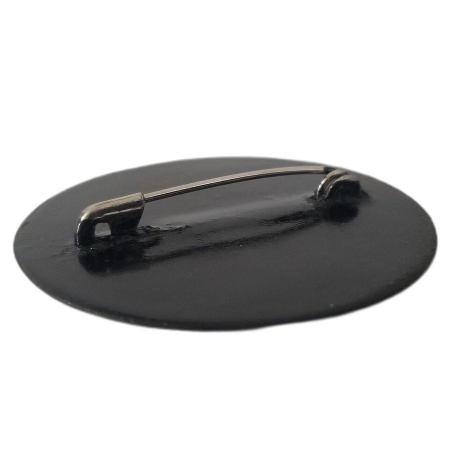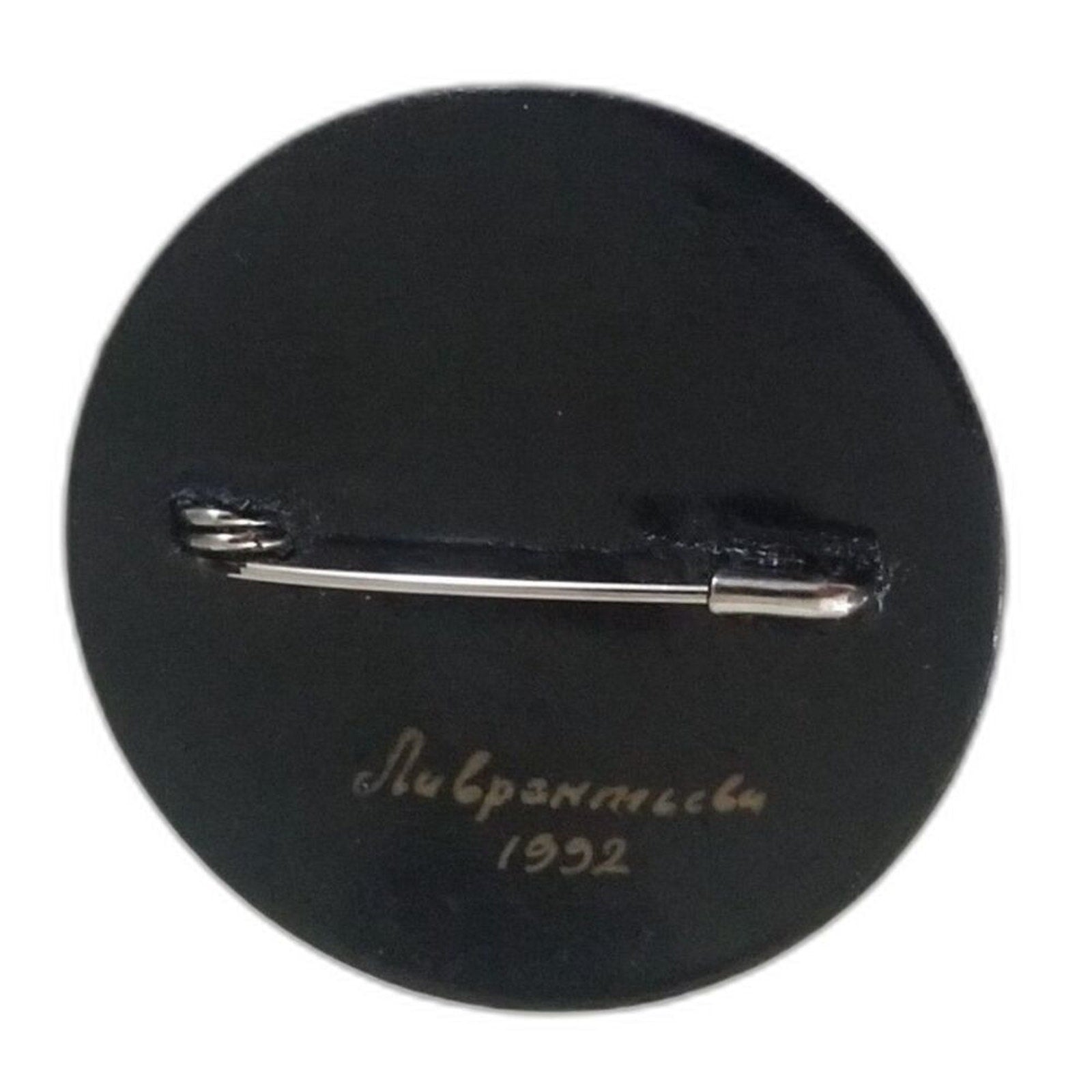 Eastern European Black Lacquer Floral Hand Painted Round Brooch