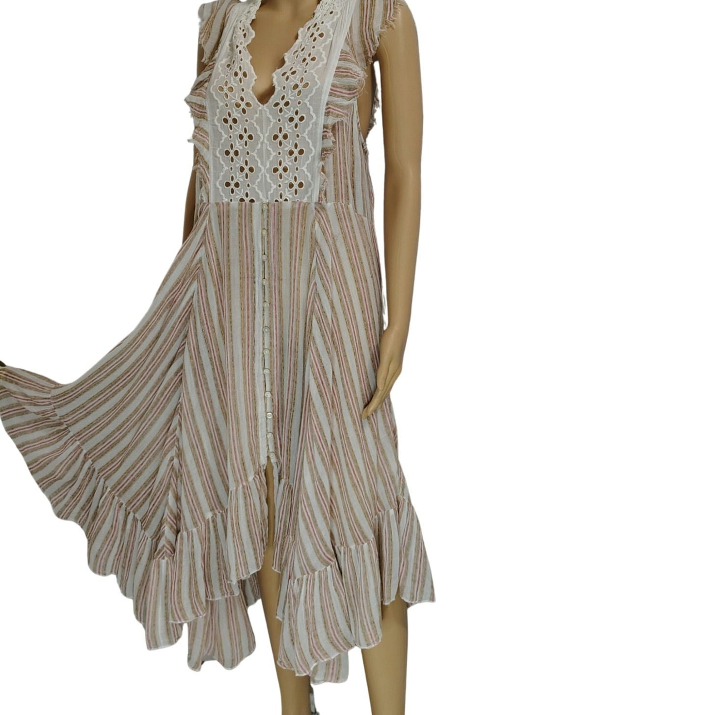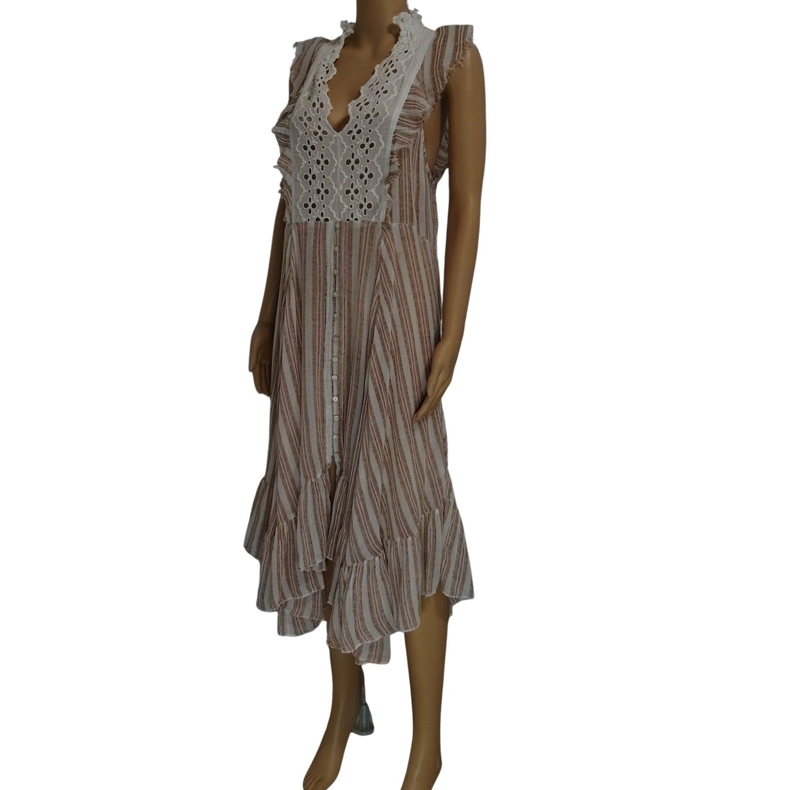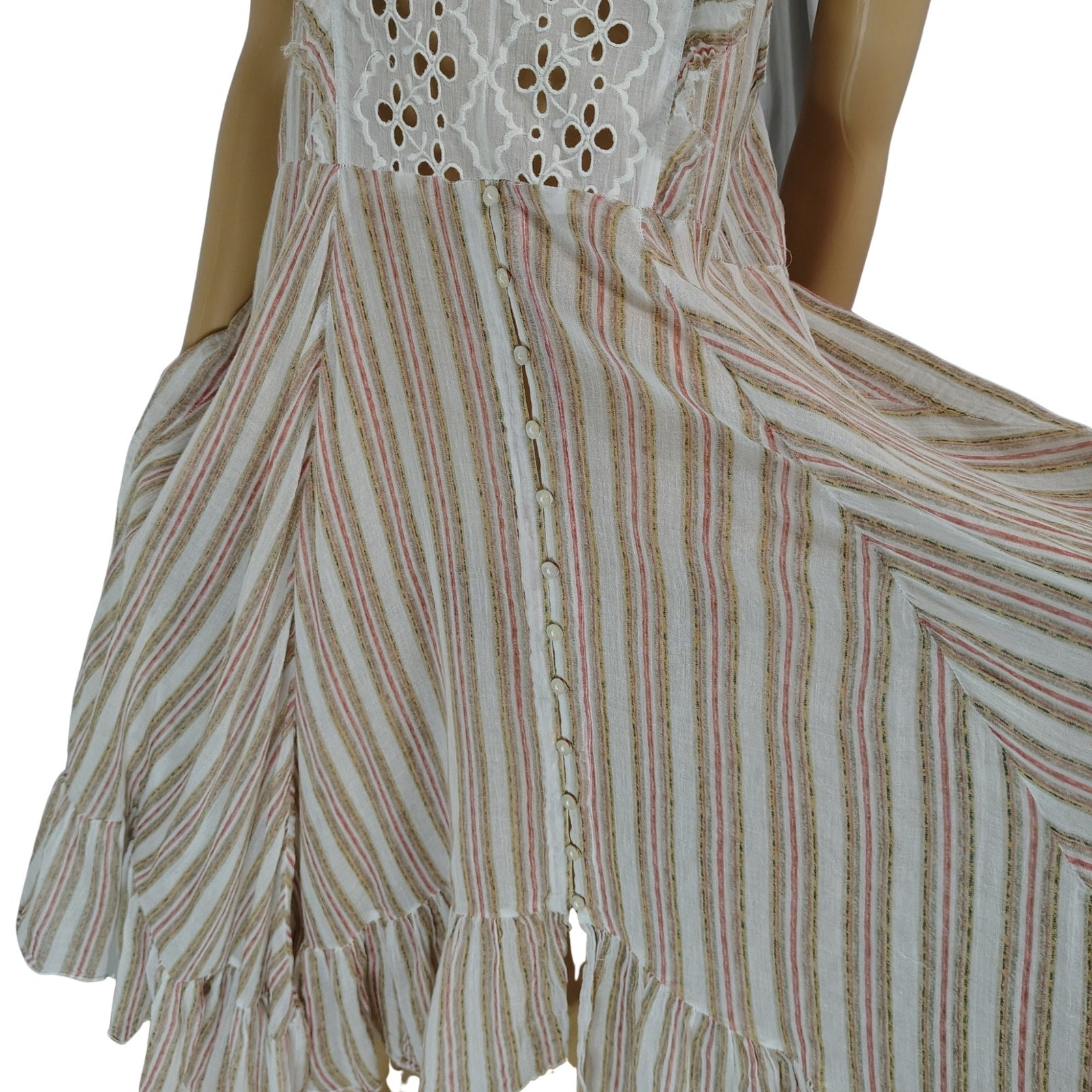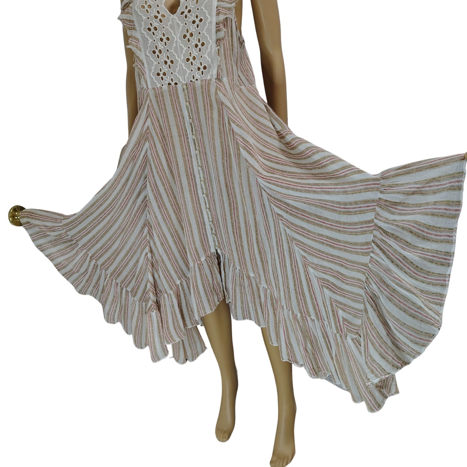 FP One Boho Brown White Fit & Flare Flowy Caraway Stripe Short Sleeve Sheer Uneven hem Long Dress. A closet staple with a hint of vintage inspiration. Eyelet white fabric chest and back area. Multi-color perpendicular stripes run down the entire run of the fabric. Full uneven hemline. Raw edges on side panels. Handkerchief hemline with 5 inch ruffle.