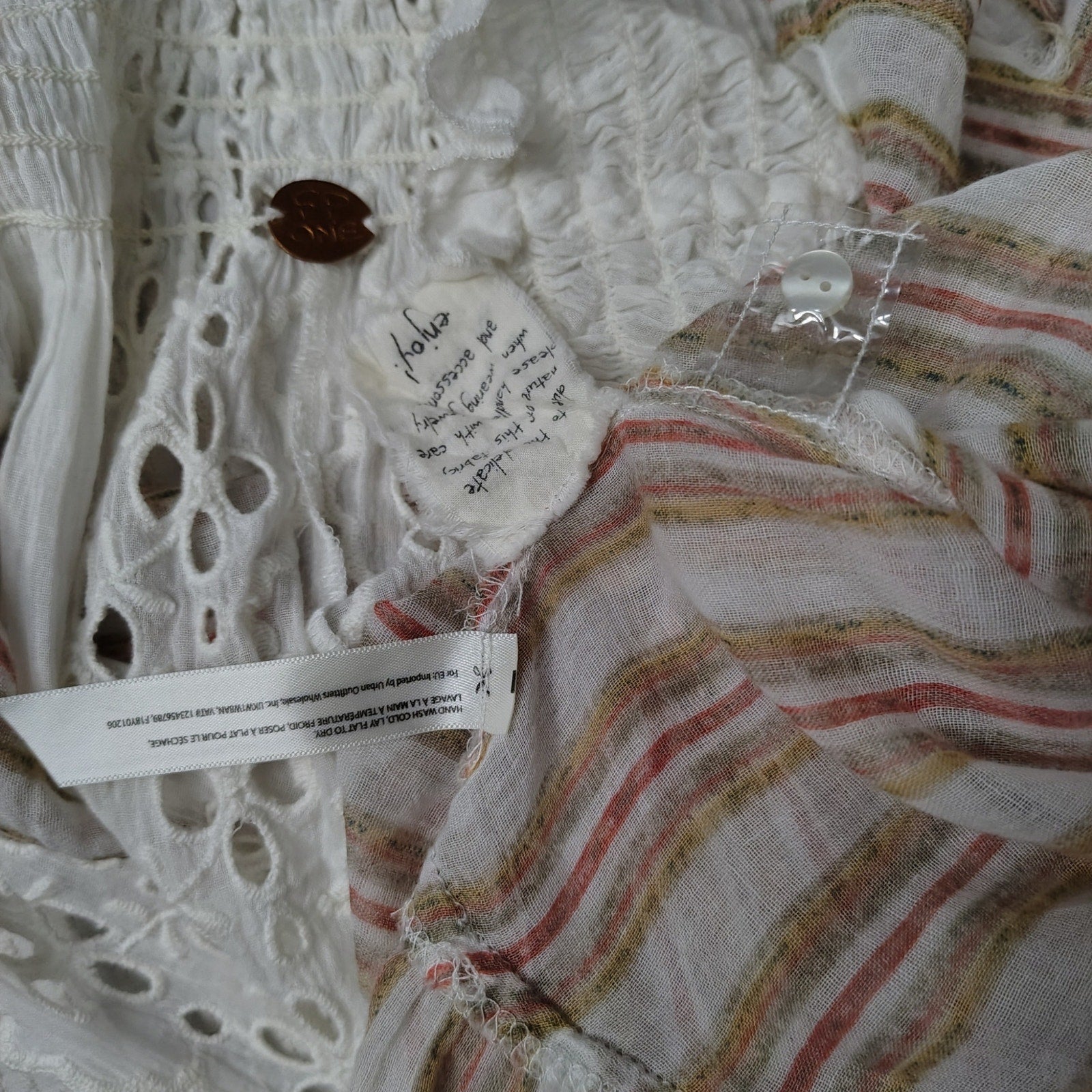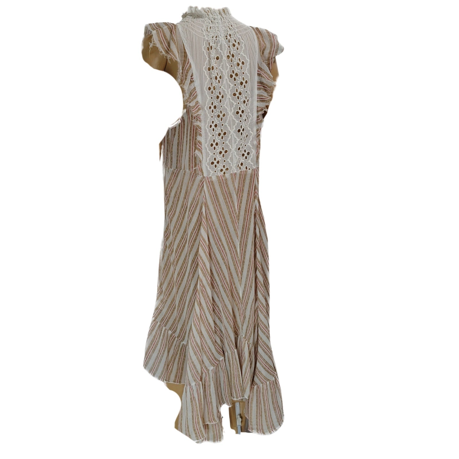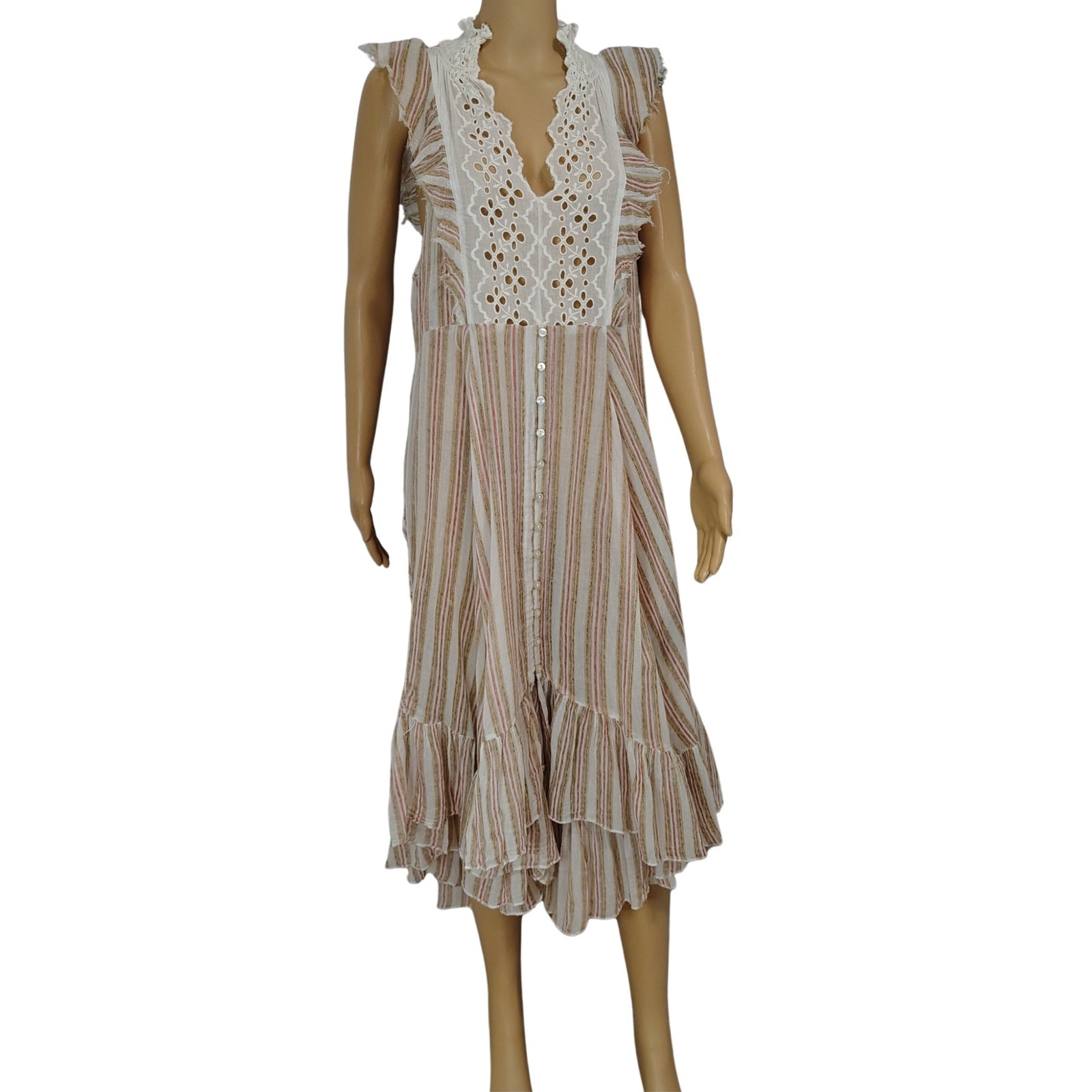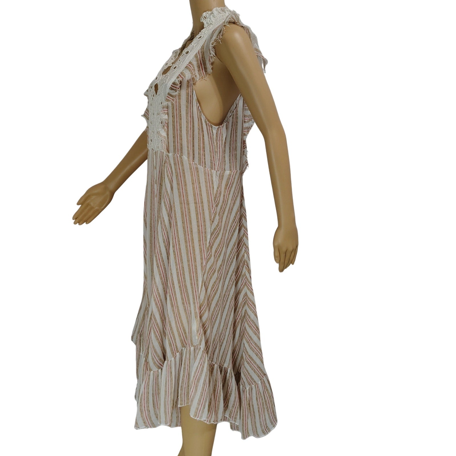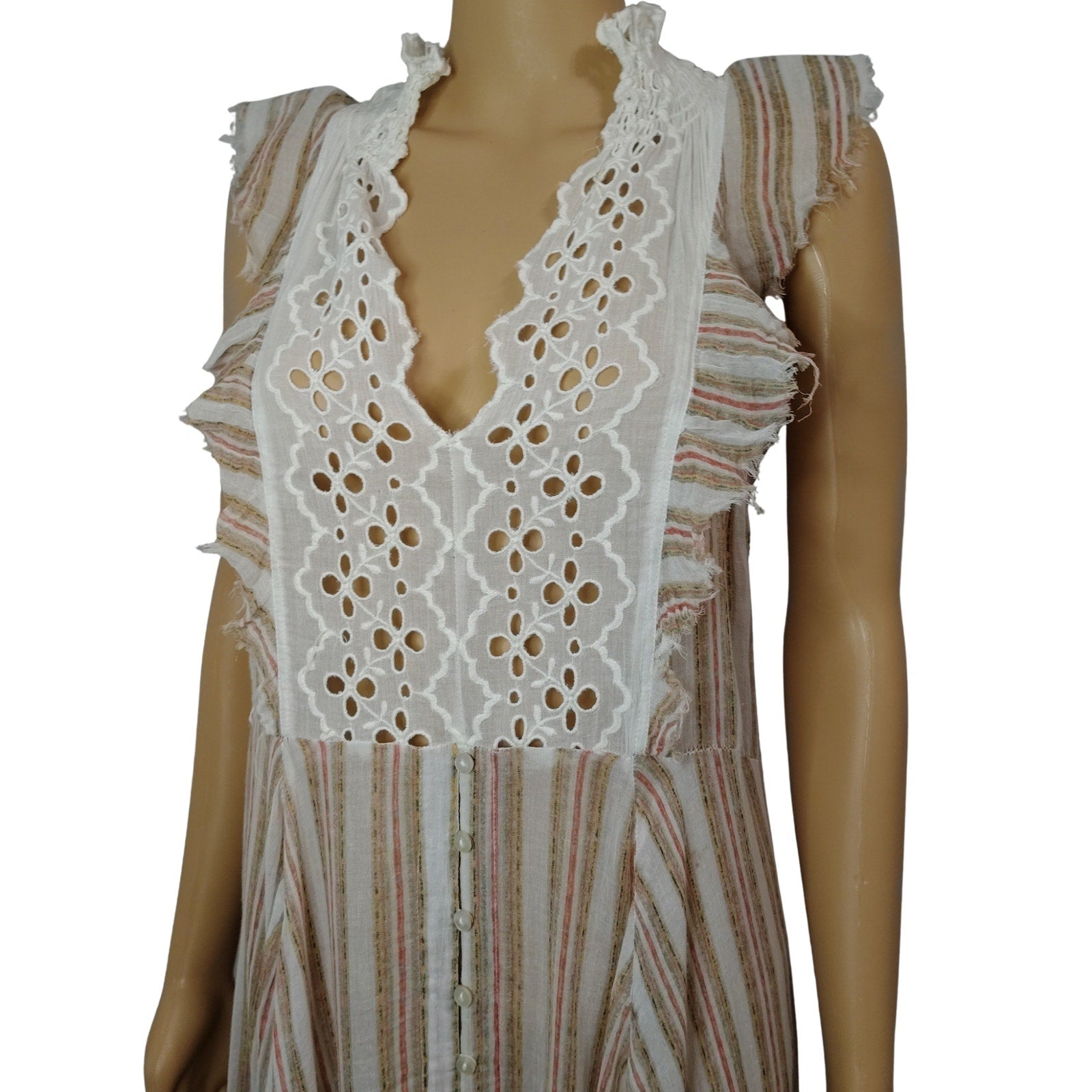 FP One Boho Brown White Fit & Flare Flowy Caraway Stripe Short Sleeve Sheer Uneven hem Long Dress. A closet staple with a hint of vintage inspiration. Eyelet white fabric chest and back area. Multi-color perpendicular stripes run down the entire run of the fabric. Full uneven hemline. Raw edges on side panels. Handkerchief hemline with 5 inch ruffle.