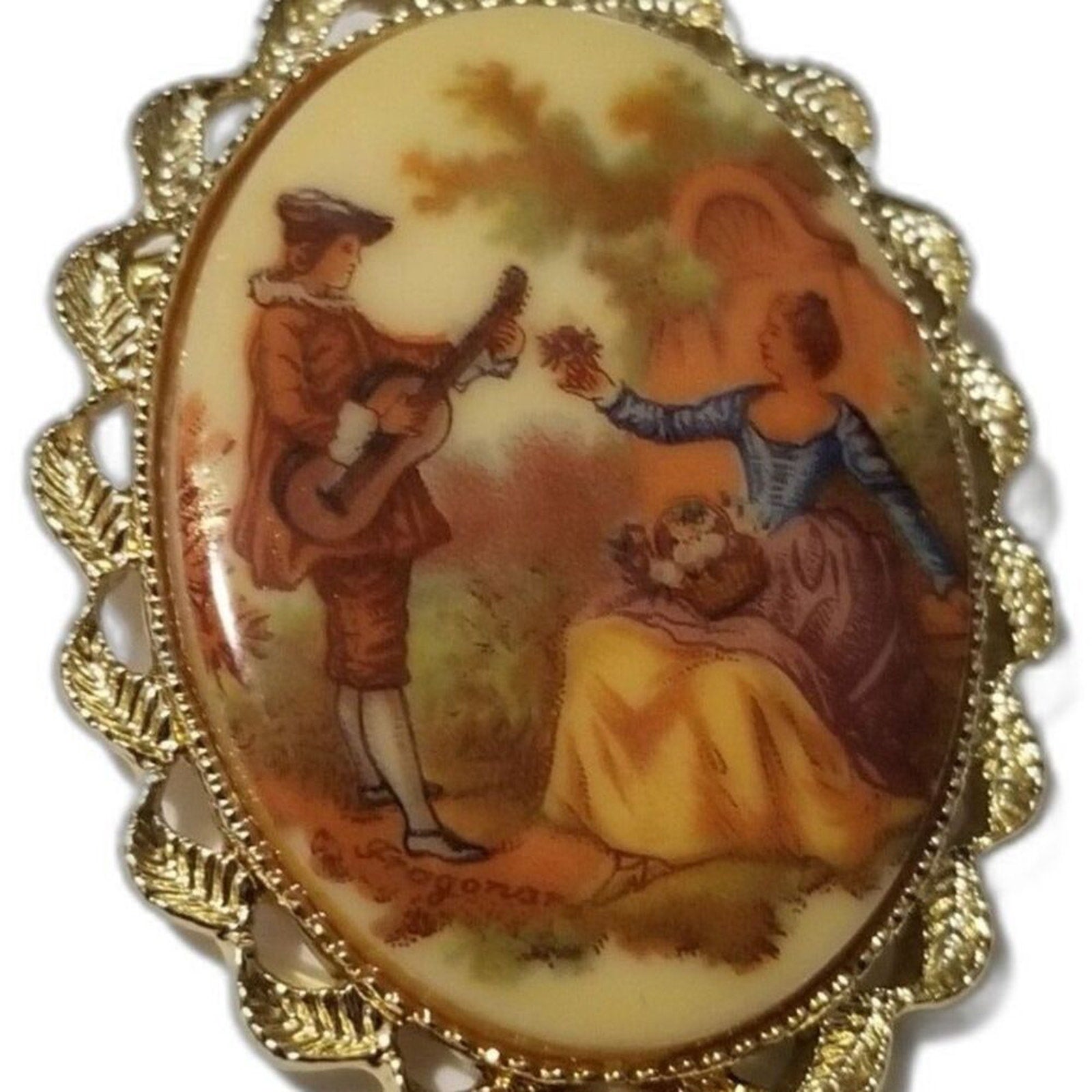 Vintage Fragonard Victorian Design Oval Courting Lover Brooch Gold Scallop Frame