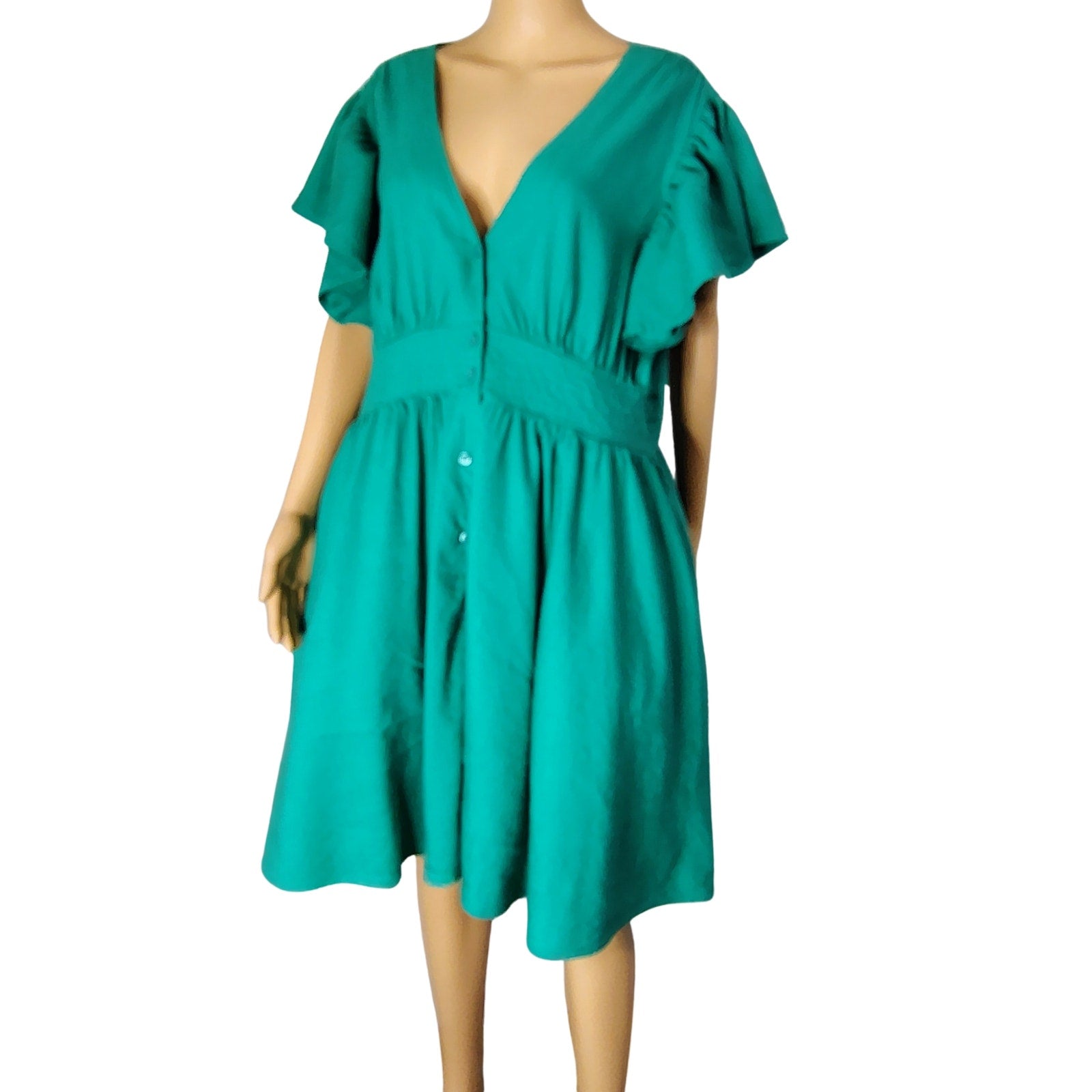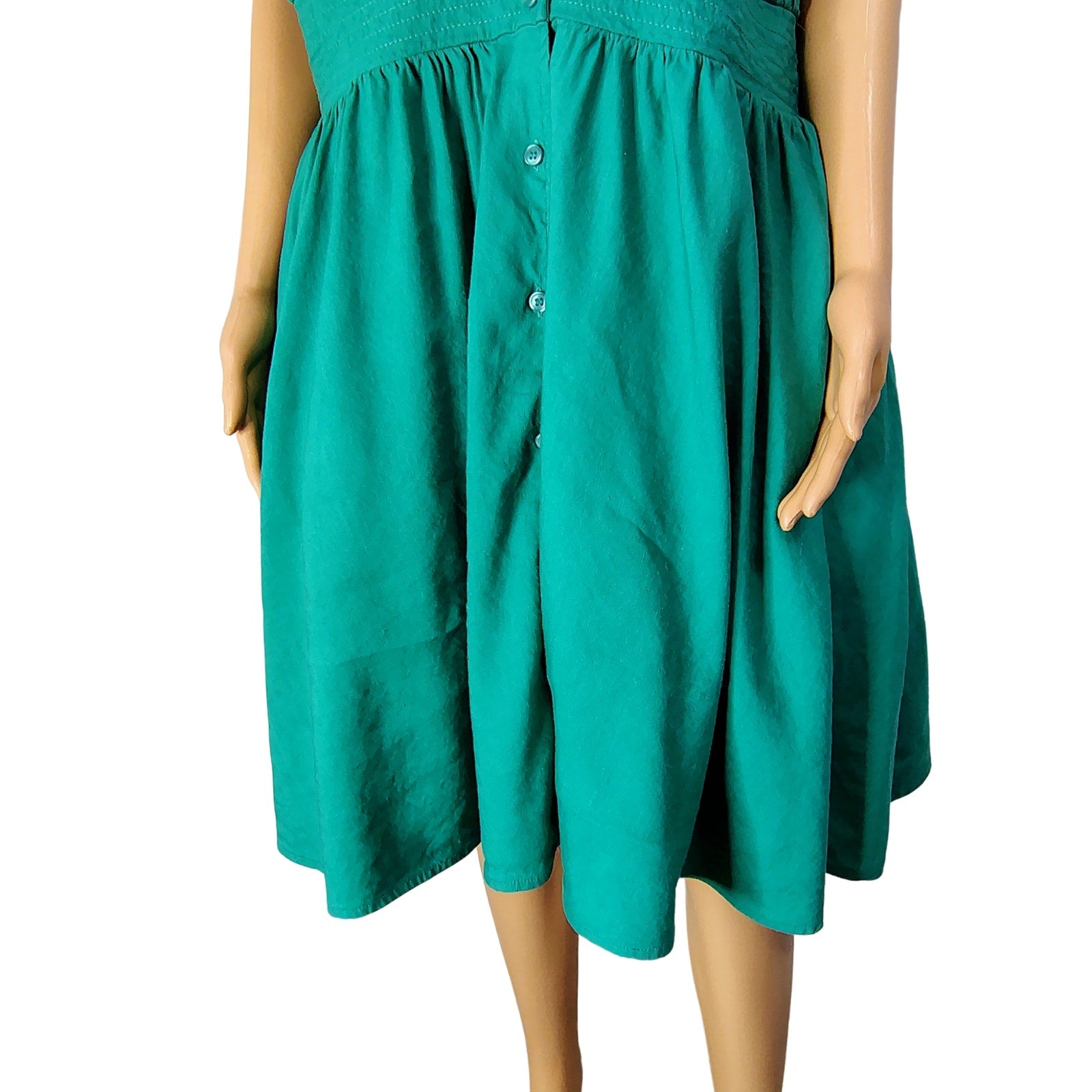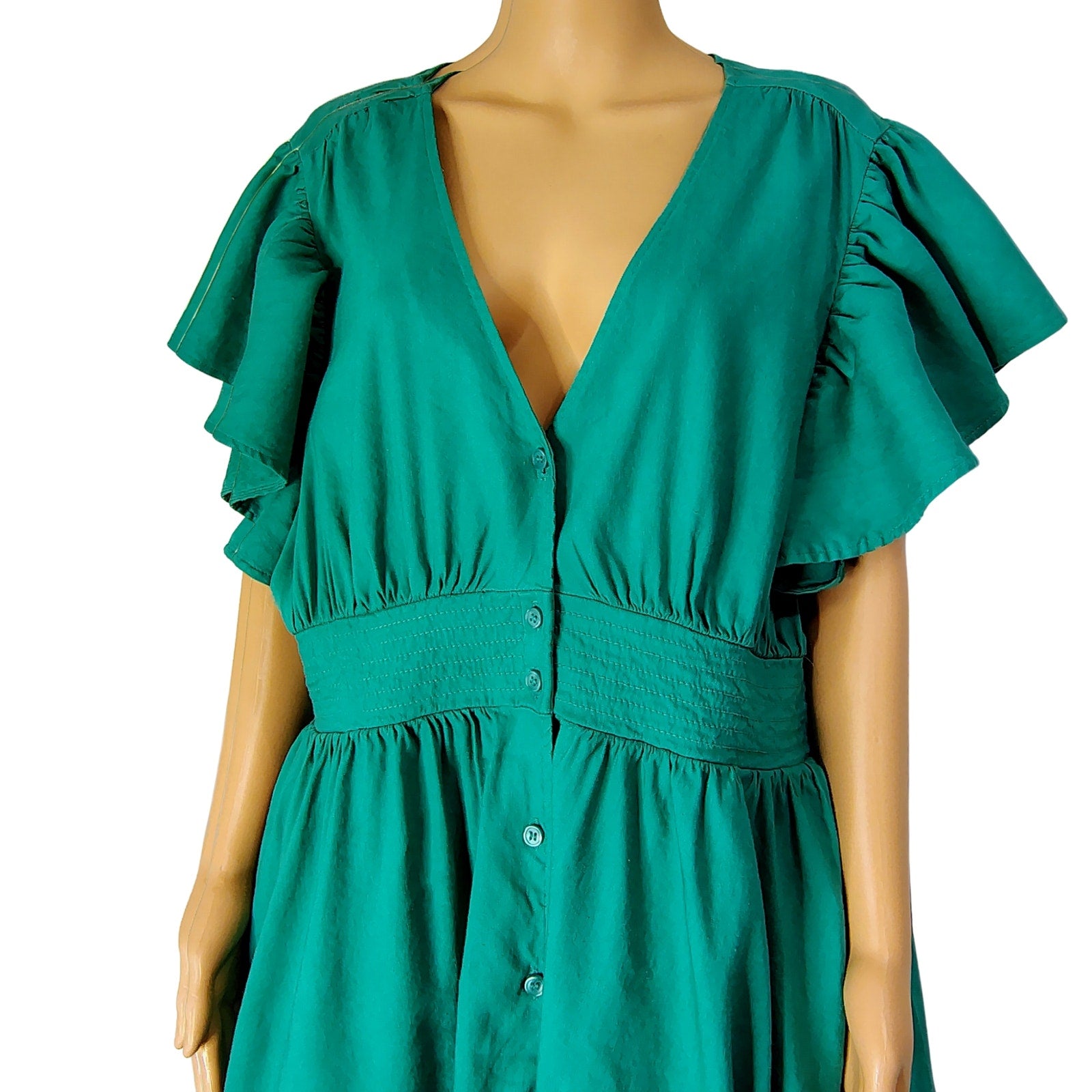 Green Nordstrom Chelsea 28 Fit & Flare Button Front Midi Short Ruffle Cap Sleeve Dress. Quilted waist band design. One pocket on each side of the hips.