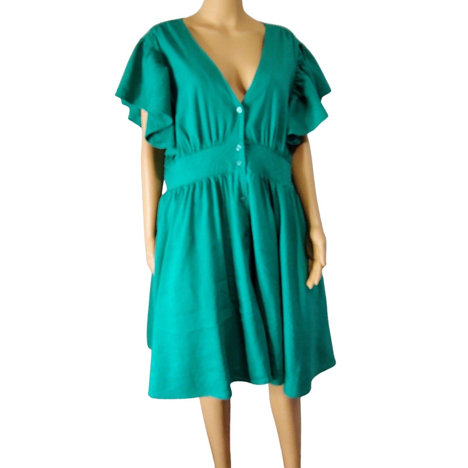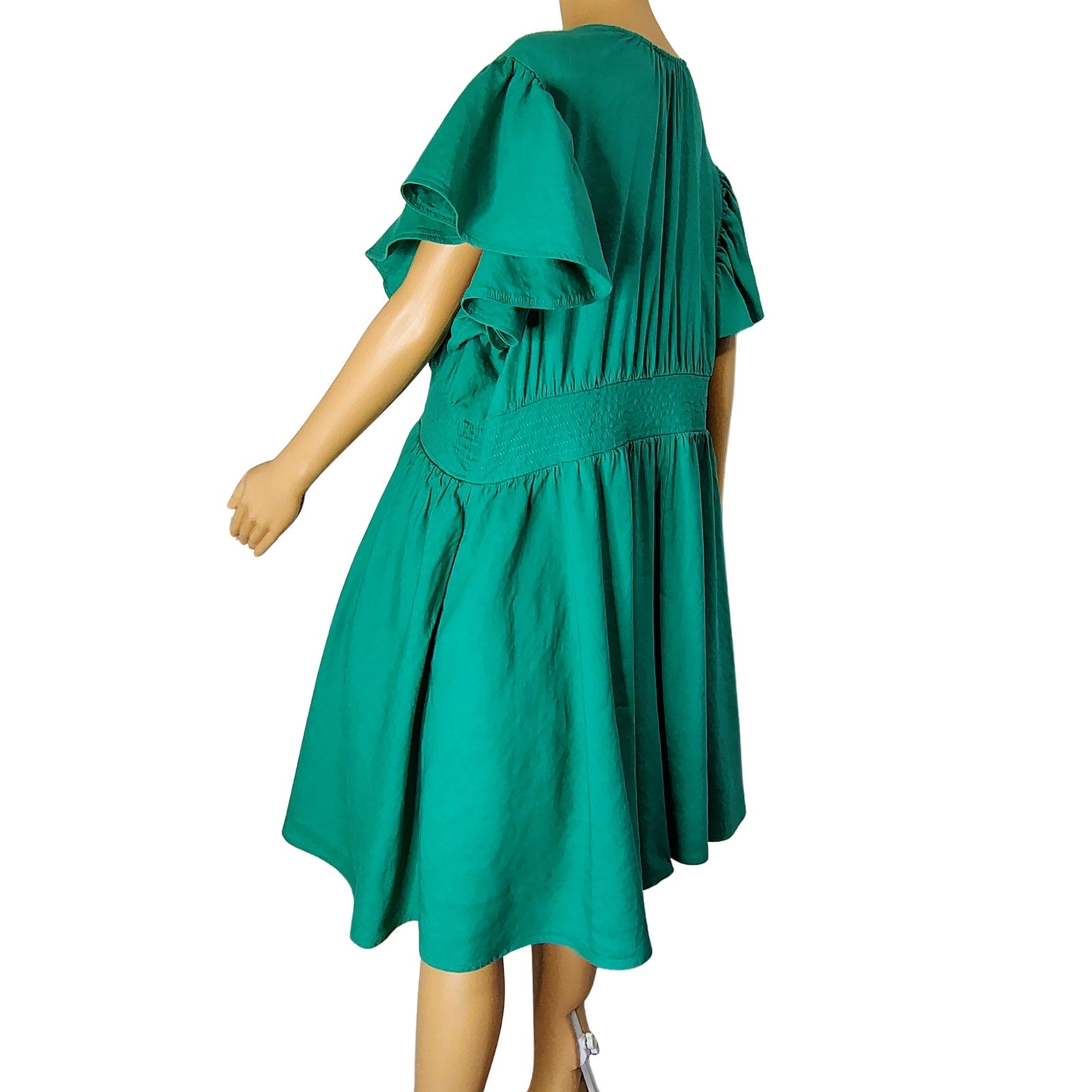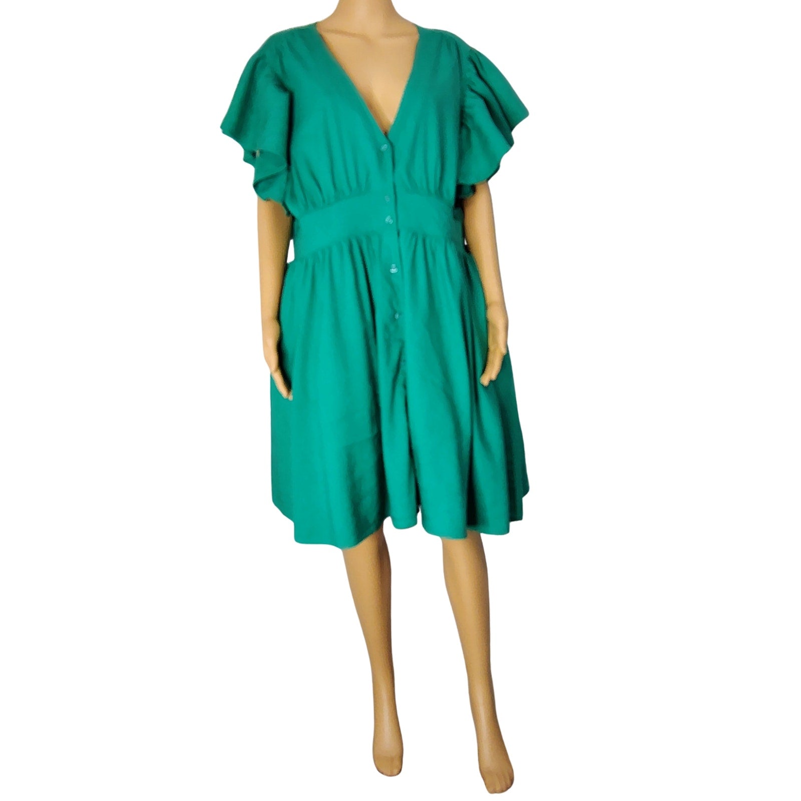 Green Nordstrom Chelsea 28 Fit & Flare Button Front Midi Short Ruffle Cap Sleeve Dress. Quilted waist band design. One pocket on each side of the hips.