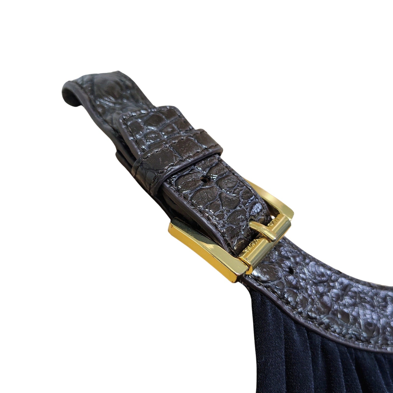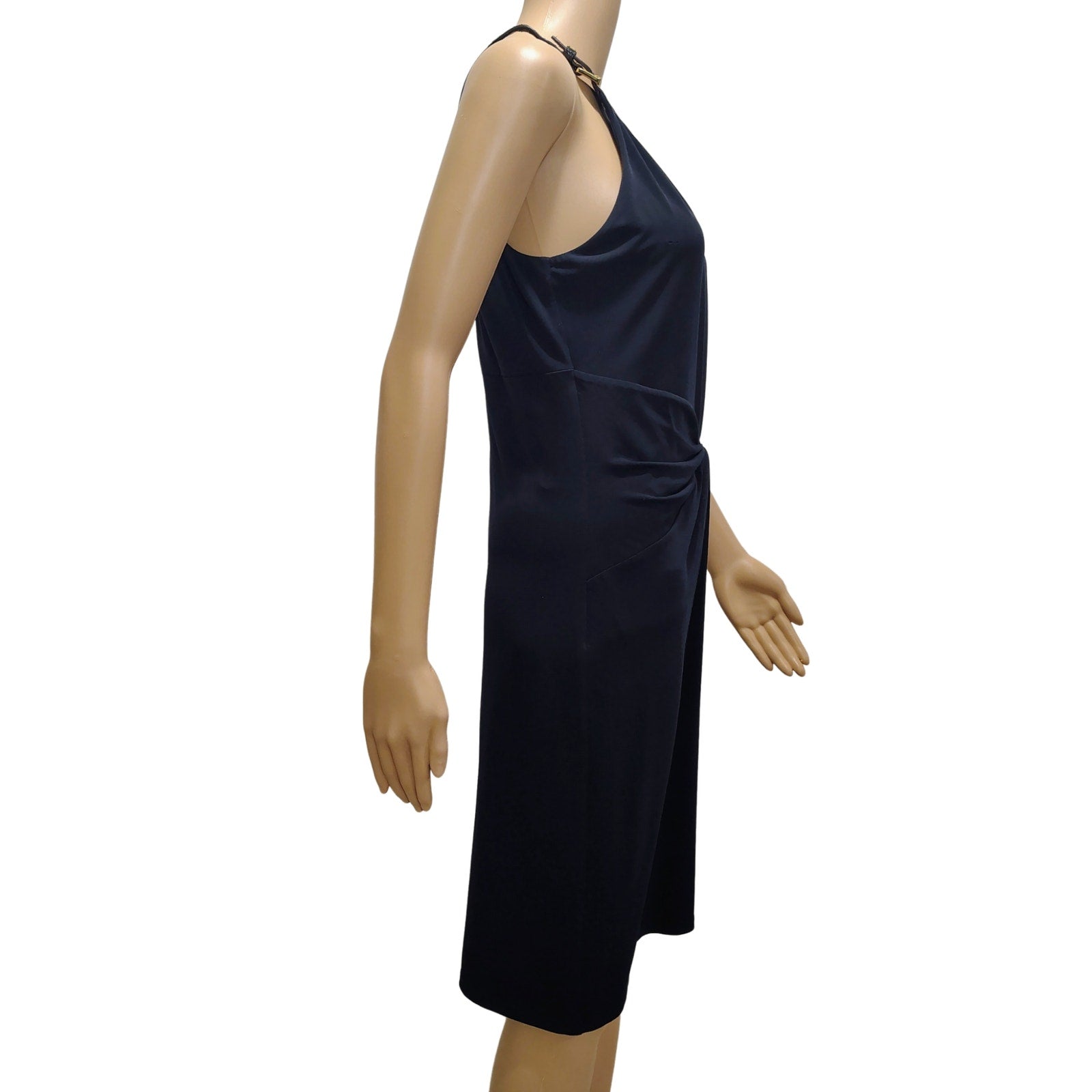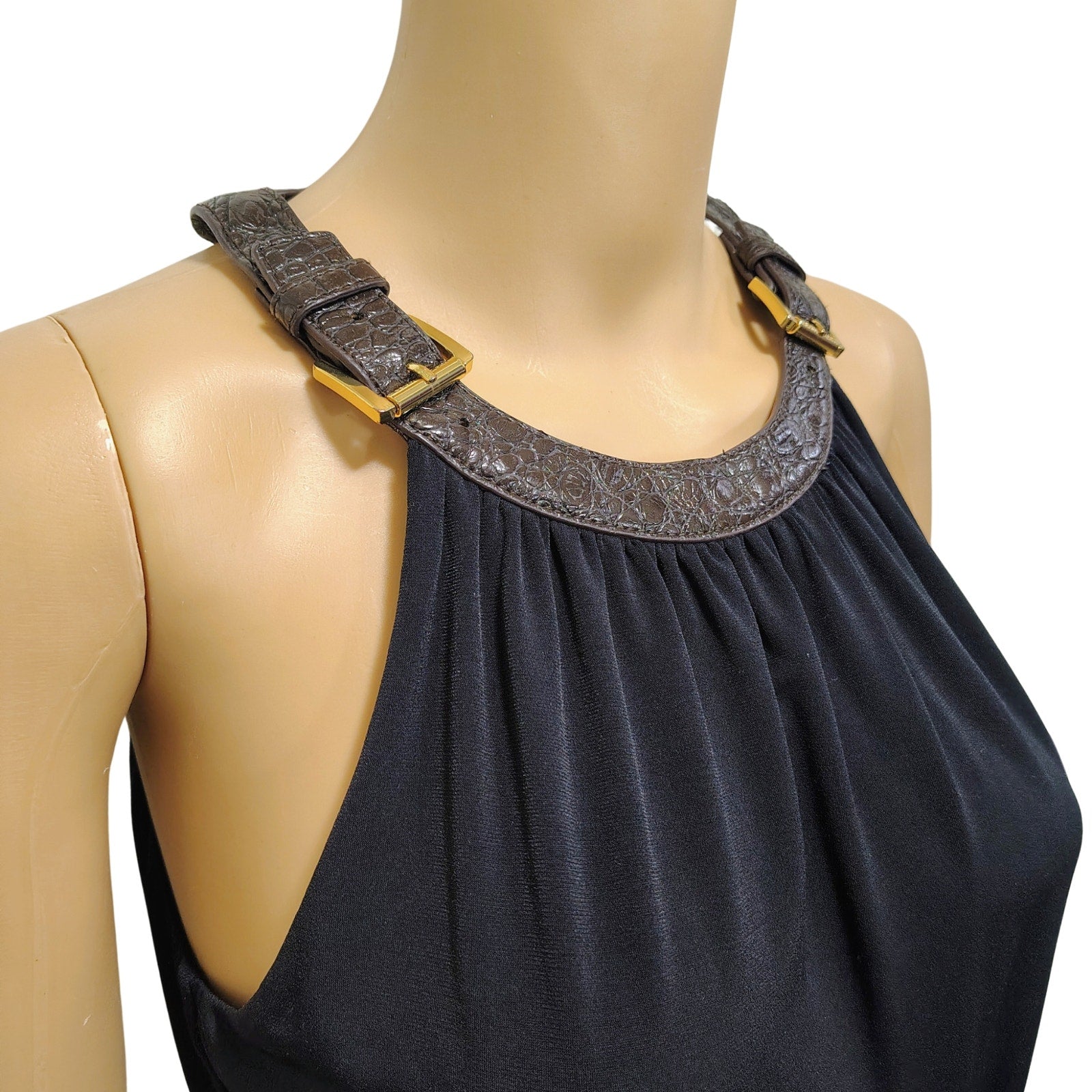 Halter black ruched dress. Brown Leather Collar on Black Bodycon Midi Dress. Ruched at waist. Hidden back zipper. Buckle detail over each shoulder. Slightly gathered neckline.
