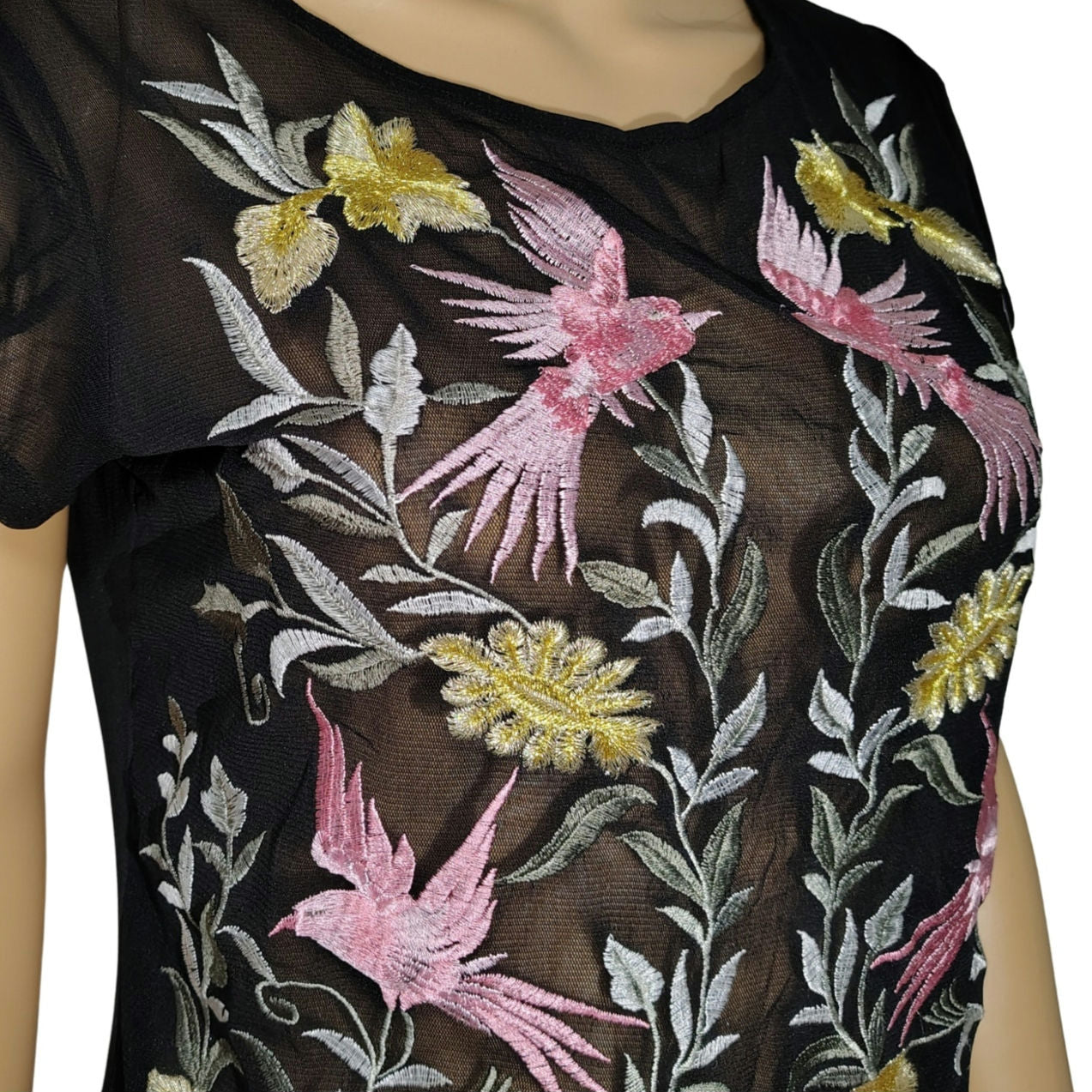 INC International Concepts Short Sleeves Sheer Hummingbird Metallic Embroidered Top without Cami. Ornately embroidered with vibrant metallic gold thread plus pink, green and silver. Crew neckline.