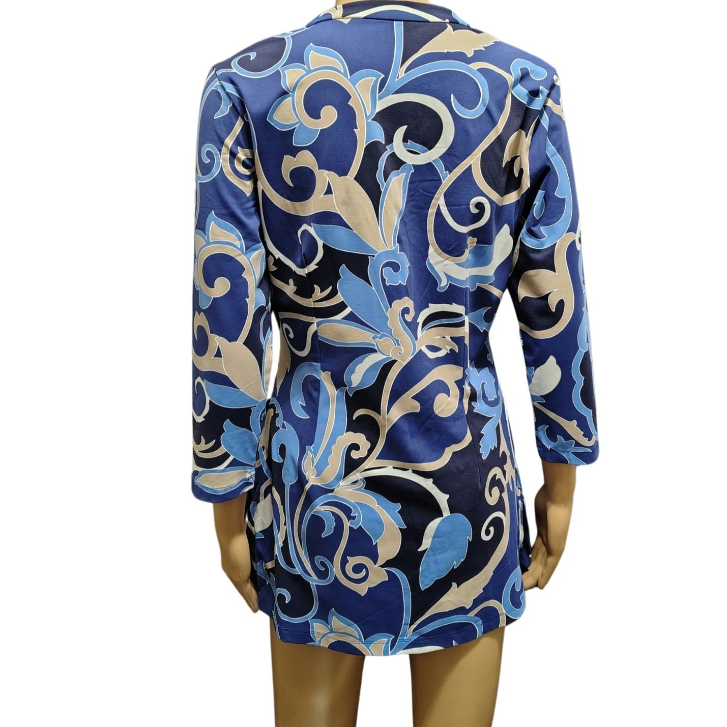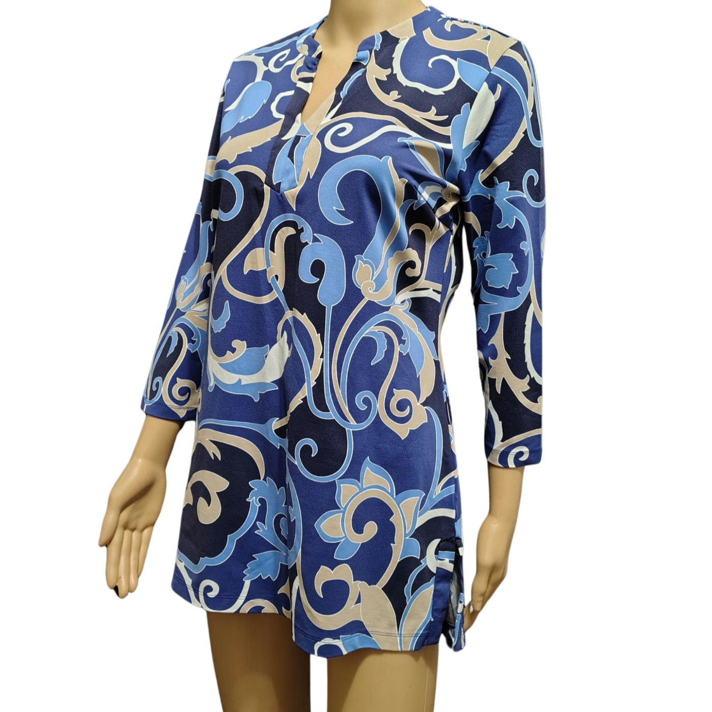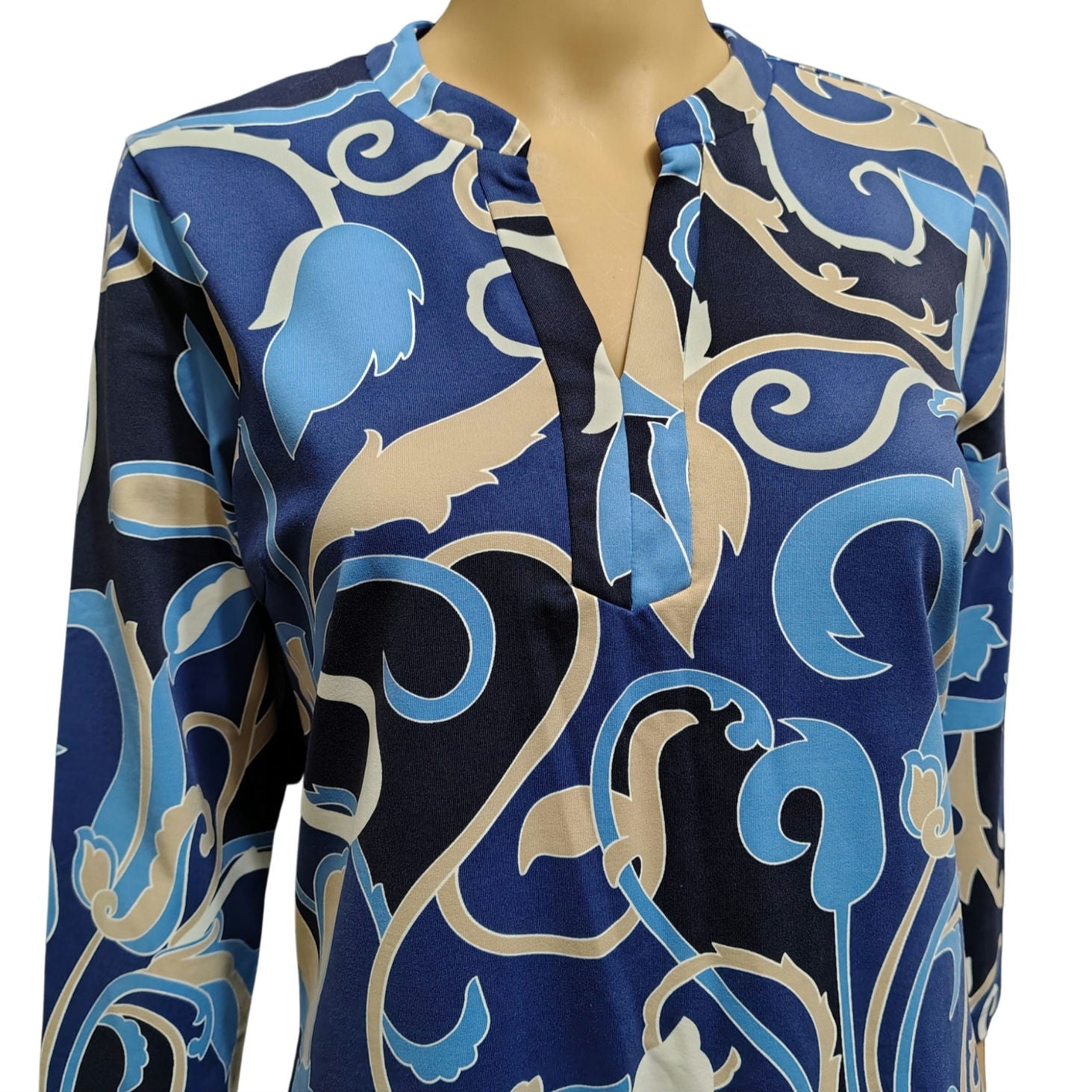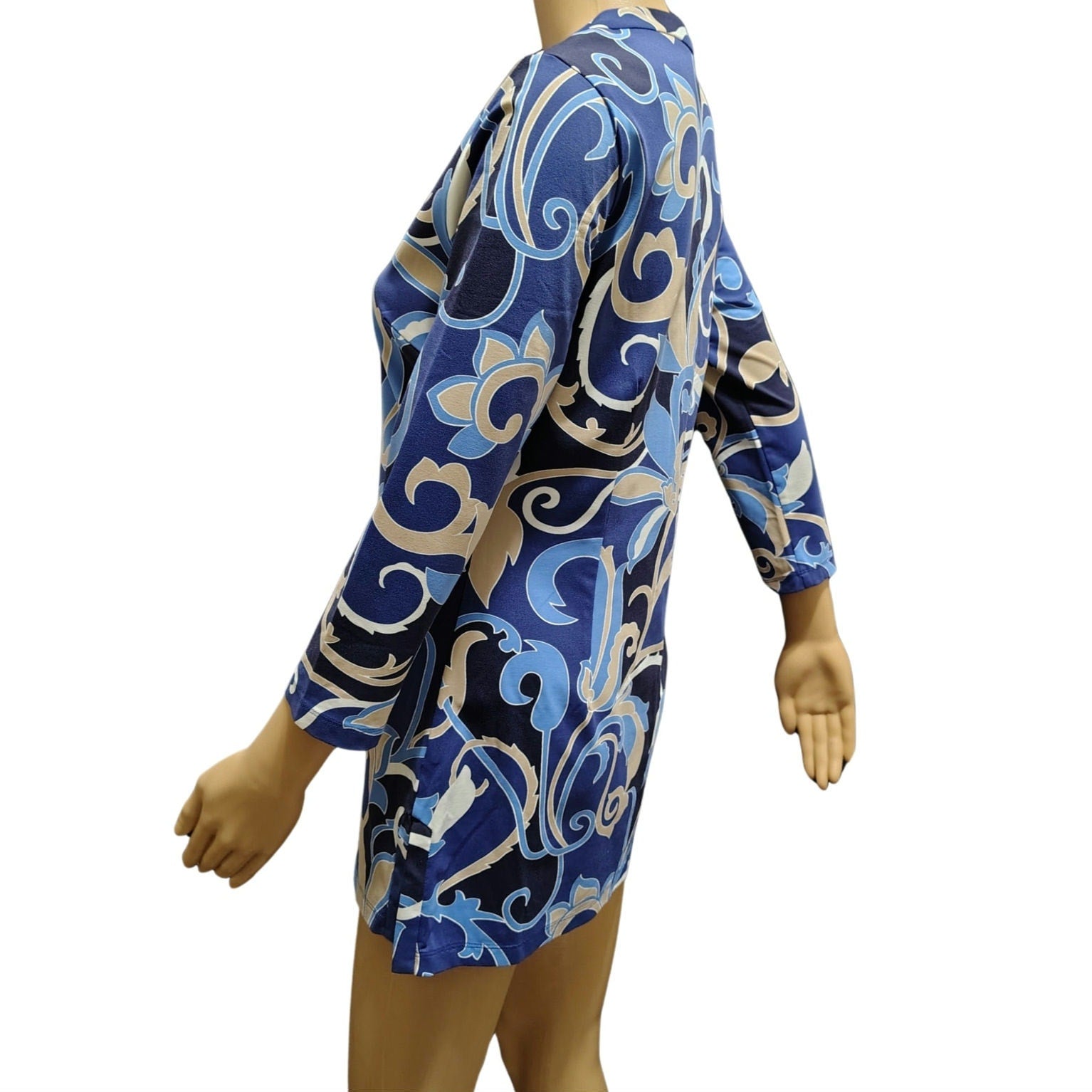 J. McLaughlin Blue Paisley 3/4 Sleeve Tunic Top Catalina Cloth V-Neck Size Small