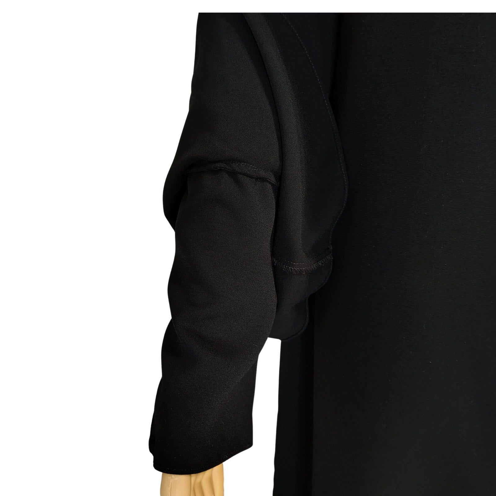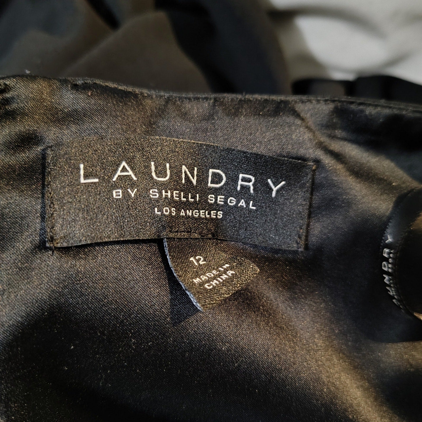 Laundry Shelli Segal Convertible Black Midi Sheath Dress. Straight sleeve is hidden under the ruffles. Sleeve disconnects with loop & button closures to reveal a 3/4 sleeve. Same closures on the chest can be opened for a peep hole effect. Long back zipper. Lined.