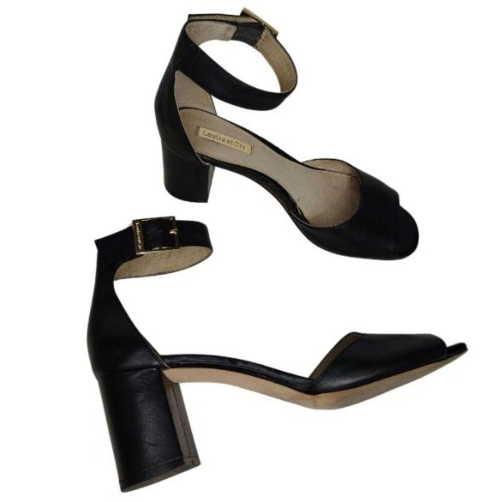 Louise et Cie Karisa black leather ankle strap open toe block heel sandals. Metal gold tone logo on inside of shoe. Logo etched into clasps. Rounded on top of foot. Heel protector.