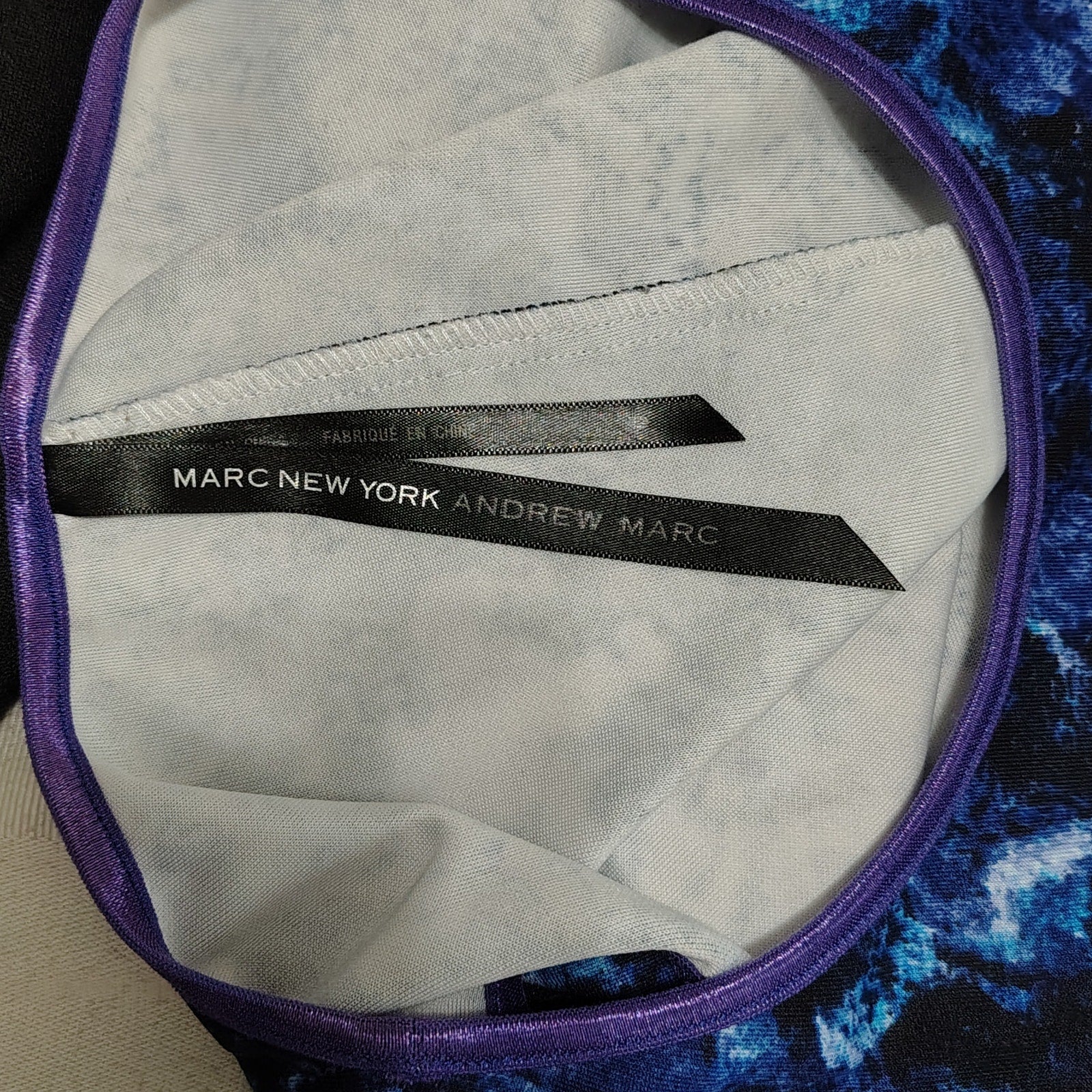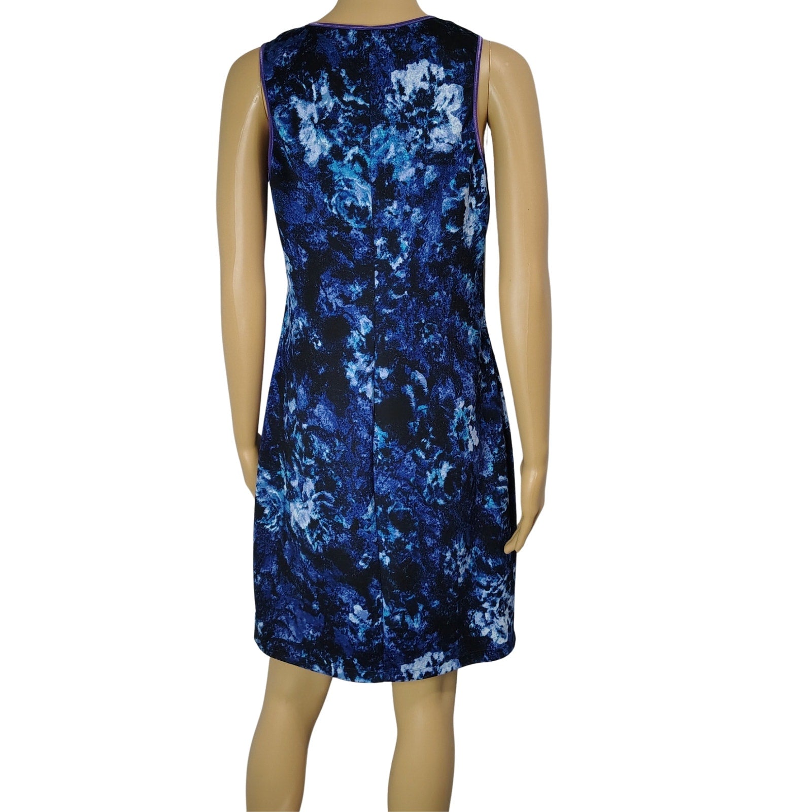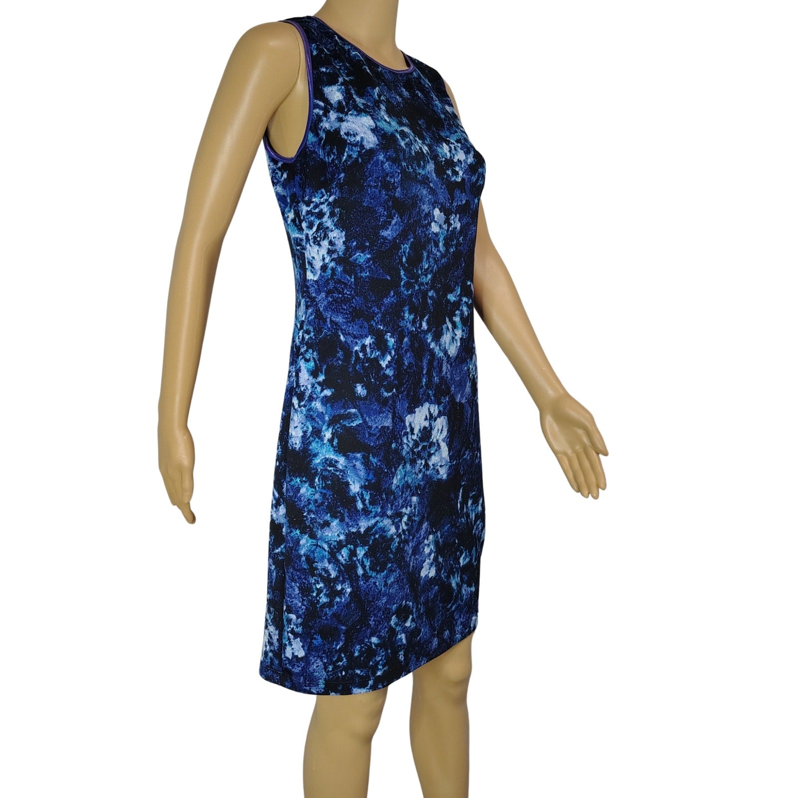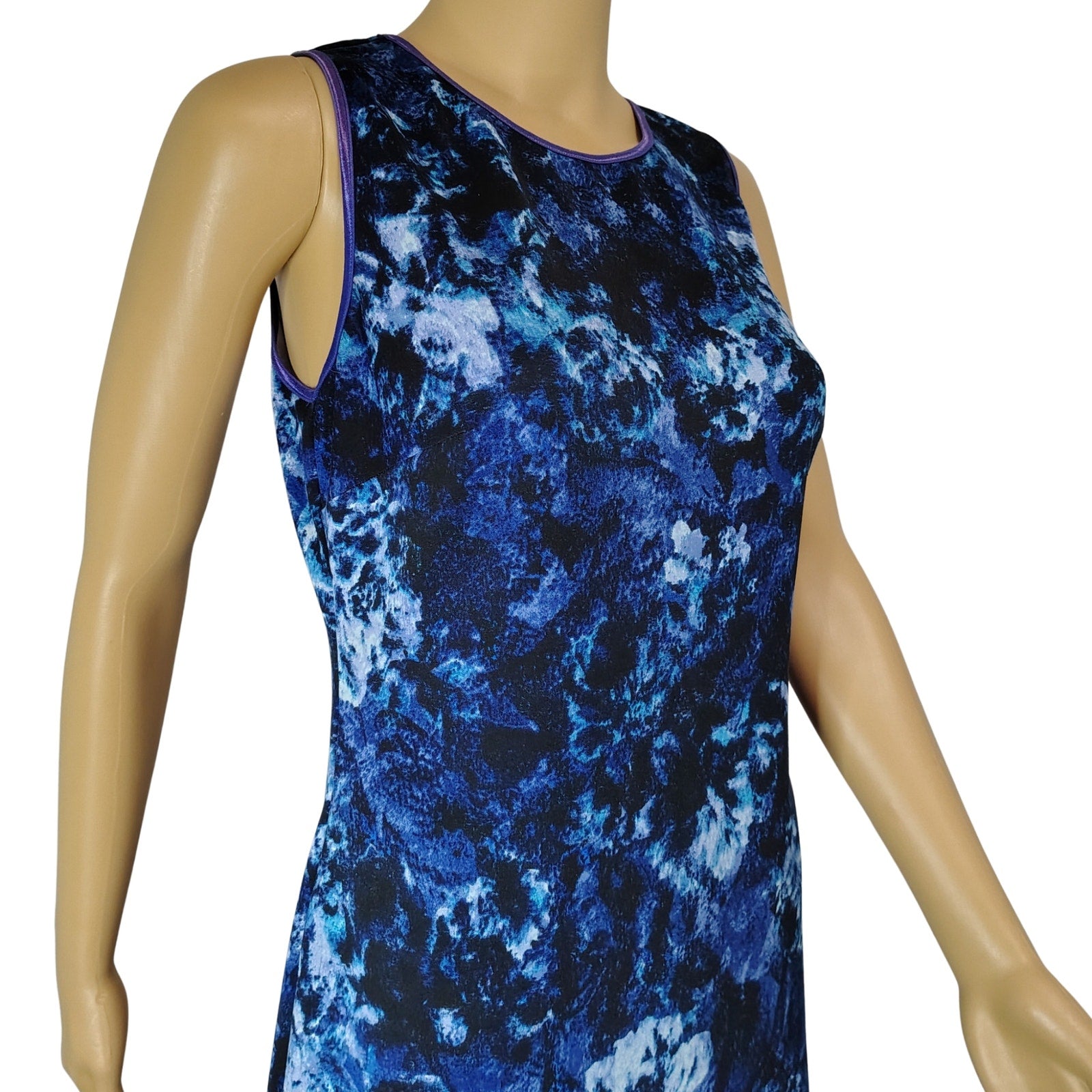 MARC NEW YORK Blue Purple Abstract Bodycon Sleeveless Midi Shift Dress. High neck. Purple elastic trim. Darted at chest with back seam.