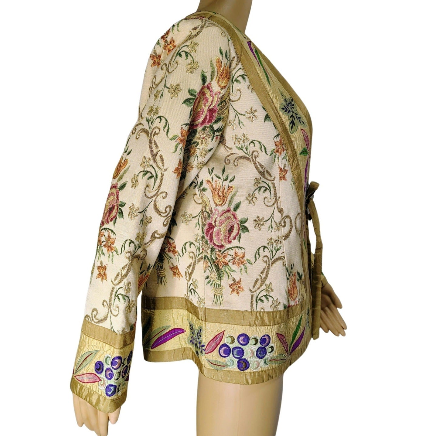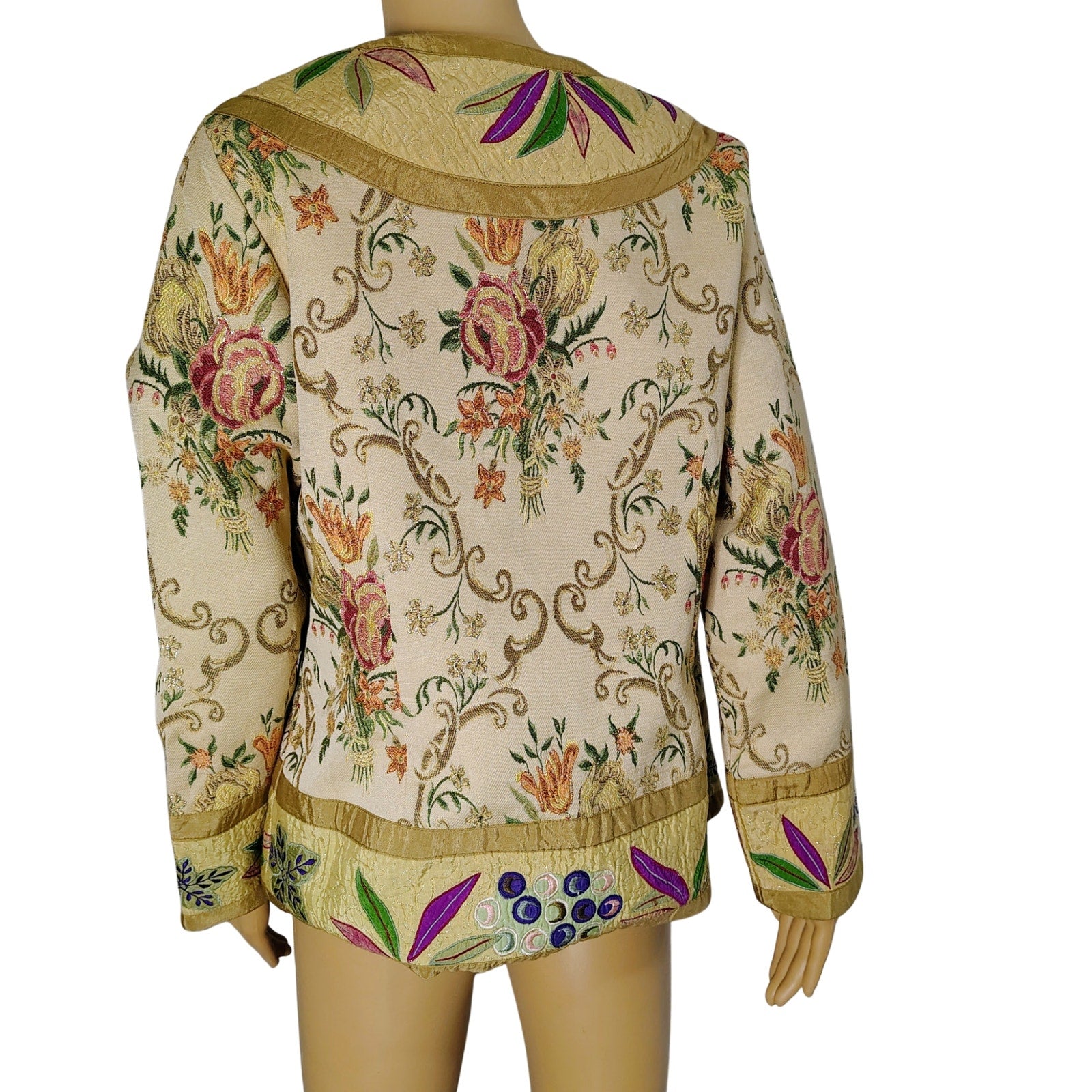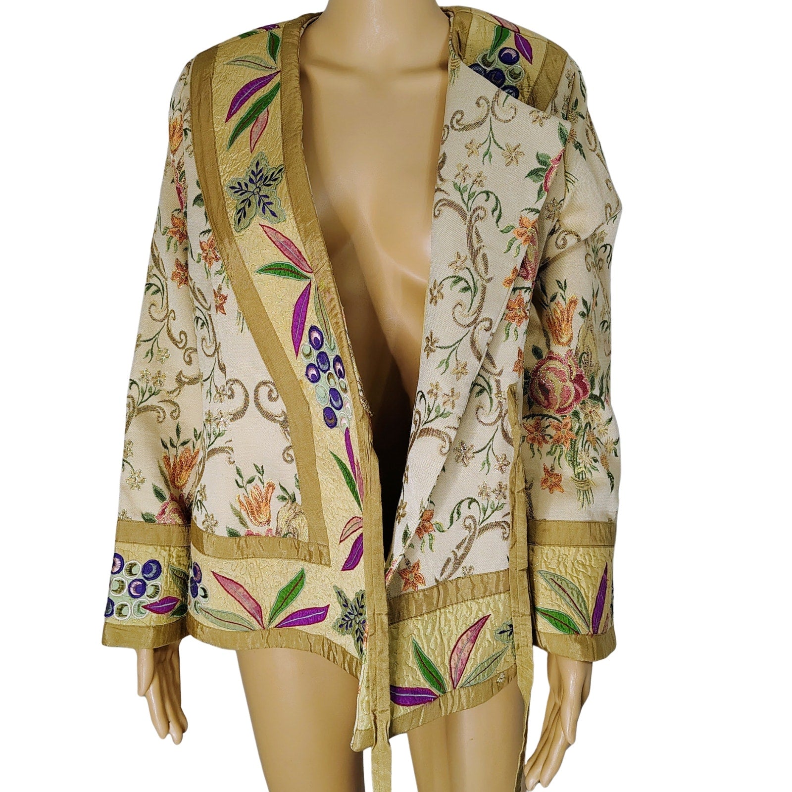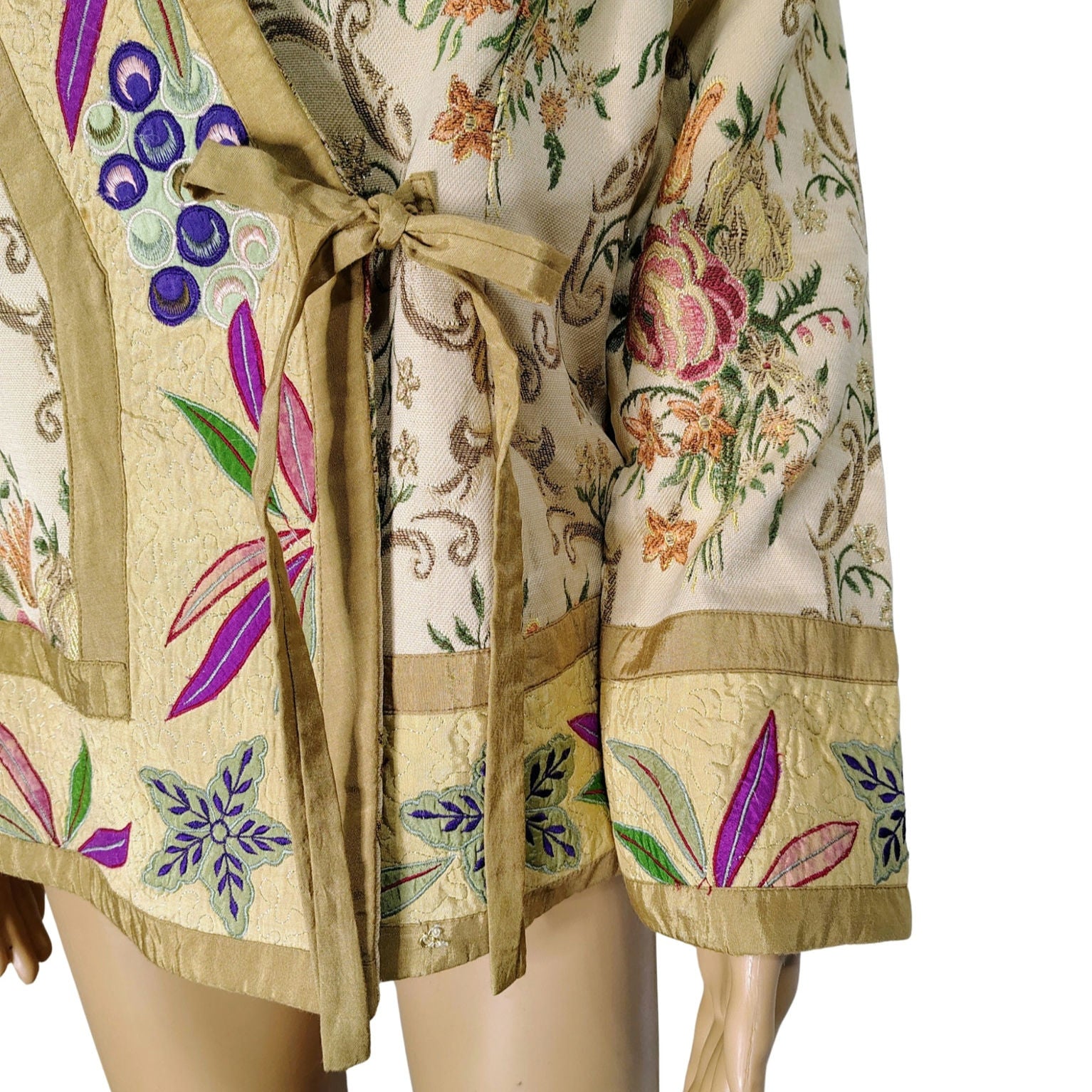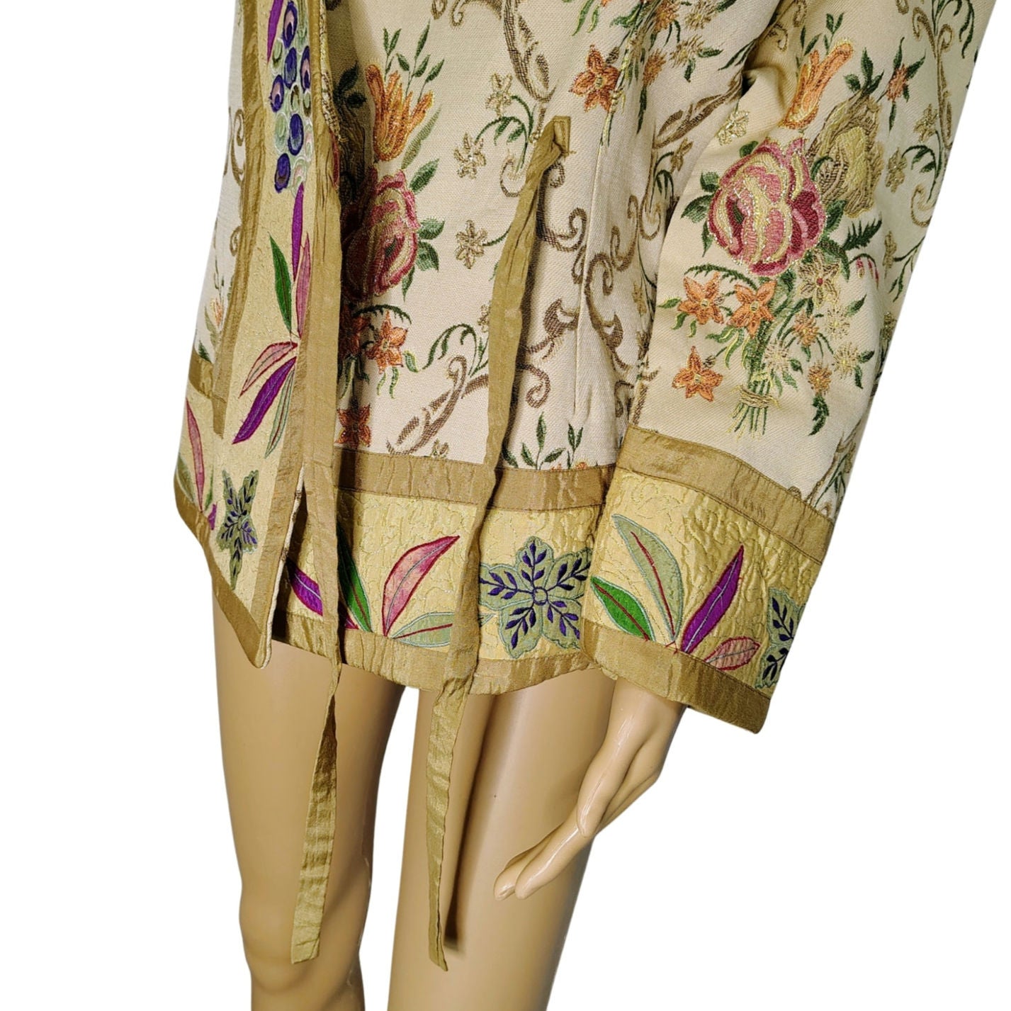 Metallic Thread Custom Beige Patchwork Floral Kimono Embroidered Size Small Womens