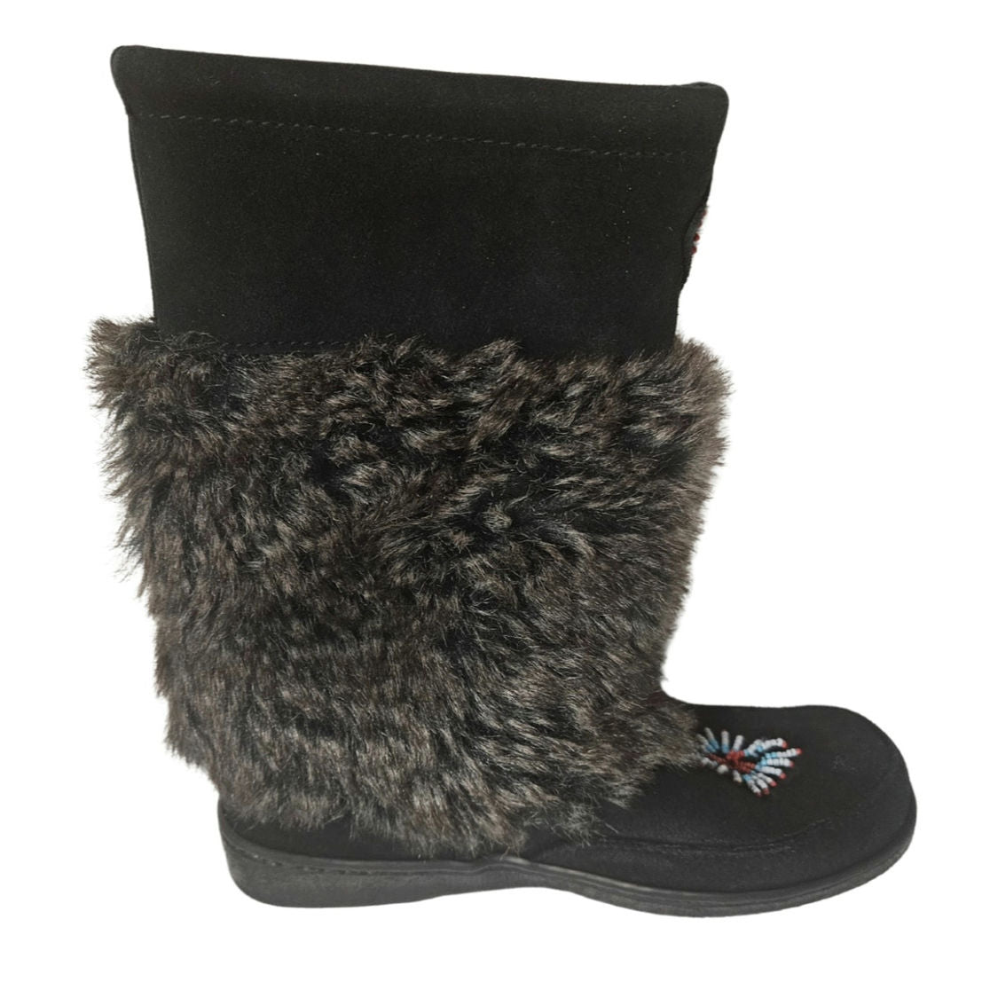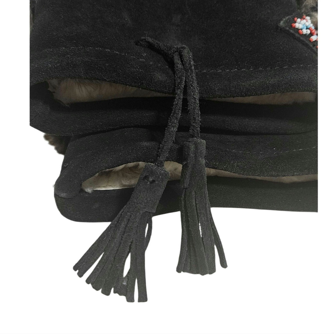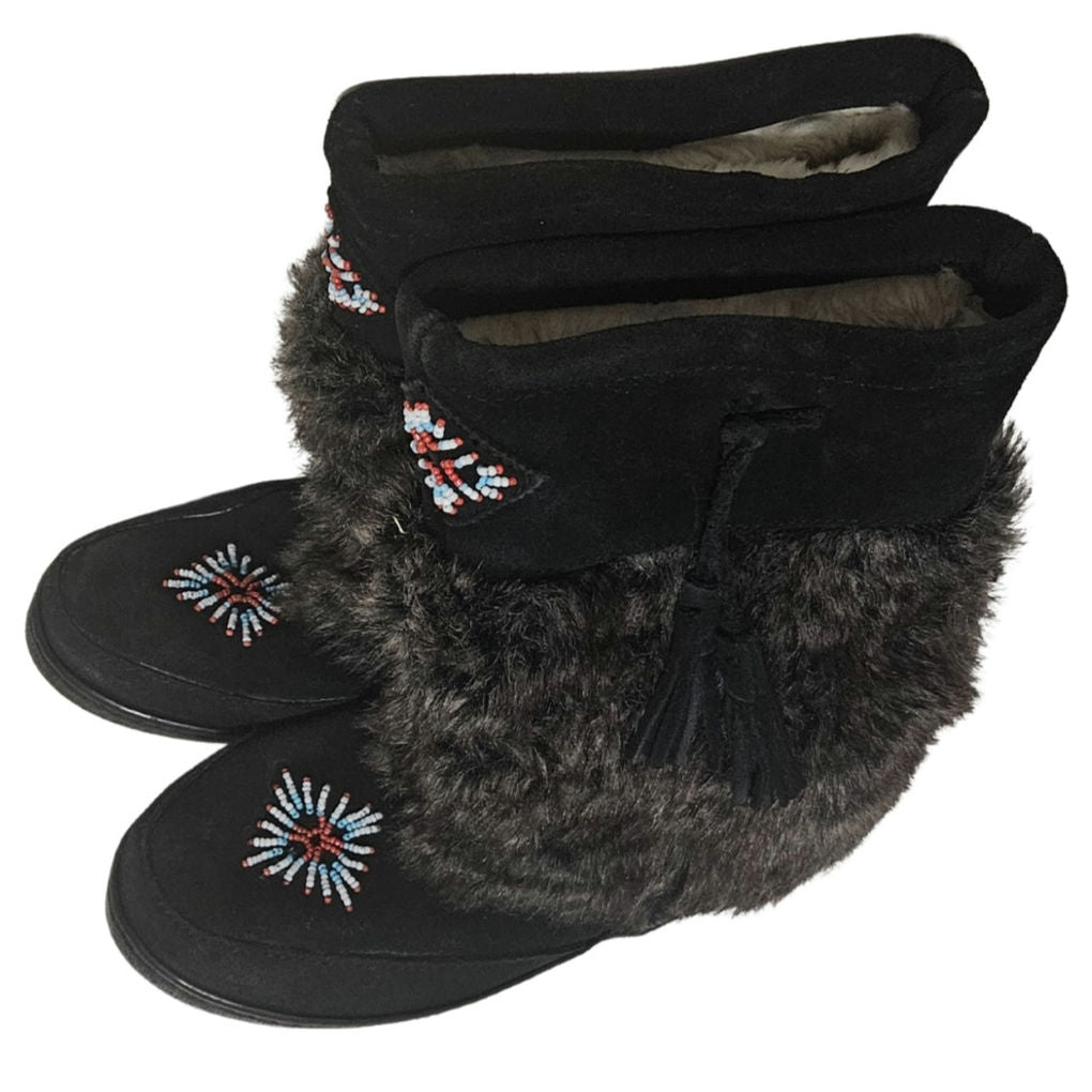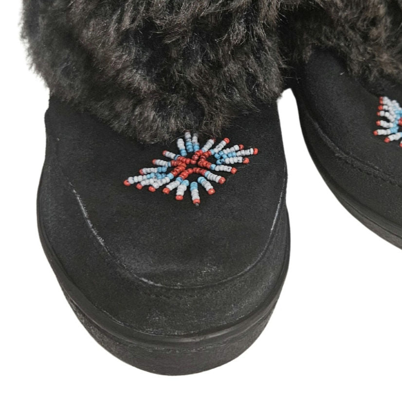 Minnetonka Mukluk Bead Detail Black Genuine Suede Leather Faux Fur Size 7 Womens