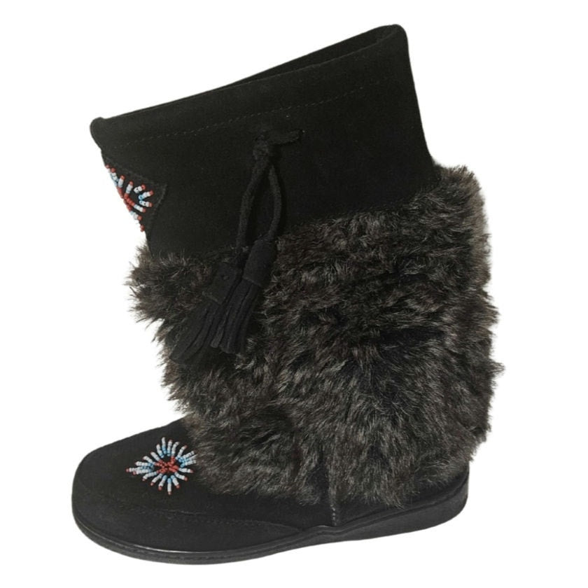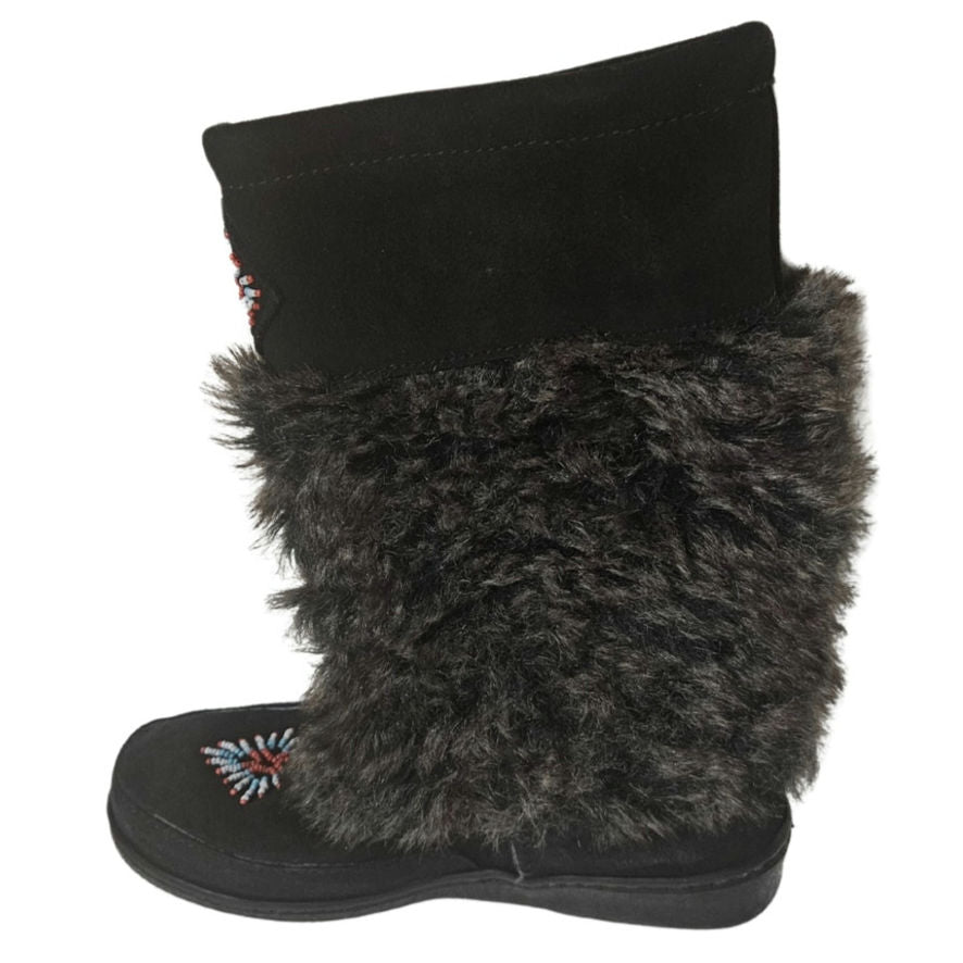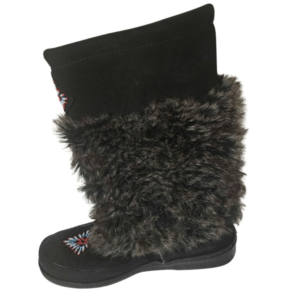 Minnetonka Women's Mukluk Bead Detail High Genuine Suede Leather Black Faux Fur Size 7 Womens