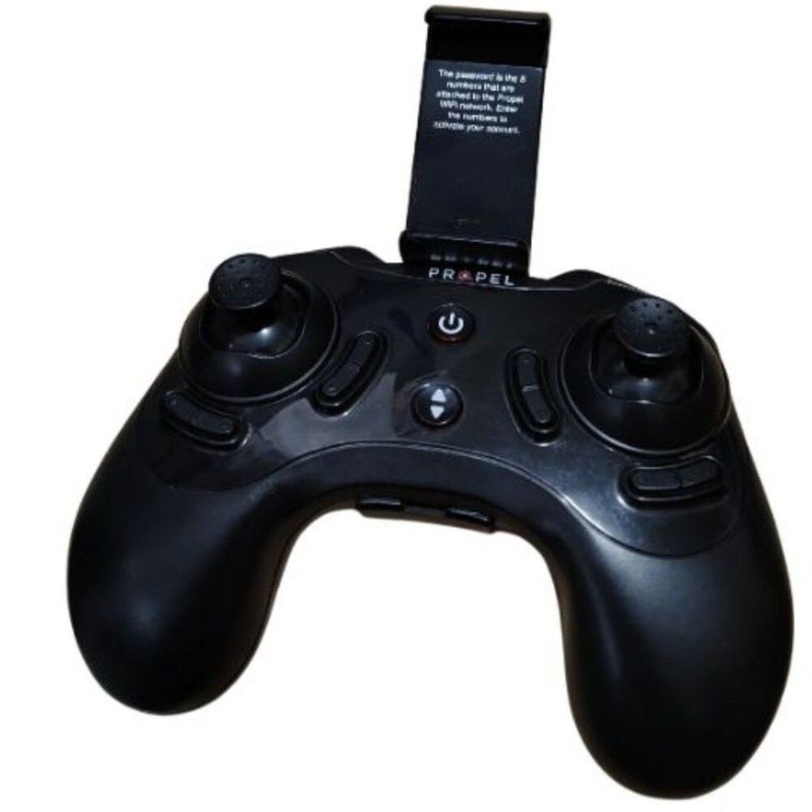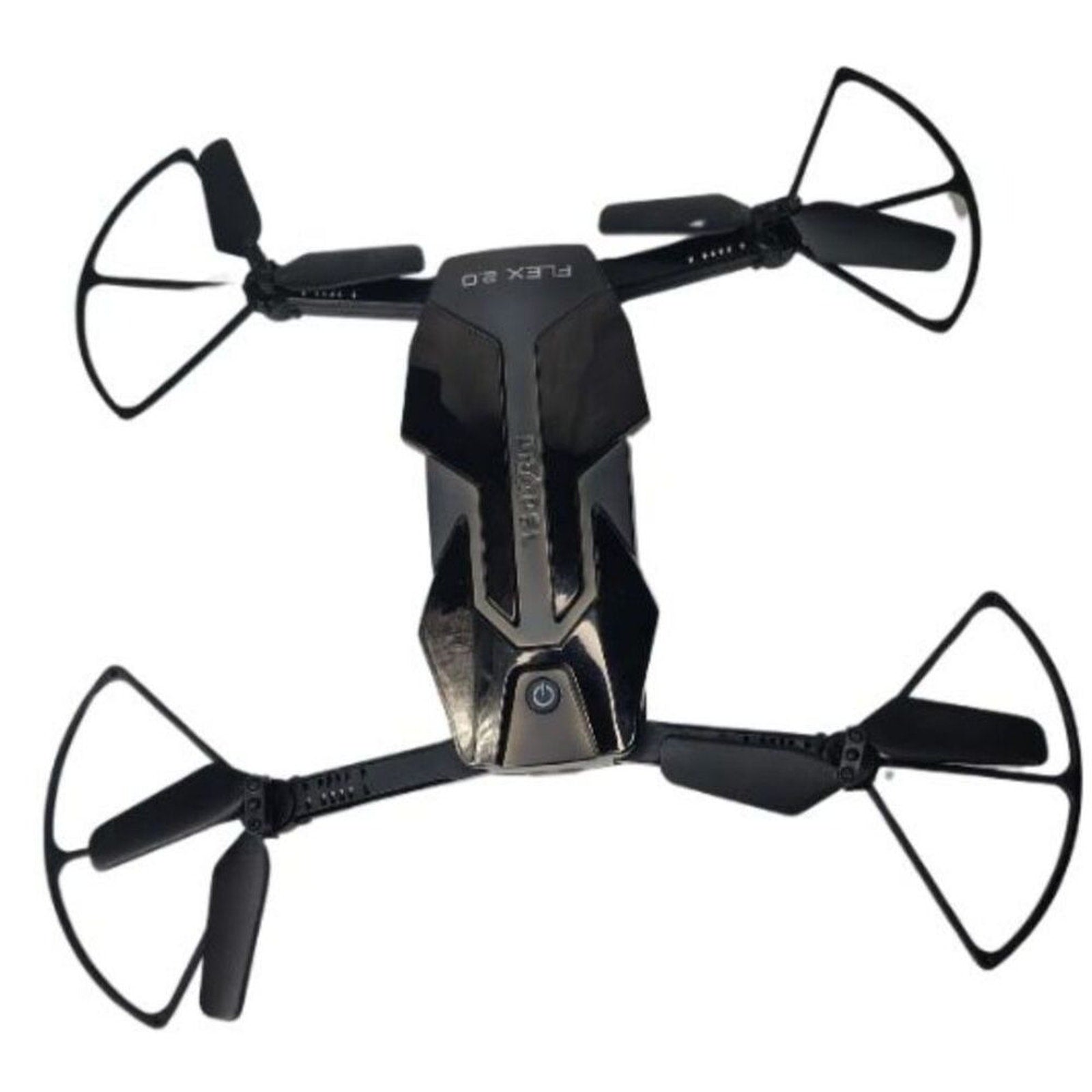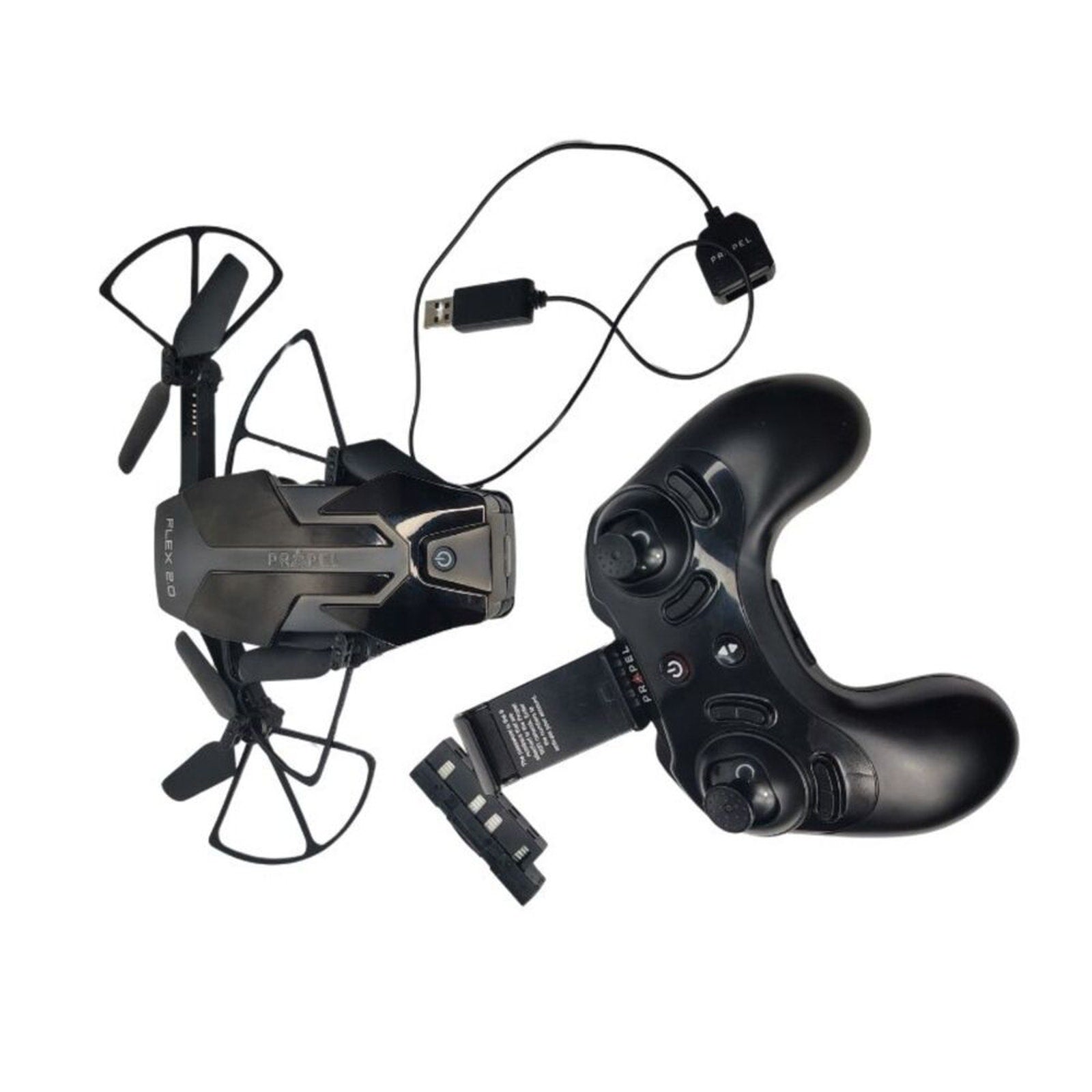 Propel Flex 2.0 Compact Folding Drone Quadcopter Black Barely Used HD Camera. Air pressure sensor locks for stable video footage. Take video and still shots with onboard HD camera (720P). Six Axis Gyro for extremely stable flight and maneuverability. Three speed settings for beginner to more advanced pilots. Wide range digital radio allow flight range up to 300 feet. This drone has the added (normally sold separately) propellers so it won't fold down until they are removed.