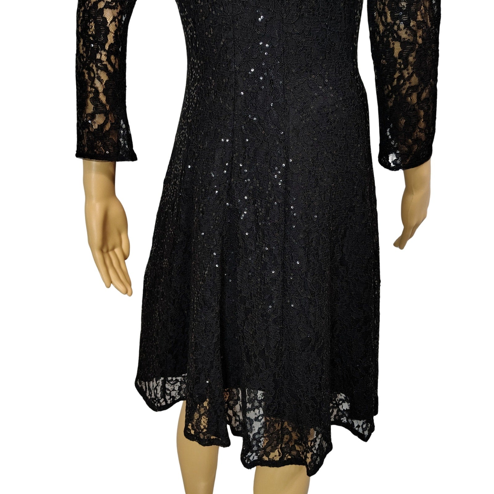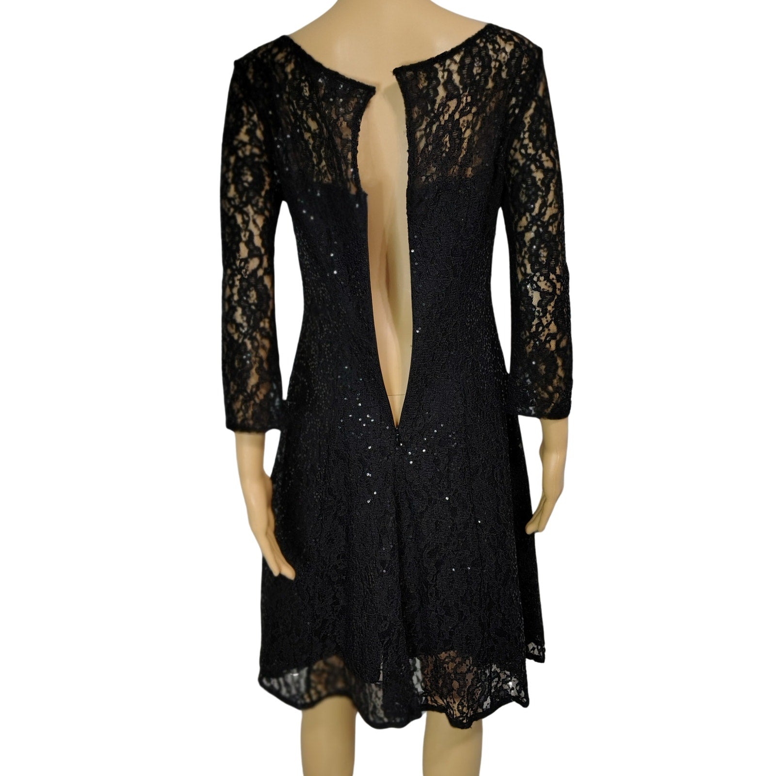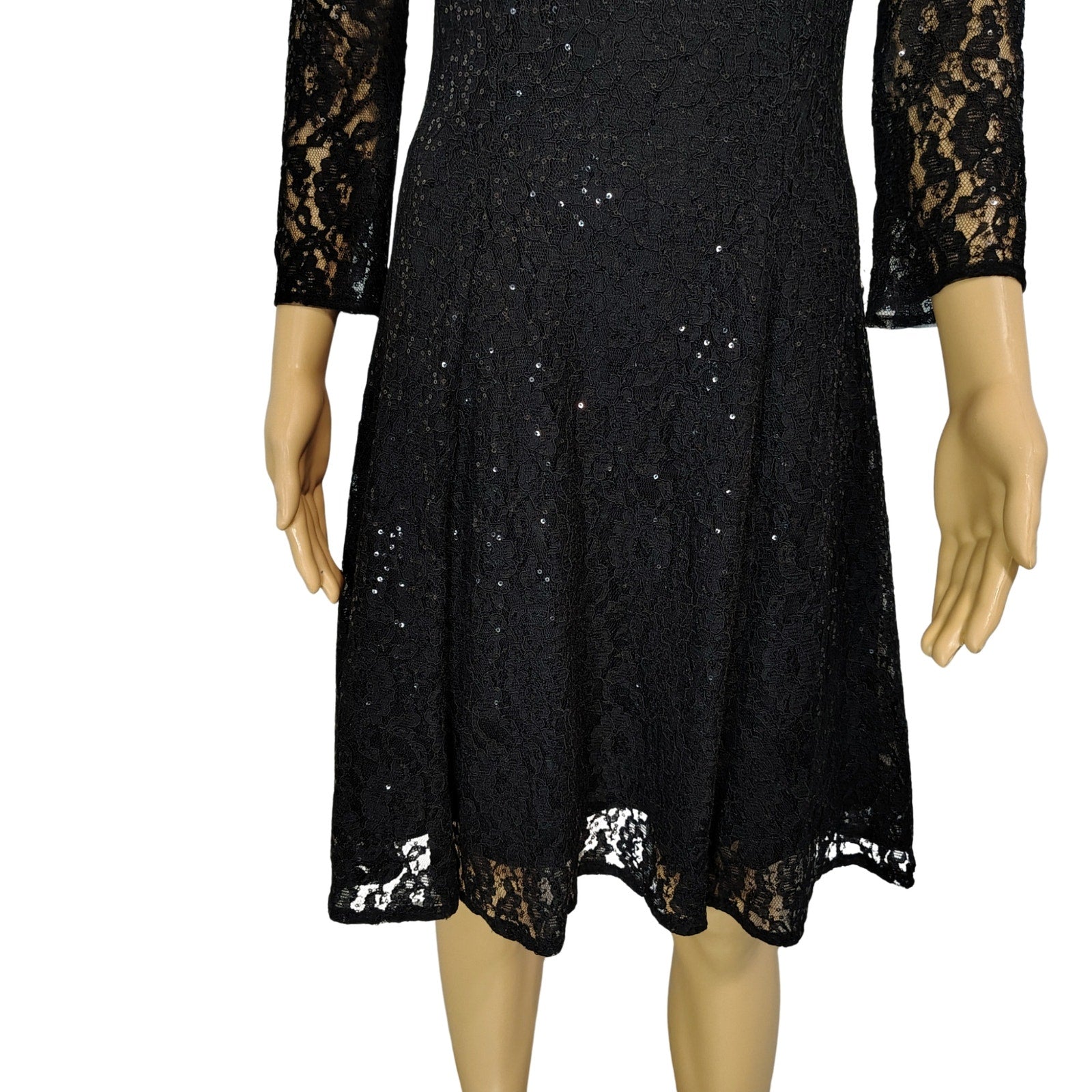 SLNY Black Sequined Lace Back Keyhole Fit Flare Long Sleeves Knee Length Dress Illusion Square Neckline Size 8
