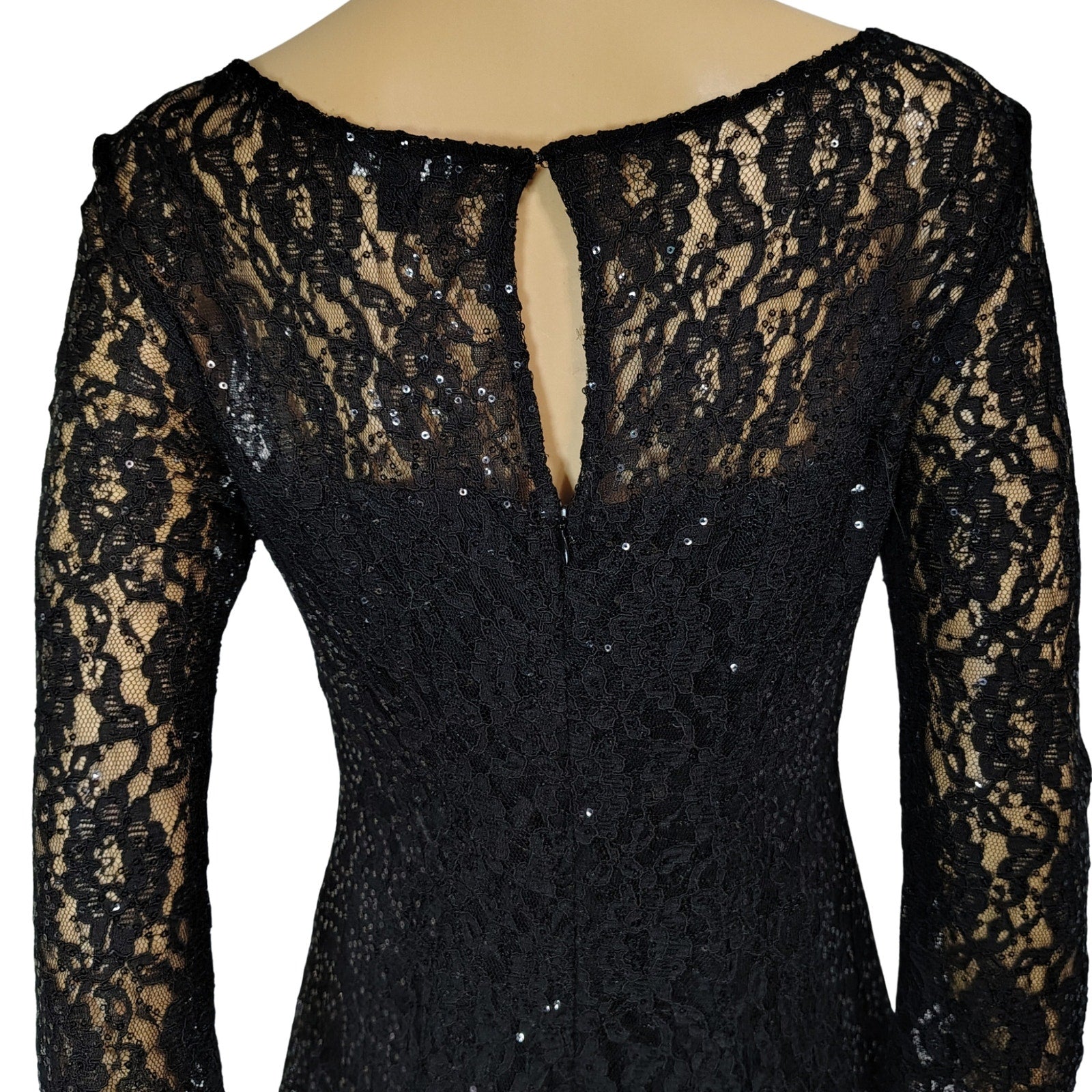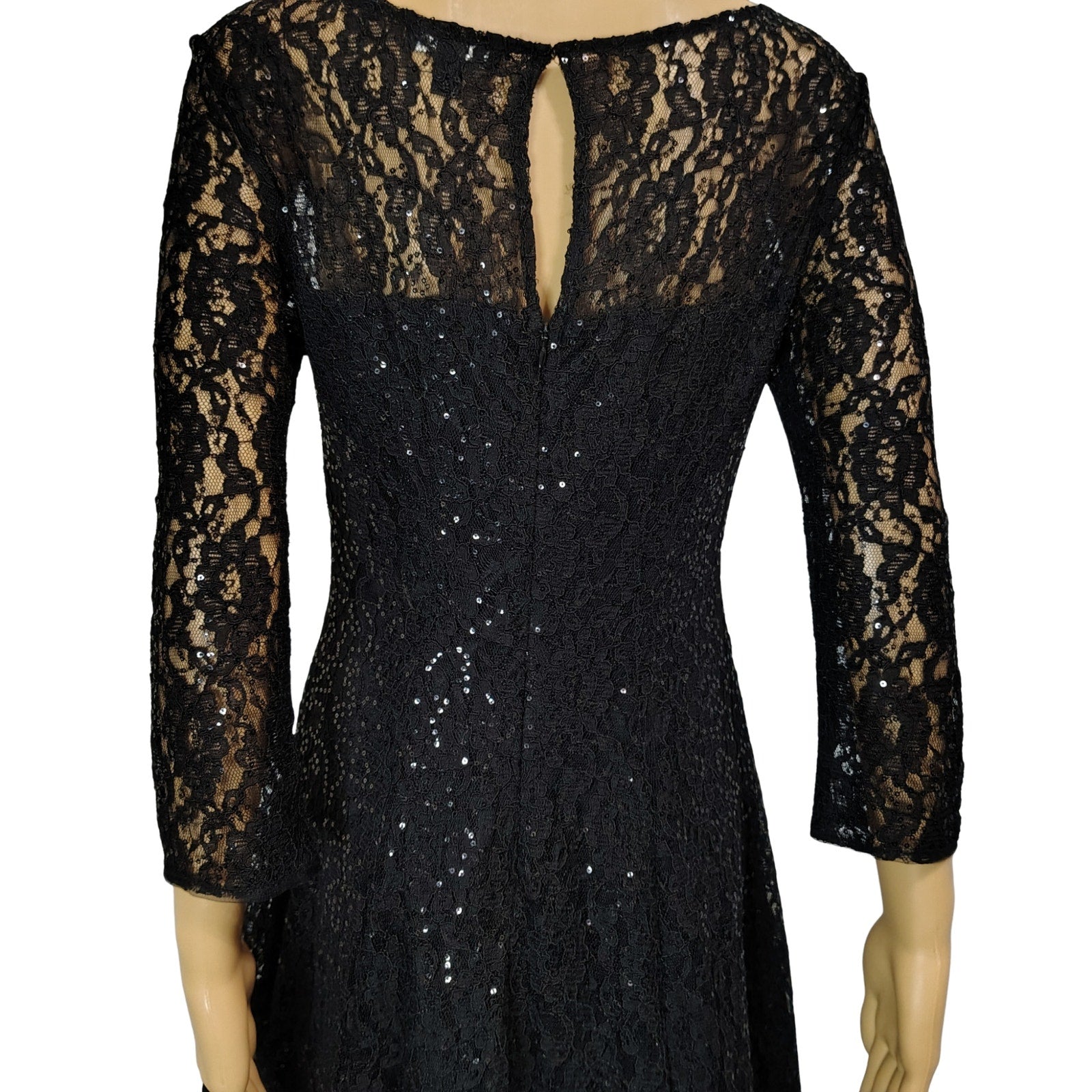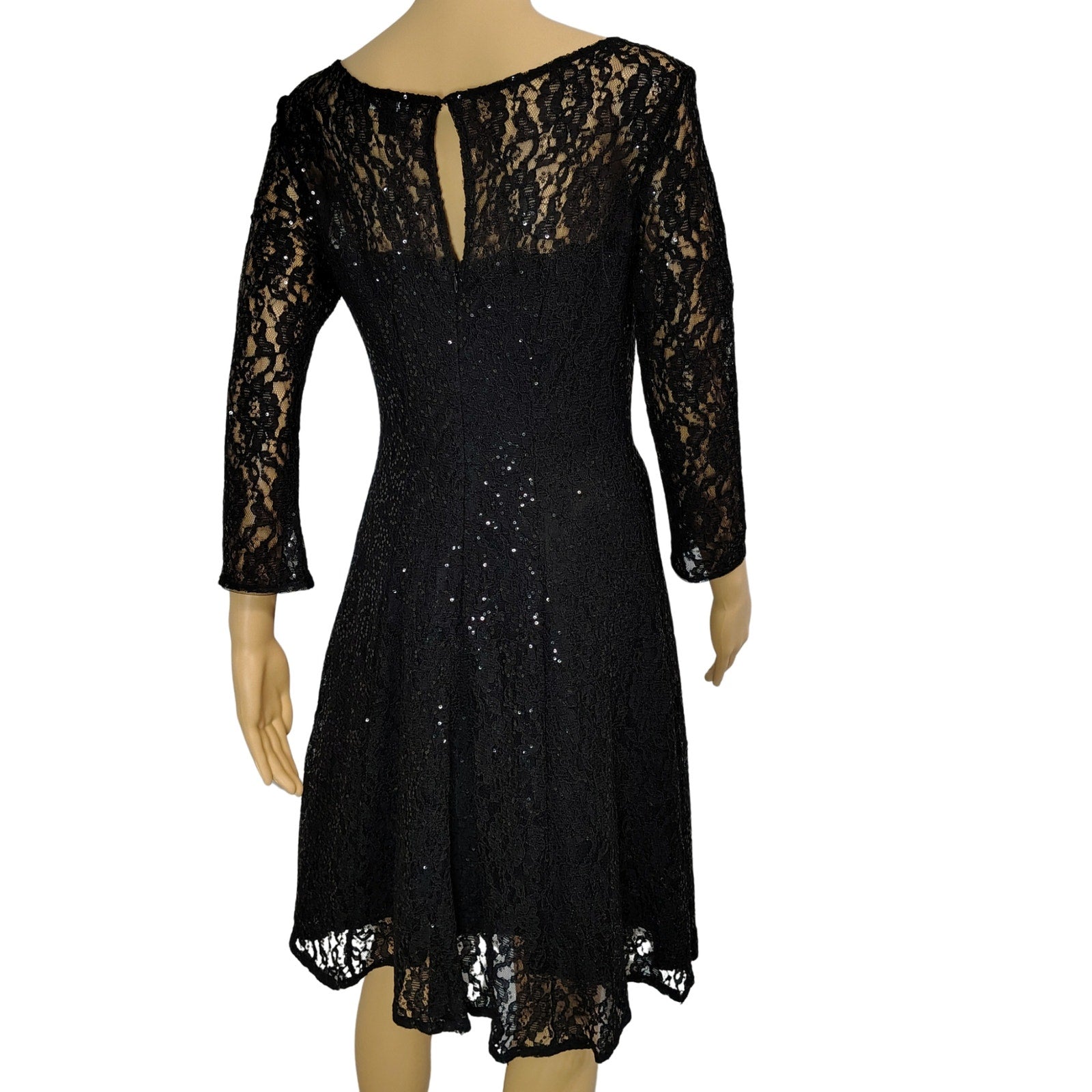 SLNY Black Sequined Lace Back 6" Keyhole Fit Flare Long Sleeves Knee Length Dress. Illusion square neckline. Allover stretchy sequined lace. Hidden back zipper with hook-and-eye closure, back keyhole hook-and-eye closure. Illusion long sleeves. Petticoat affixed to lining.