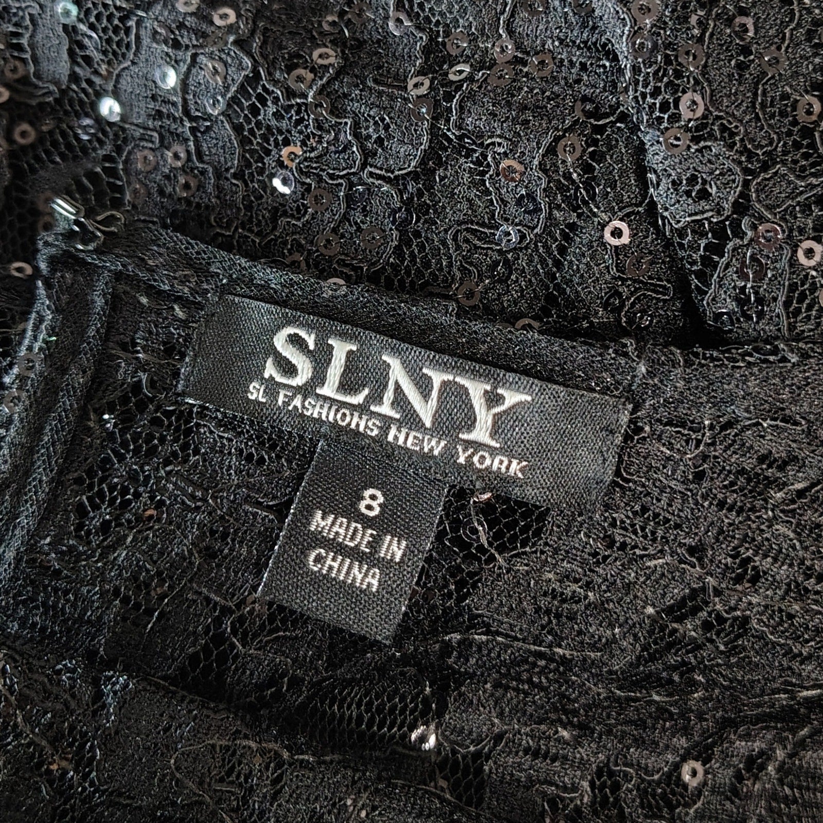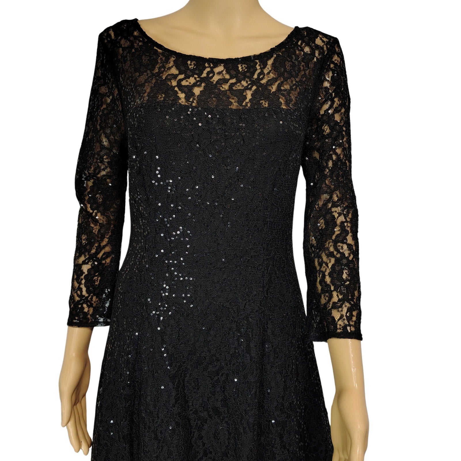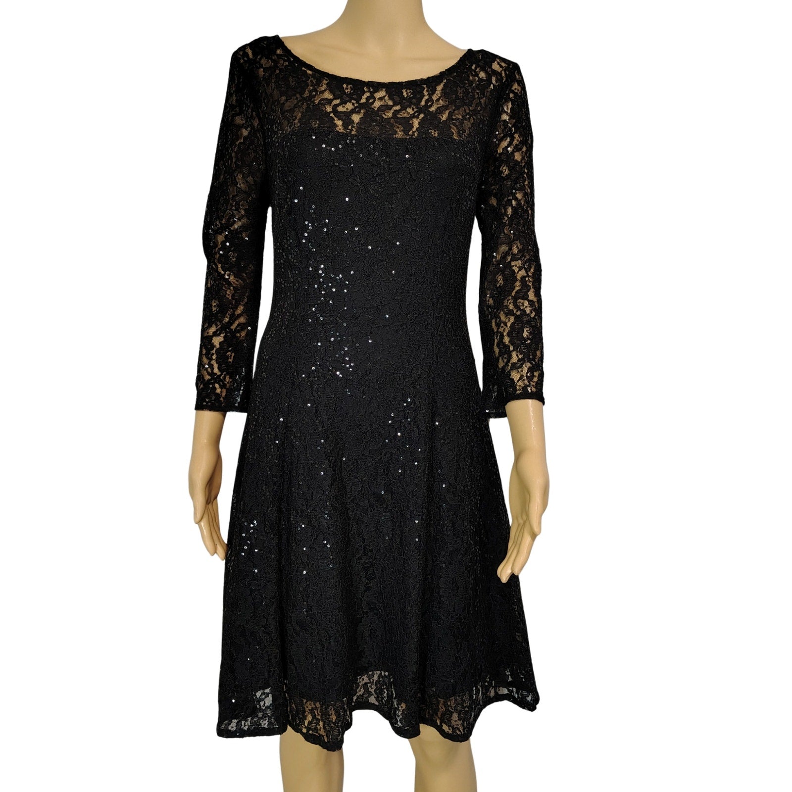SLNY Black Sequined Lace Back 6" Keyhole Fit Flare Long Sleeves Knee Length Dress. Illusion square neckline. Allover stretchy sequined lace. Hidden back zipper with hook-and-eye closure, back keyhole hook-and-eye closure. Illusion long sleeves. Petticoat affixed to lining.