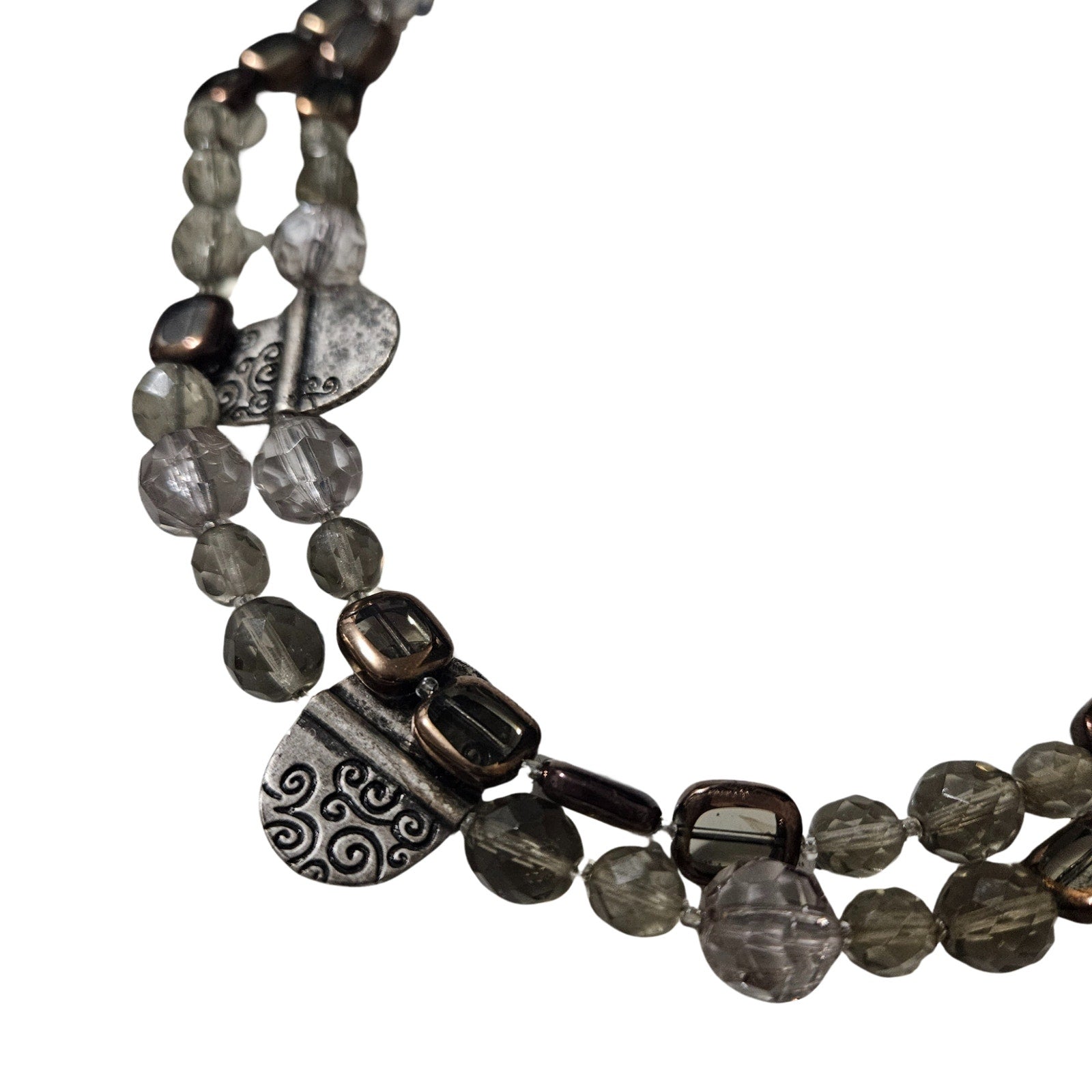 Smoky Bronze Clear Glass Double Strand Multi-Size Beaded Choker Necklace Silver Charms. Wolf head charm on necklace extender. Bronze square glass beads. Faceted round smoky beads. Engraved metal beads.